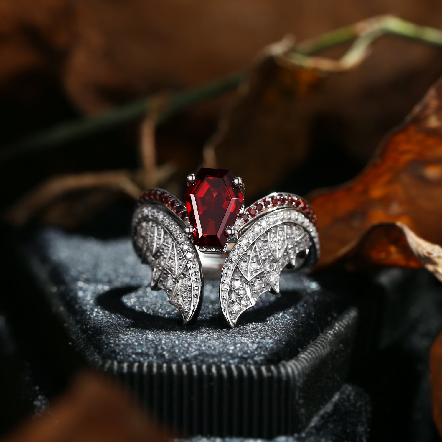 Coffin Cut Garnet Vintage White Gold Bridal Set 2pcs - Bat Ring