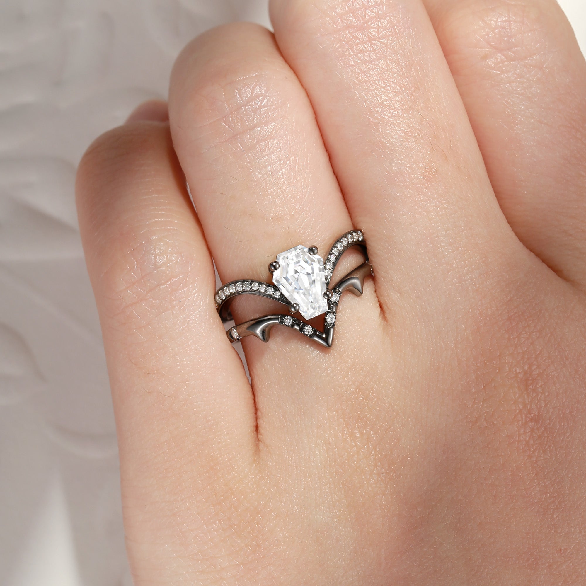 Coffin Cut Moissanite Spooky Engagement Ring Set 2pcs - Dainty Bat Ring