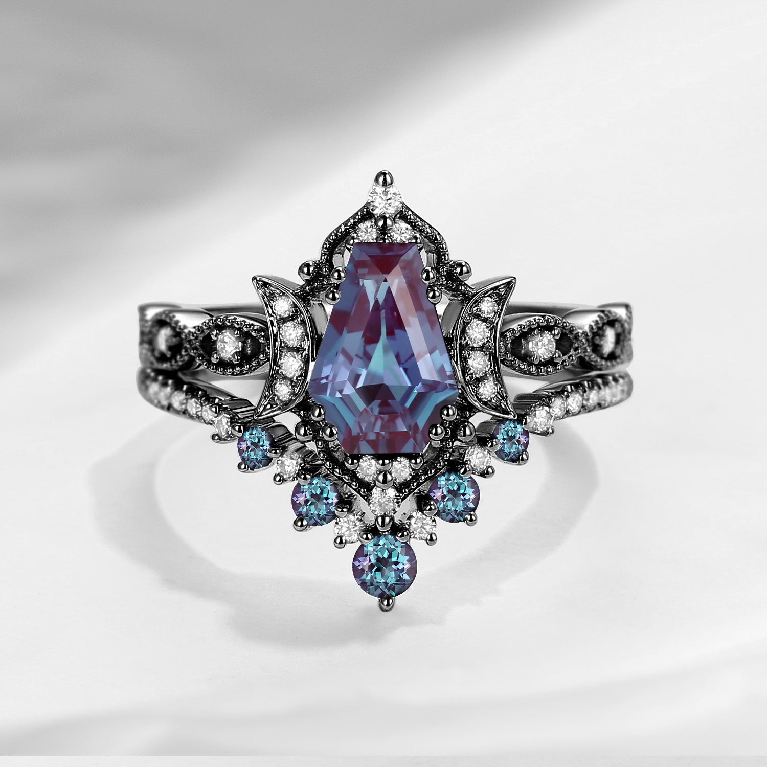 • Design - Two delicately detailed crescent moons around the unique coffin-cut stone, with vintage inspired clustered milgrain band. Truly one-of-a-kind.