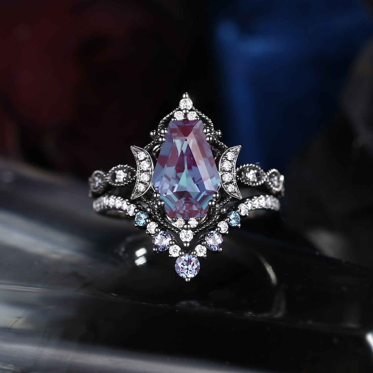 Crescent Moon | Coffin Cut Lab Alexandrite 'Black Statement' Ring Set 2pcs