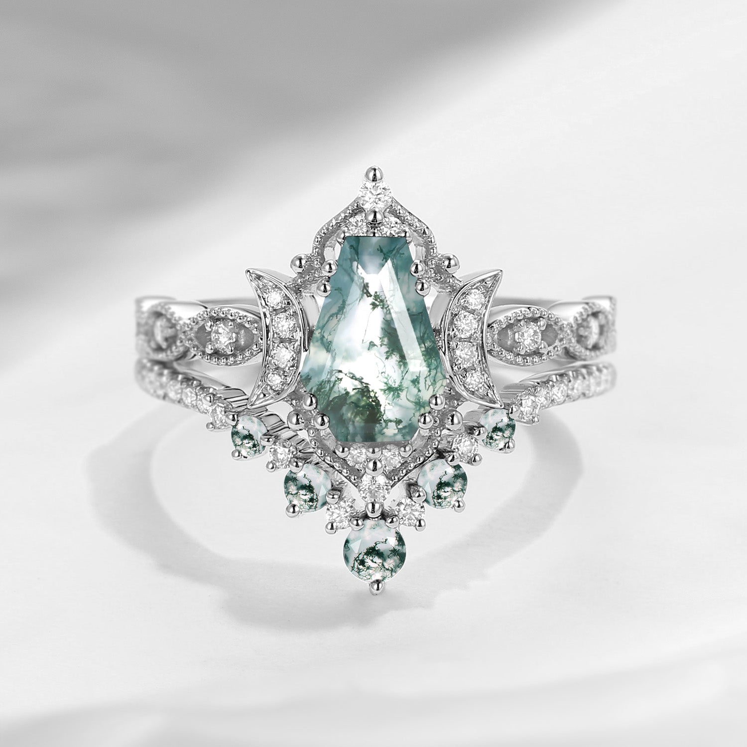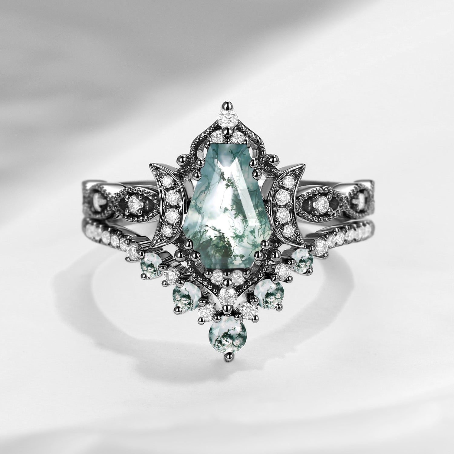 Crescent Moon | Coffin Cut Moss Agate 'Till Death Do Us Part' Ring Set 2pcs