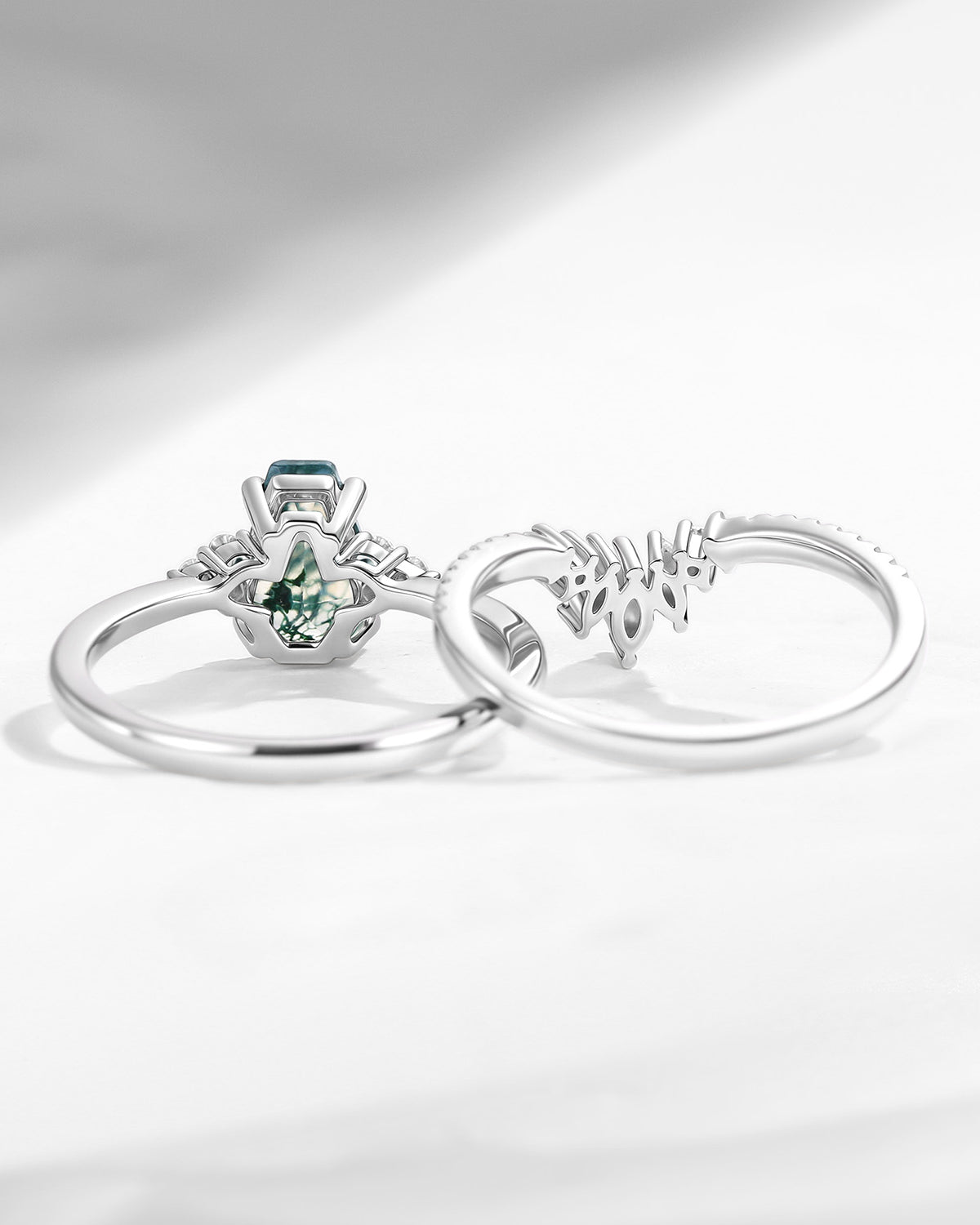 Classic Coffin Cut Moss Agate Engagement Set 2pcs - White Dress