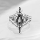 Crescent Moon | Coffin Cut Salt and Pepper Diamond Engagement Ring Set Vintage Diamond Wedding Ring Art Deco Bridal Set Unique Pear Diamond Anniversary Ring Set 3pcs