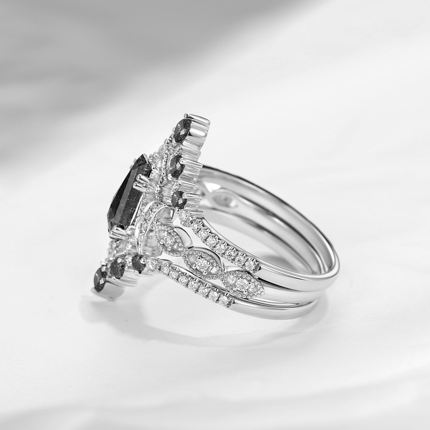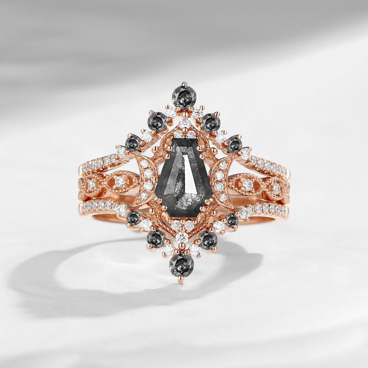 Coffin Salt And Pepper Diamond Crescent Engagement Ring 3pcs Moon Bridal Ring Vintage Engagement Ring Art Deco Vintage Till Death Do US Part