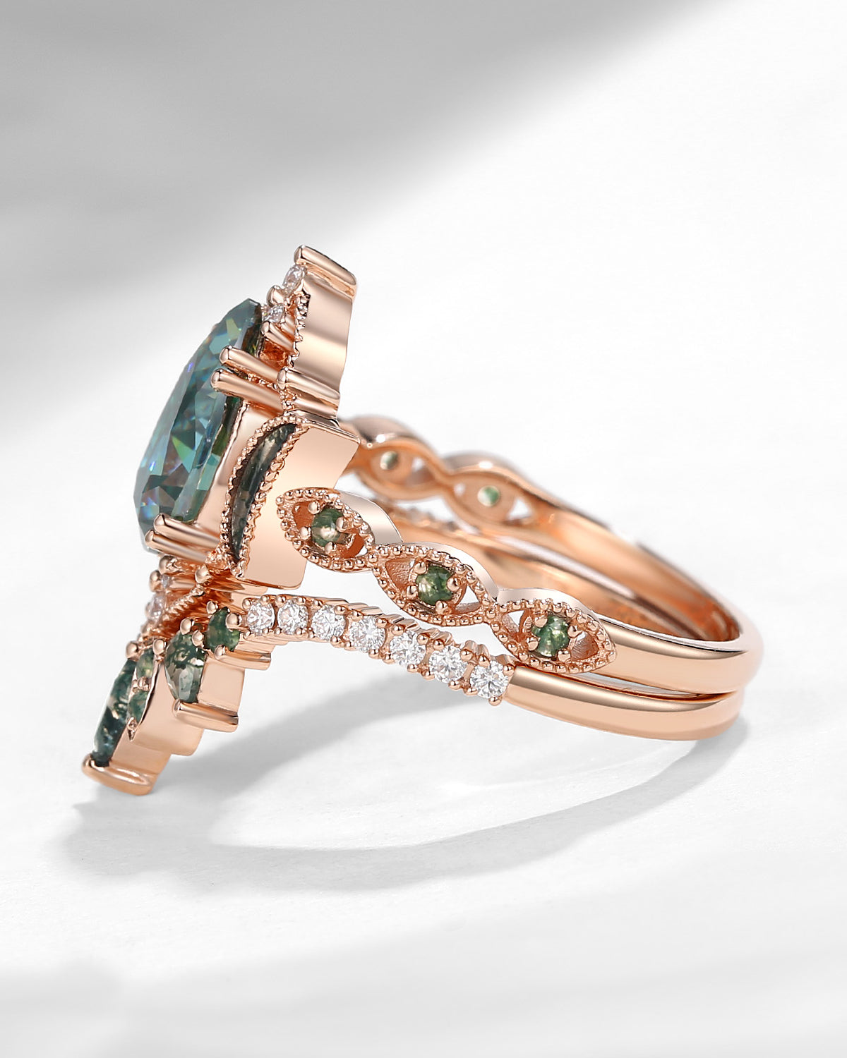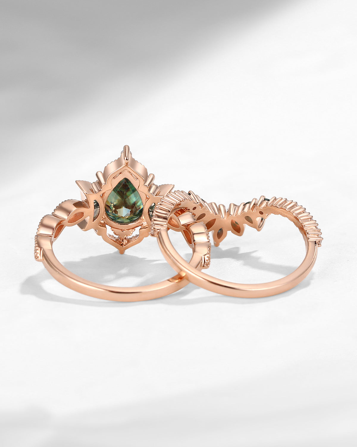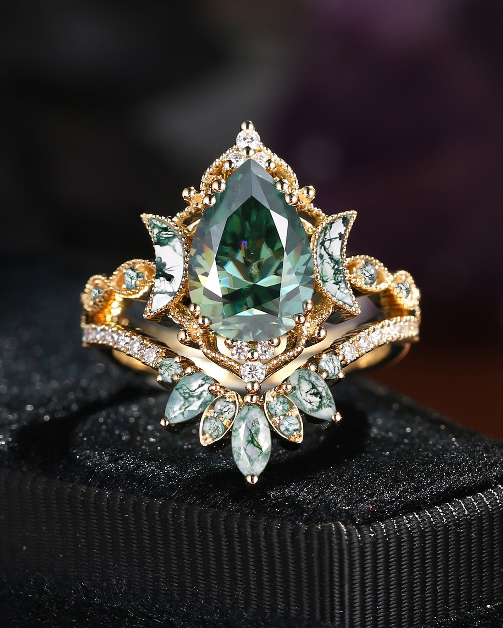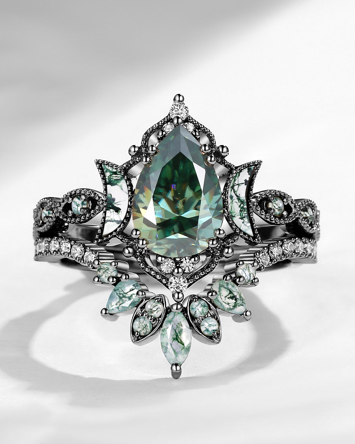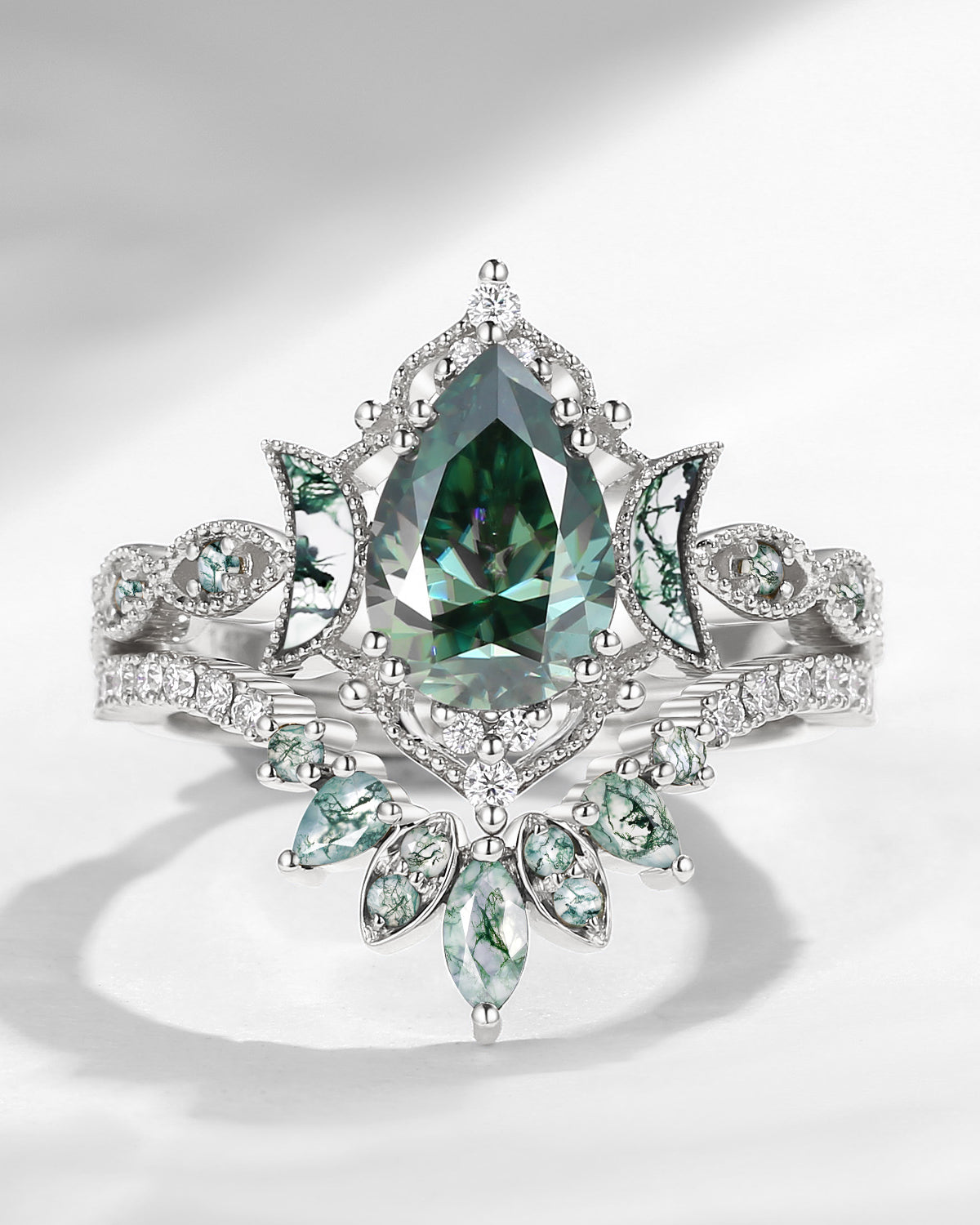 Crescent Moon | Pear Cut Green Moissanite 'Ultra Galaxy' Engagement Ring Set 2pcs