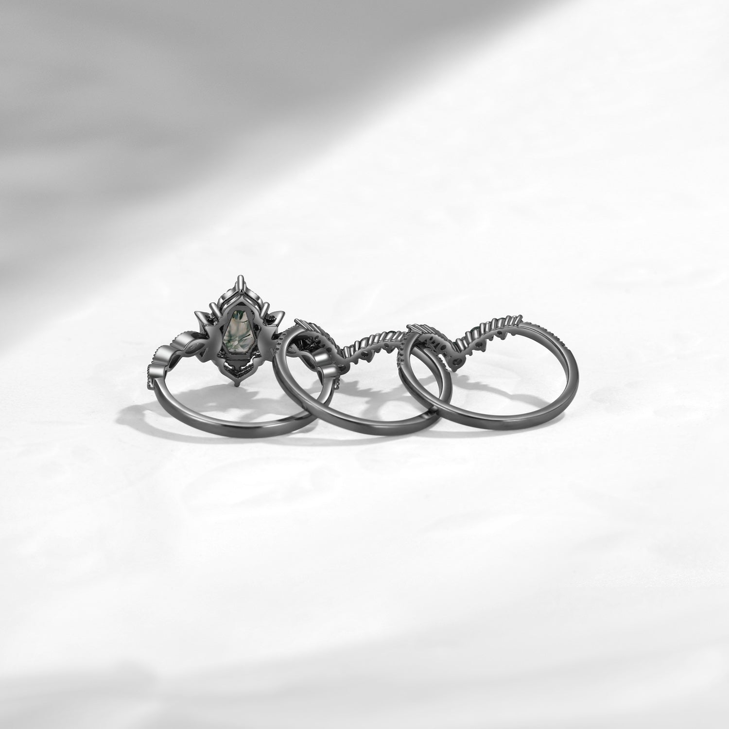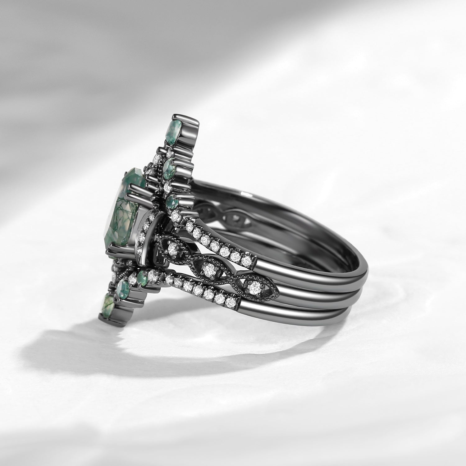 Crescent Moon | Coffin Moss Agate Black Gold Engagement Ring 3pcs 18k - Till Death Do Us Part