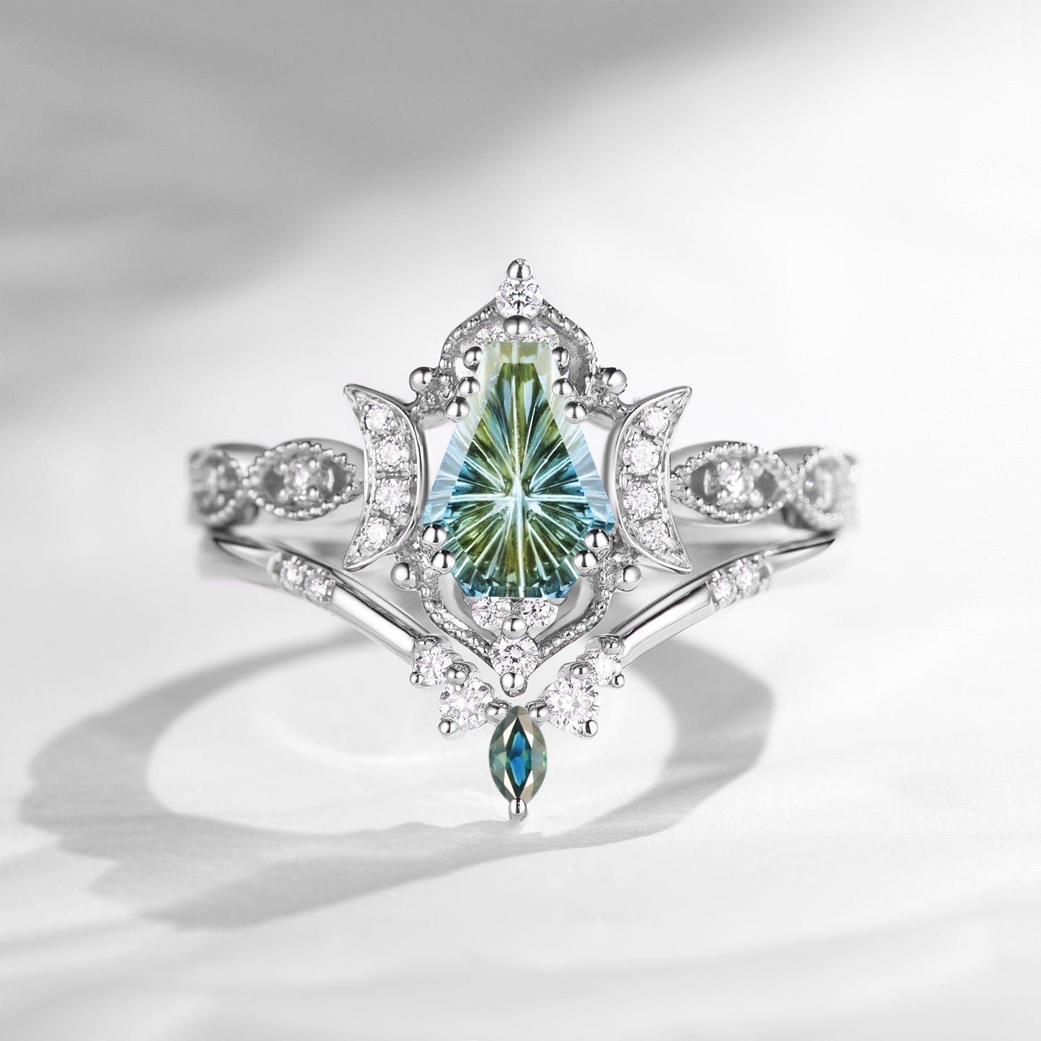 Crescent Moon | Fantasy Cut Coffin Shaped Natural Multi-Colored Sapphire Engagement Ring Set 2pcs - Luna