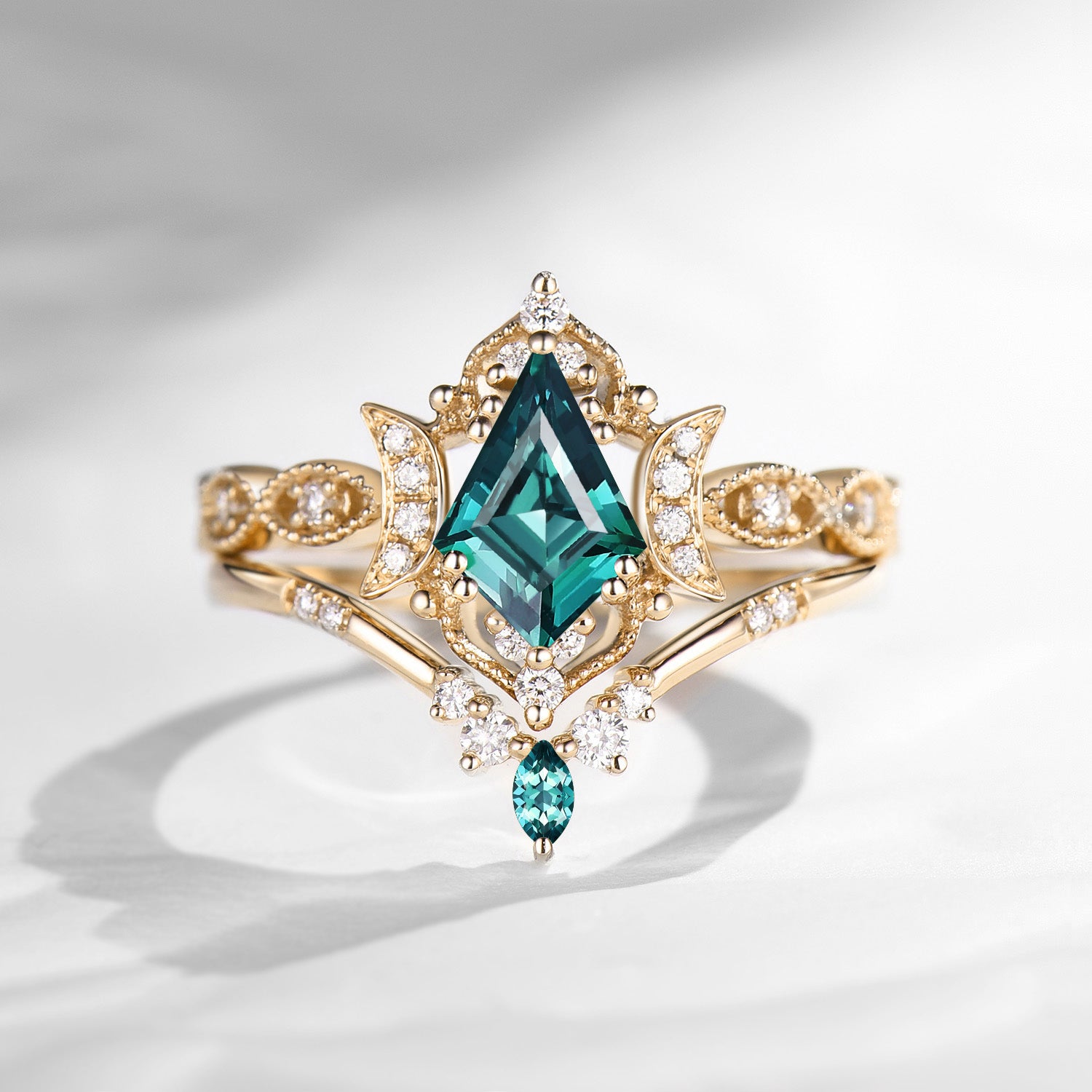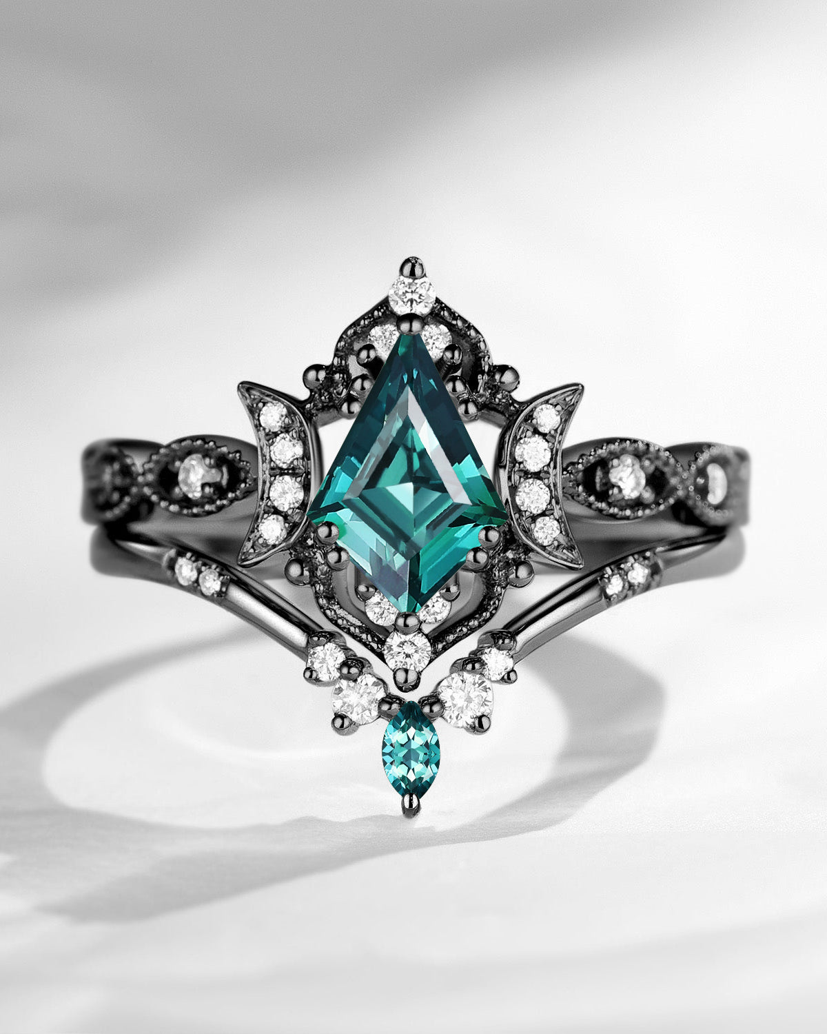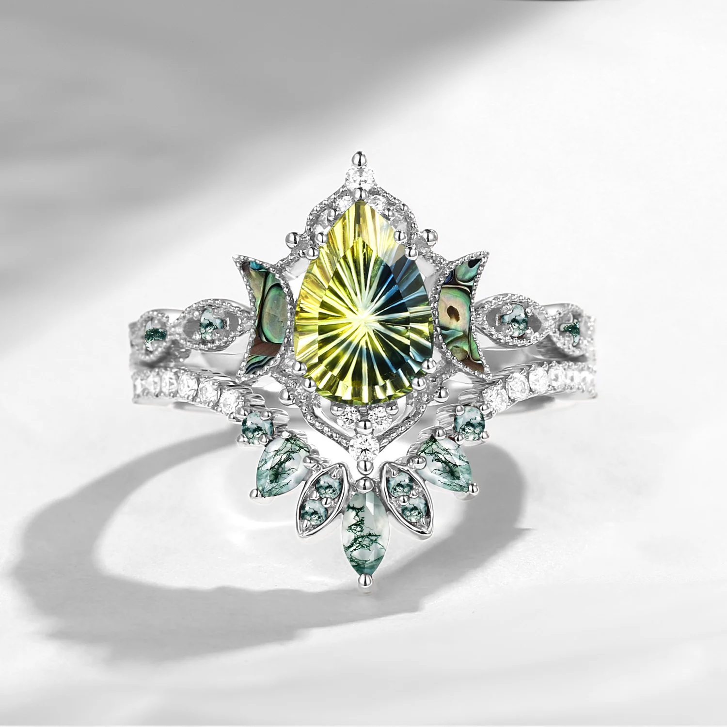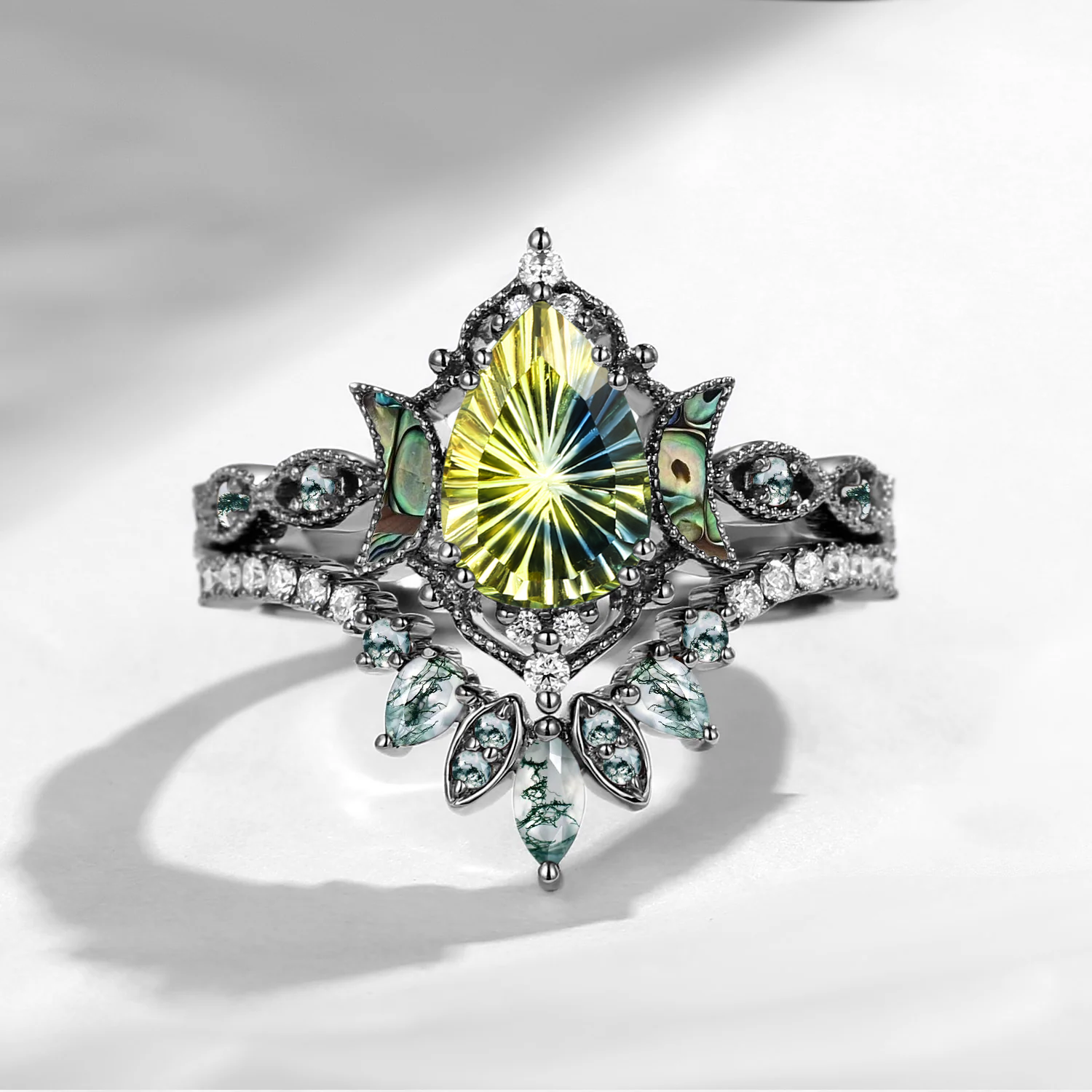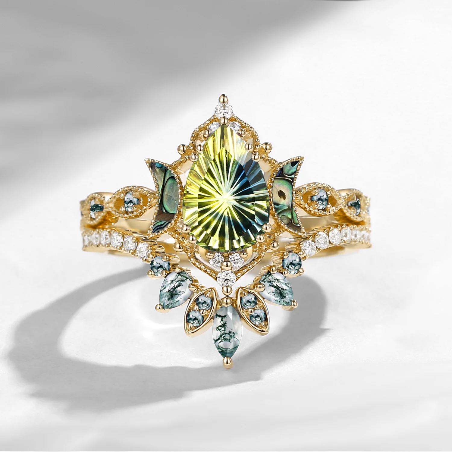 Crescent Moon | Fantasy Cut Pear Shaped Multi-Colored Sapphires 'Ultra Galaxy' Engagement Ring Set 2pcs