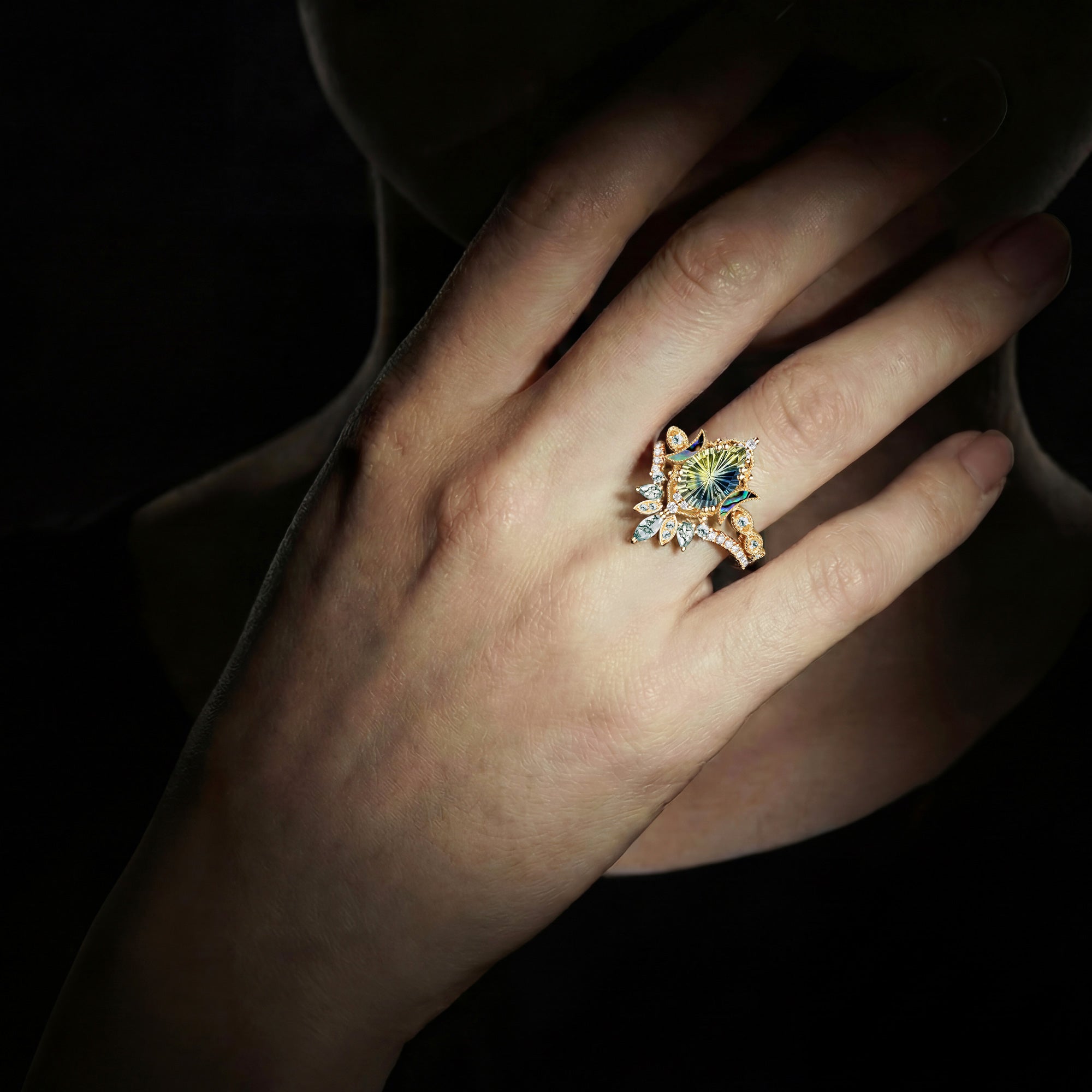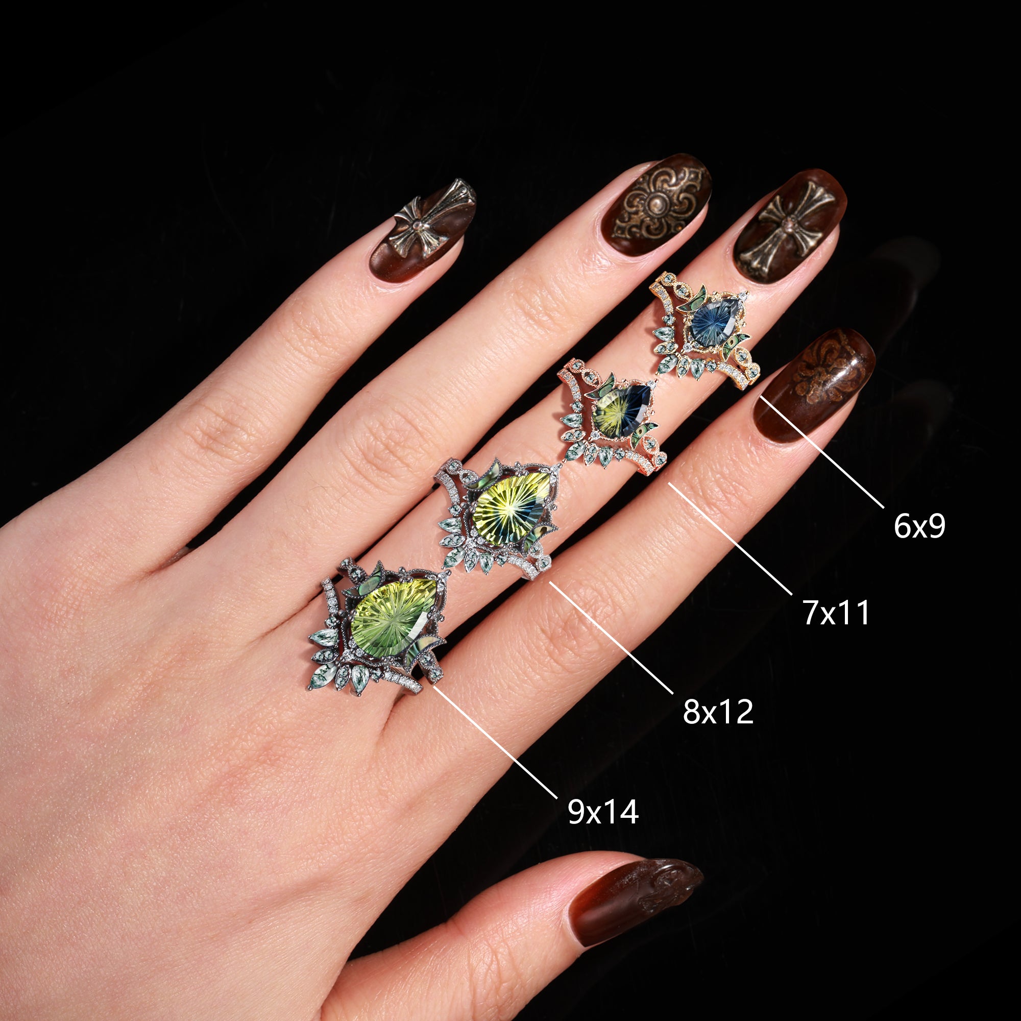 • Design - Two masterfully cut moon shaped gems guarding the center pear, clustered by little sparkly accents, mimicking a galaxy-like setting. A romantic Sci-Fi fiction at its finest.