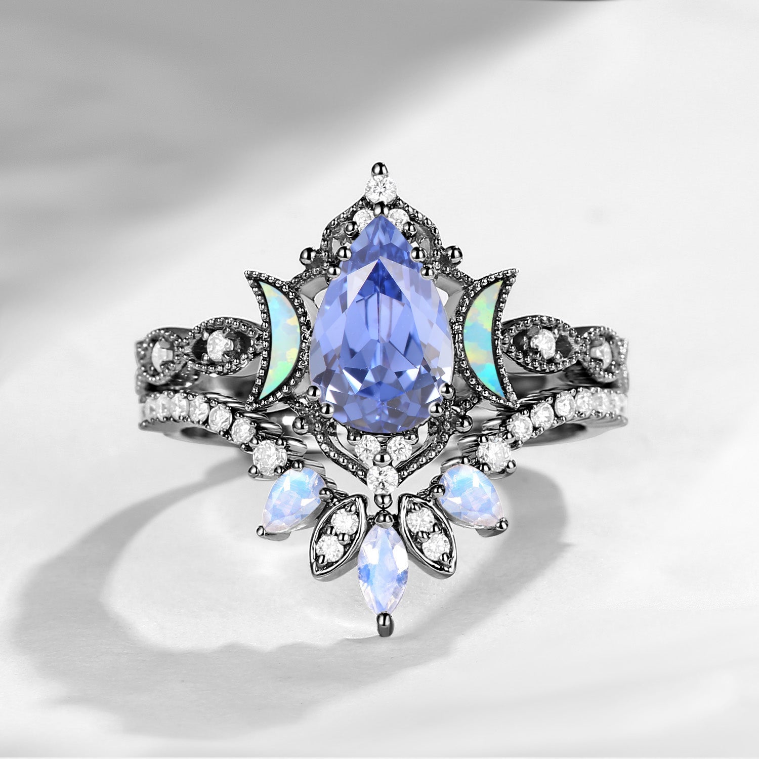 Crescent Moon | Firework Cut Pear Shaped Natural Aquamarine 'Ultra Galaxy' Black Gold Engagement Ring Set 2pcs