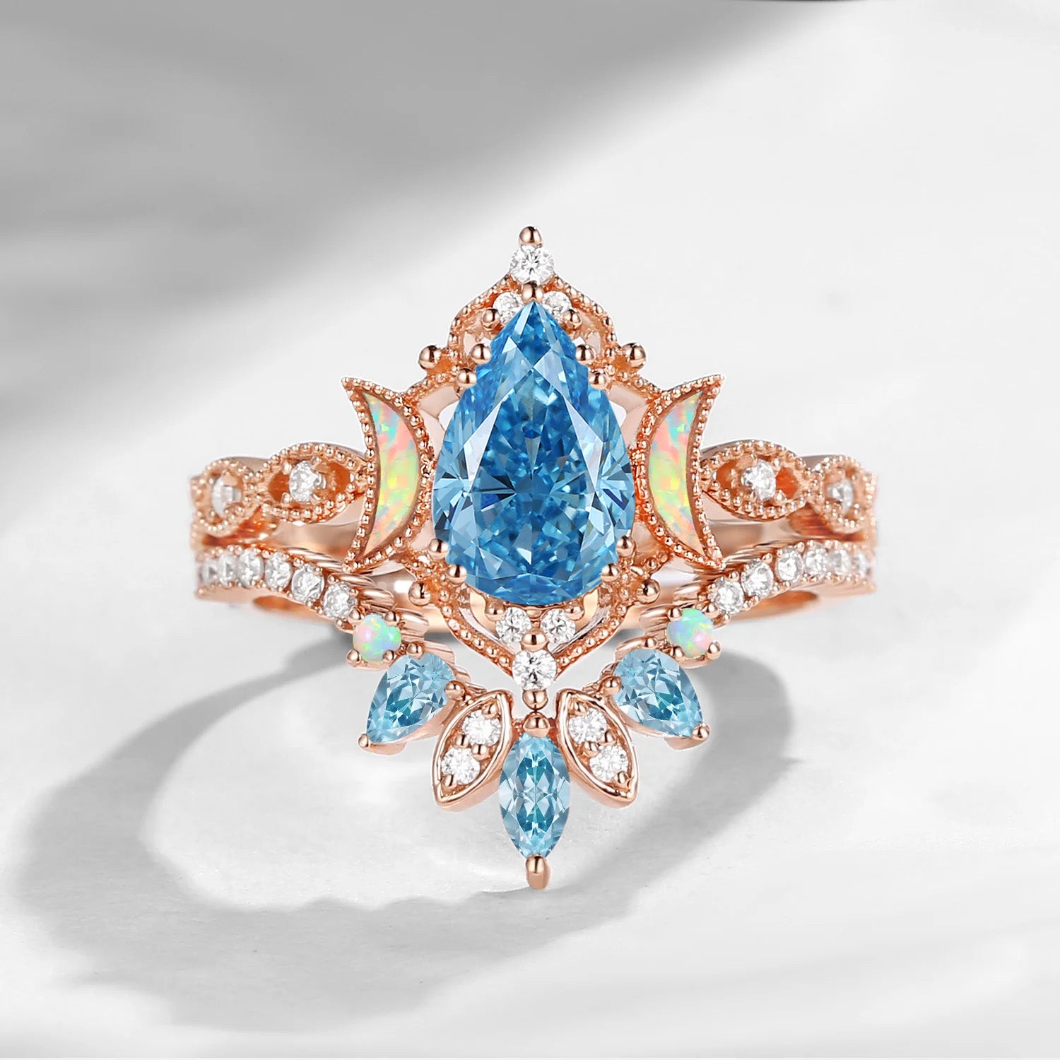 Pear Cut Blue Lab Diamond Engagement Ring Vintage Style Cluster Moon Wedding Ring Set 2pcs