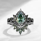 Crescent Moon | Pear Cut Green Moissanite 'Ultra Galaxy' Black Gold Engagement Ring Set 2pcs