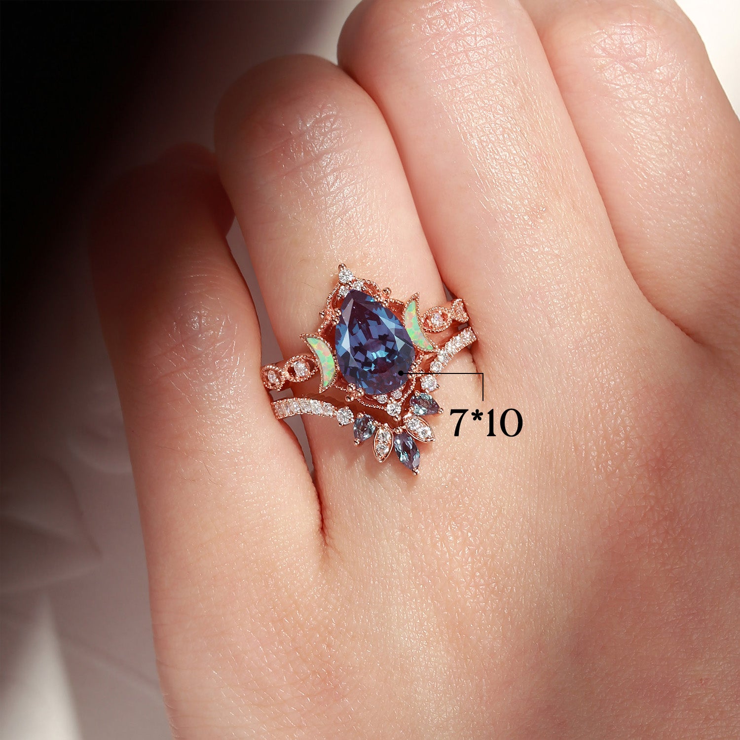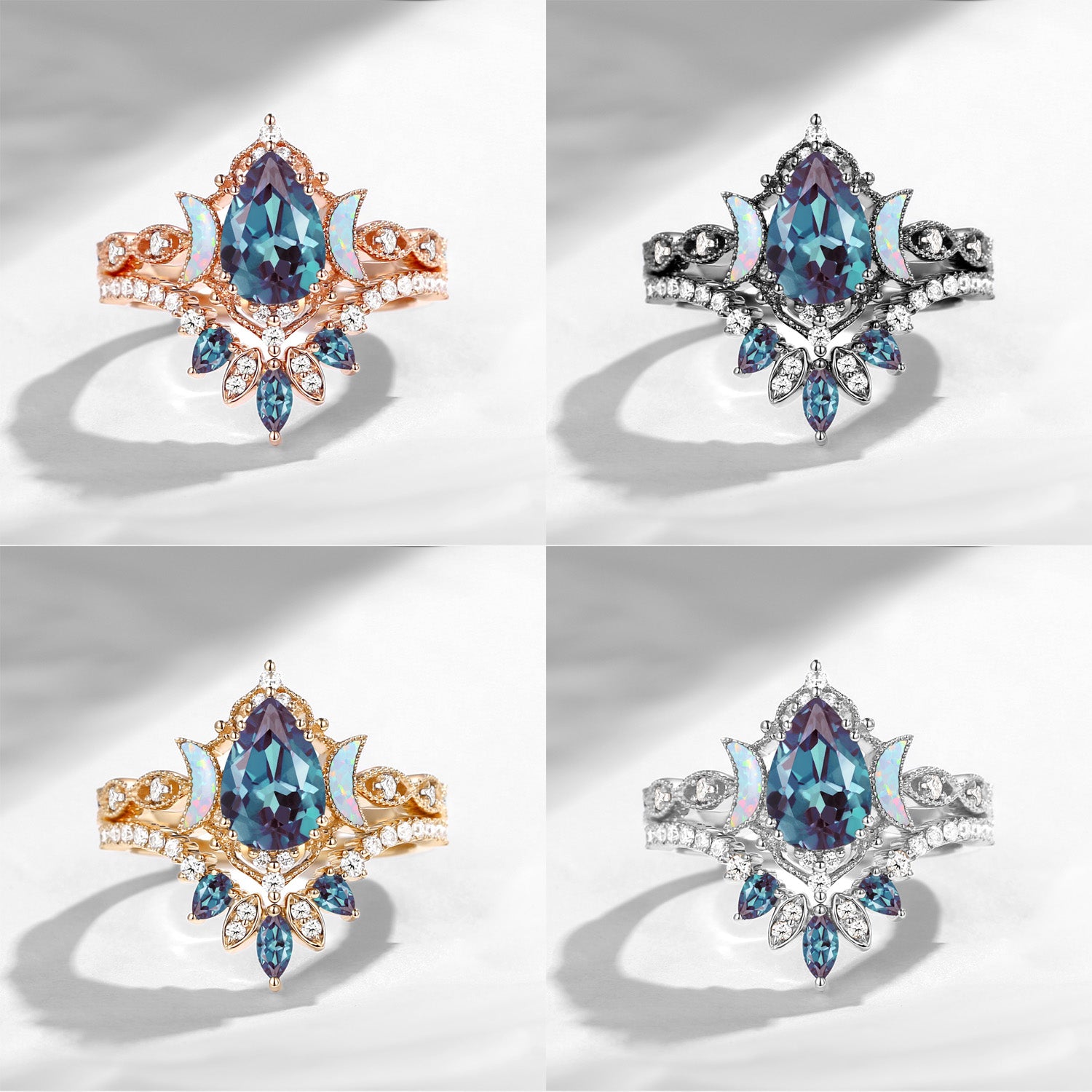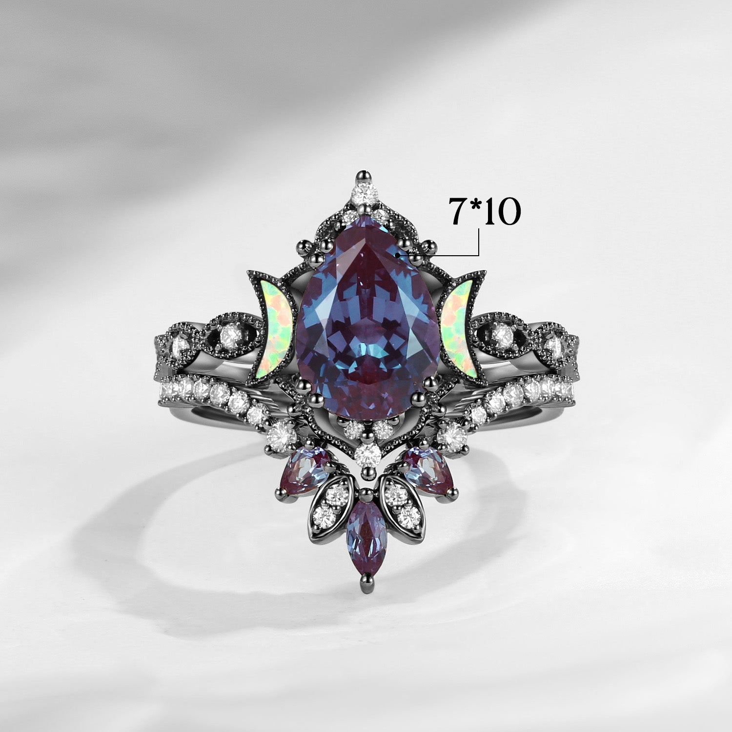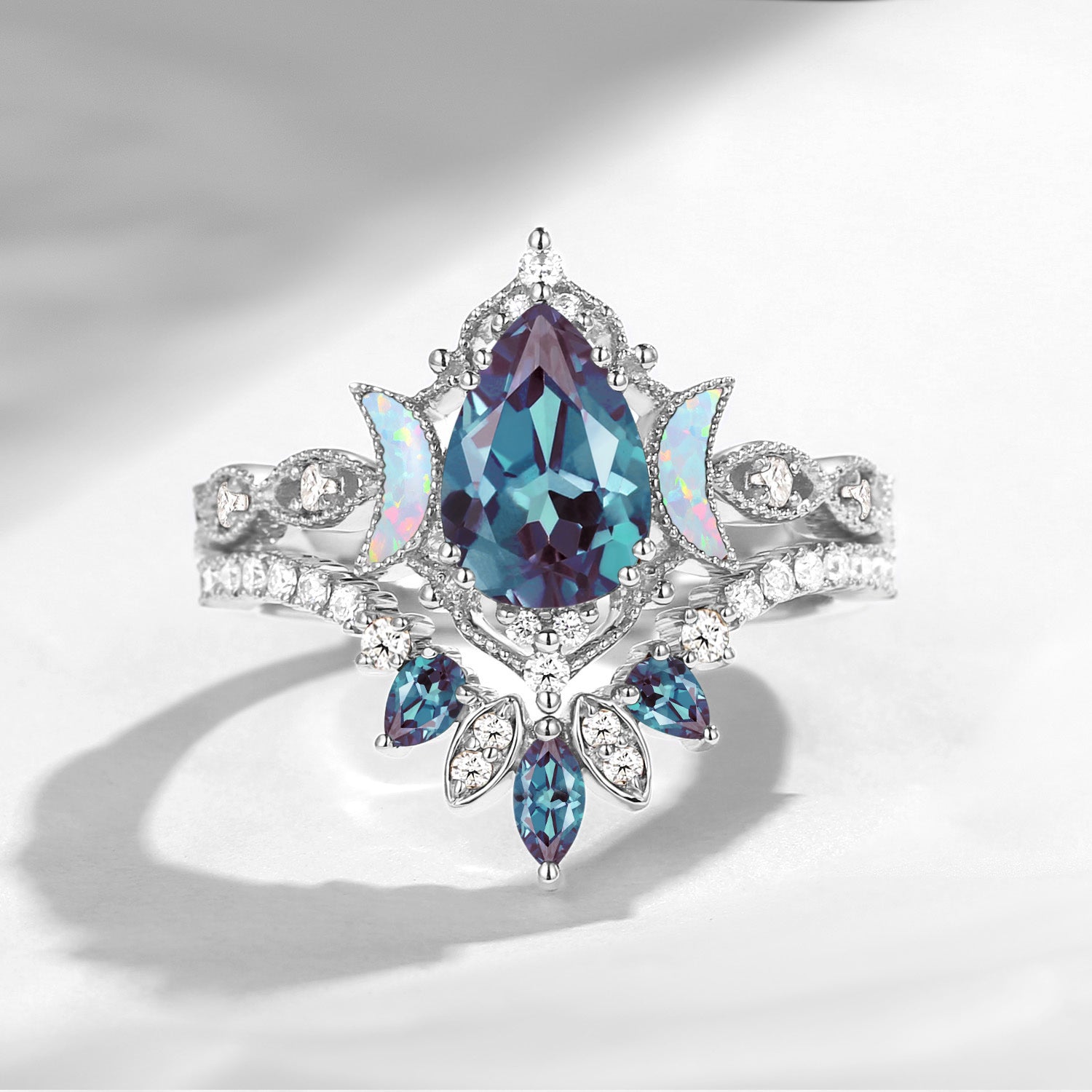 Crescent Moon | Pear Cut Lab Alexandrite 'Ultra Galaxy' Engagement Ring Set 2pcs