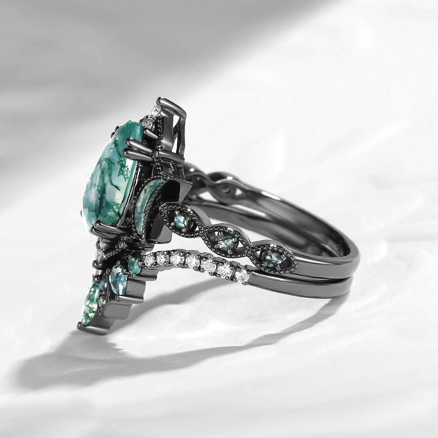 Crescent Moon | Pear Cut Moss Agate 'Ultra Galaxy' Black Gold Engagement Ring Set 2pcs