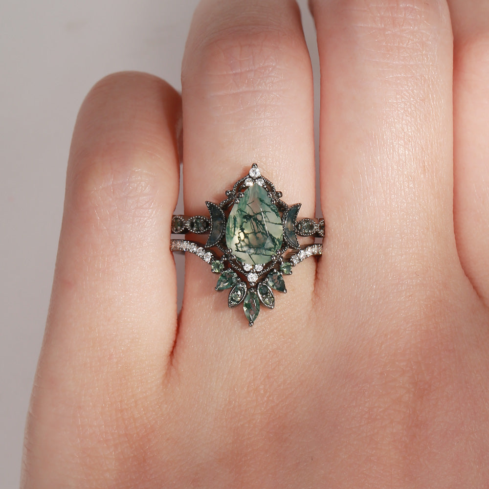Crescent Moon | Unique Pear Shape Moss Agate Engagement Ring Set 2pcs - Luna