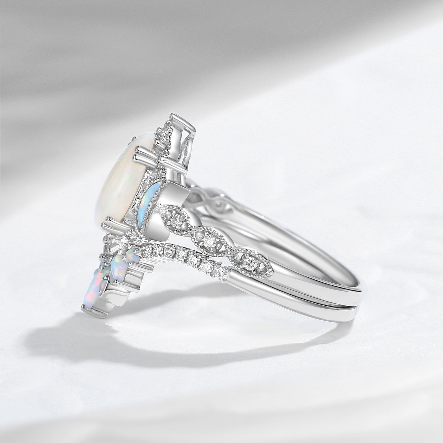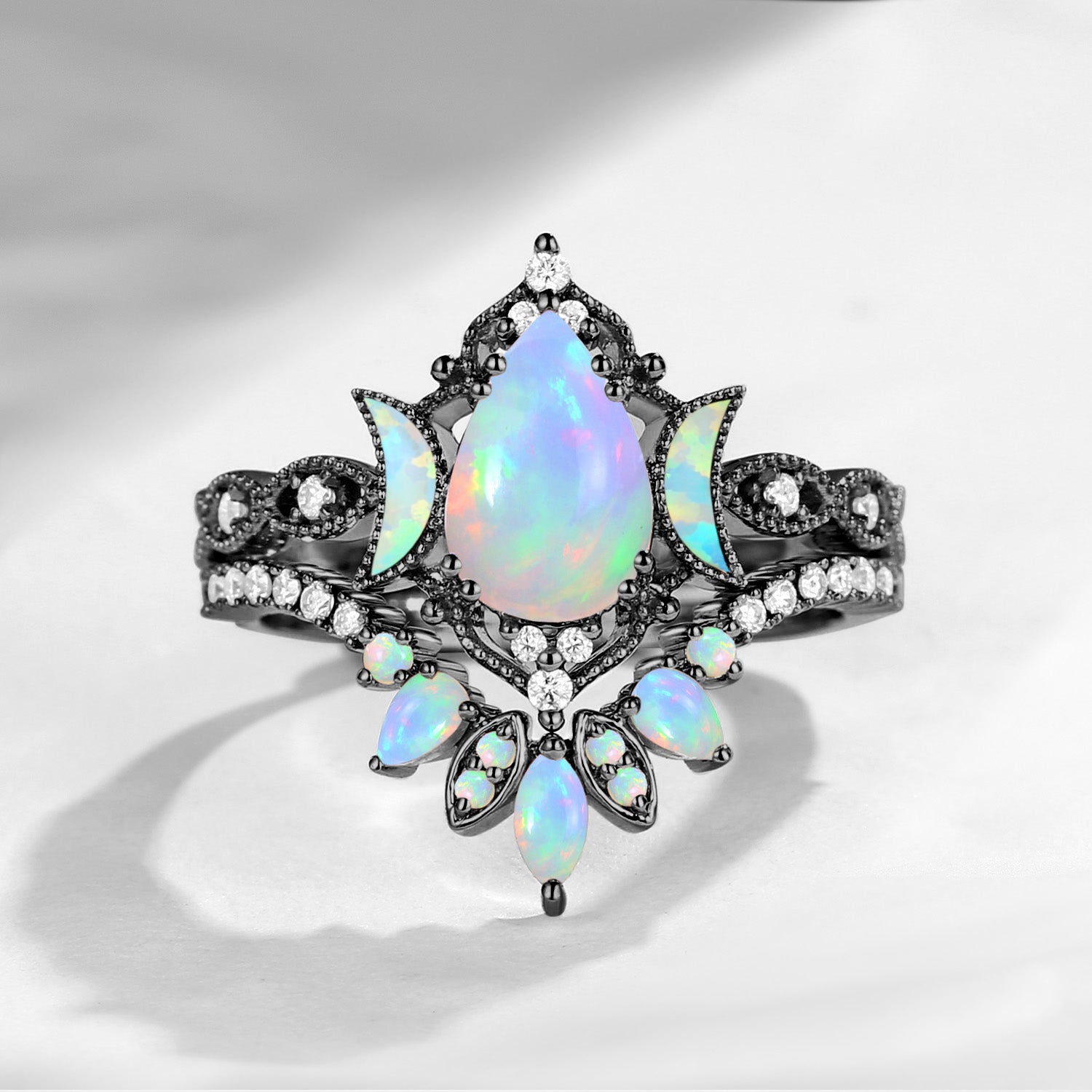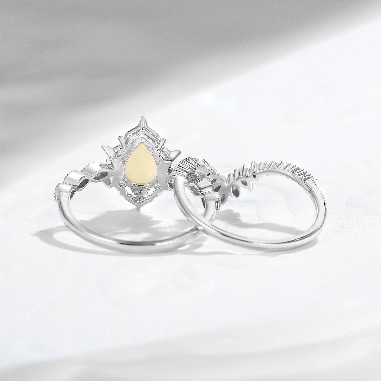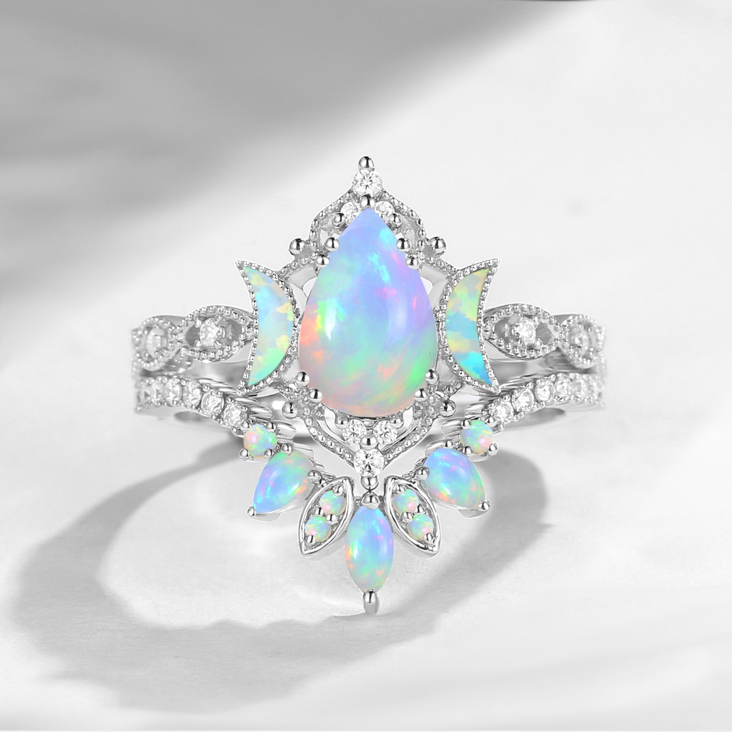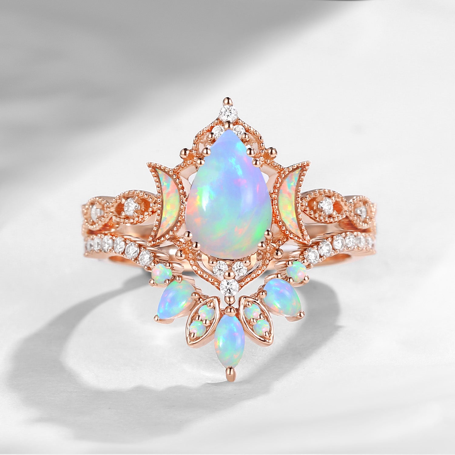 Pear Cut Natural Opal Engagement Ring Infinity Ring Vintage Style Cluster Moon Wedding Ring Set 2pcs