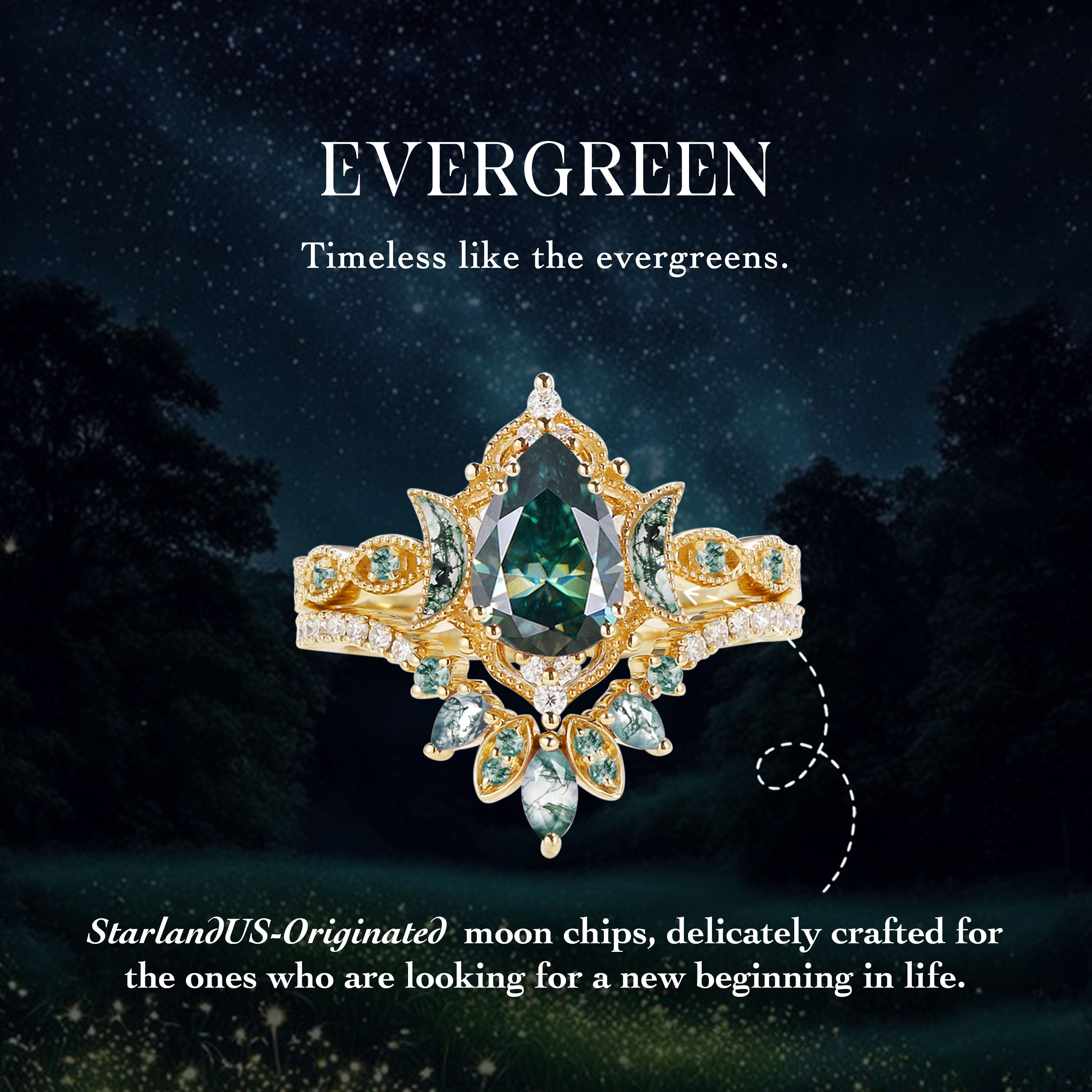 • Design - Two masterfully cut moon shaped gems guarding the center pear, clustered by little sparkly accents, mimicking a galaxy-like setting. A romantic Sci-Fi fiction at its finest.