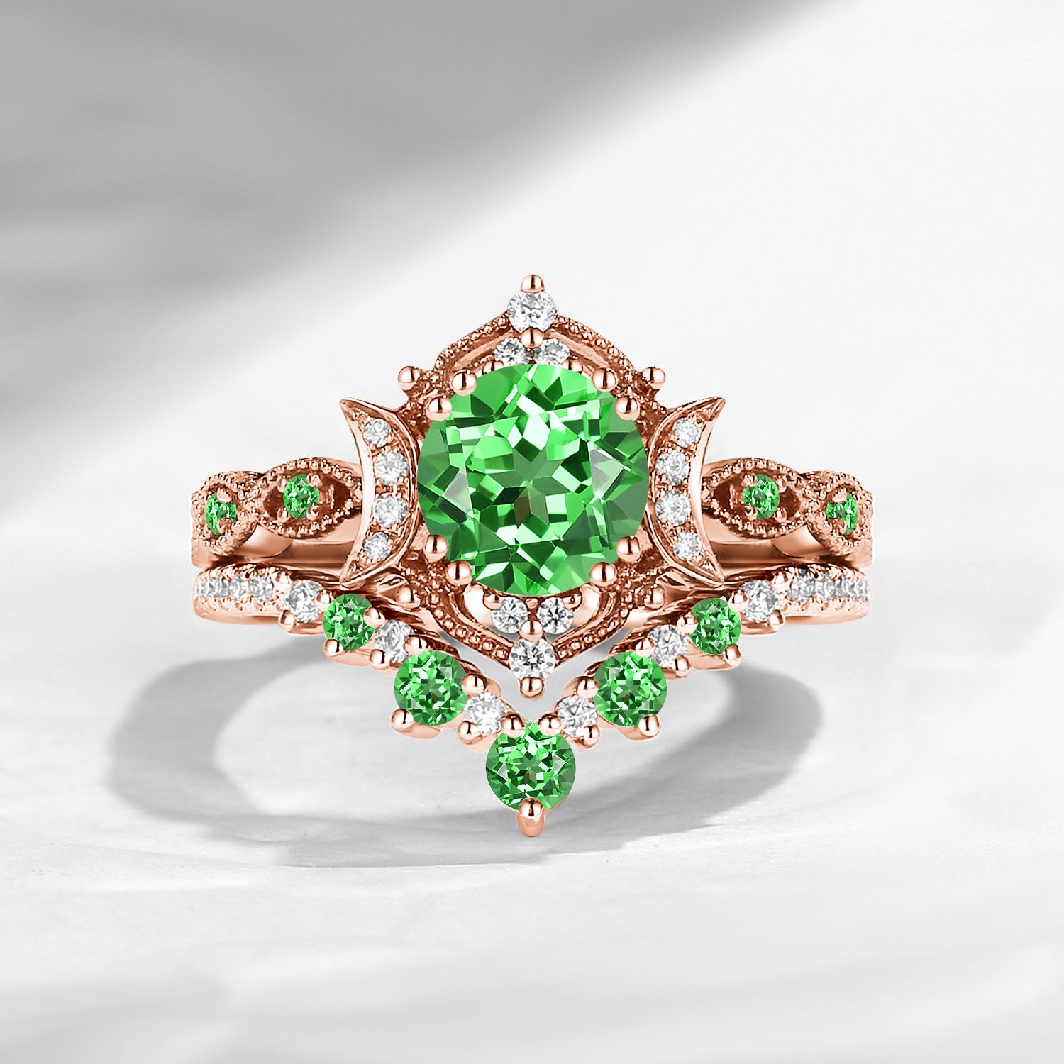 Crescent Moon | Round Cut Lab Tsavorite Vintage Milgrain Engagement Ring Set 2pcs