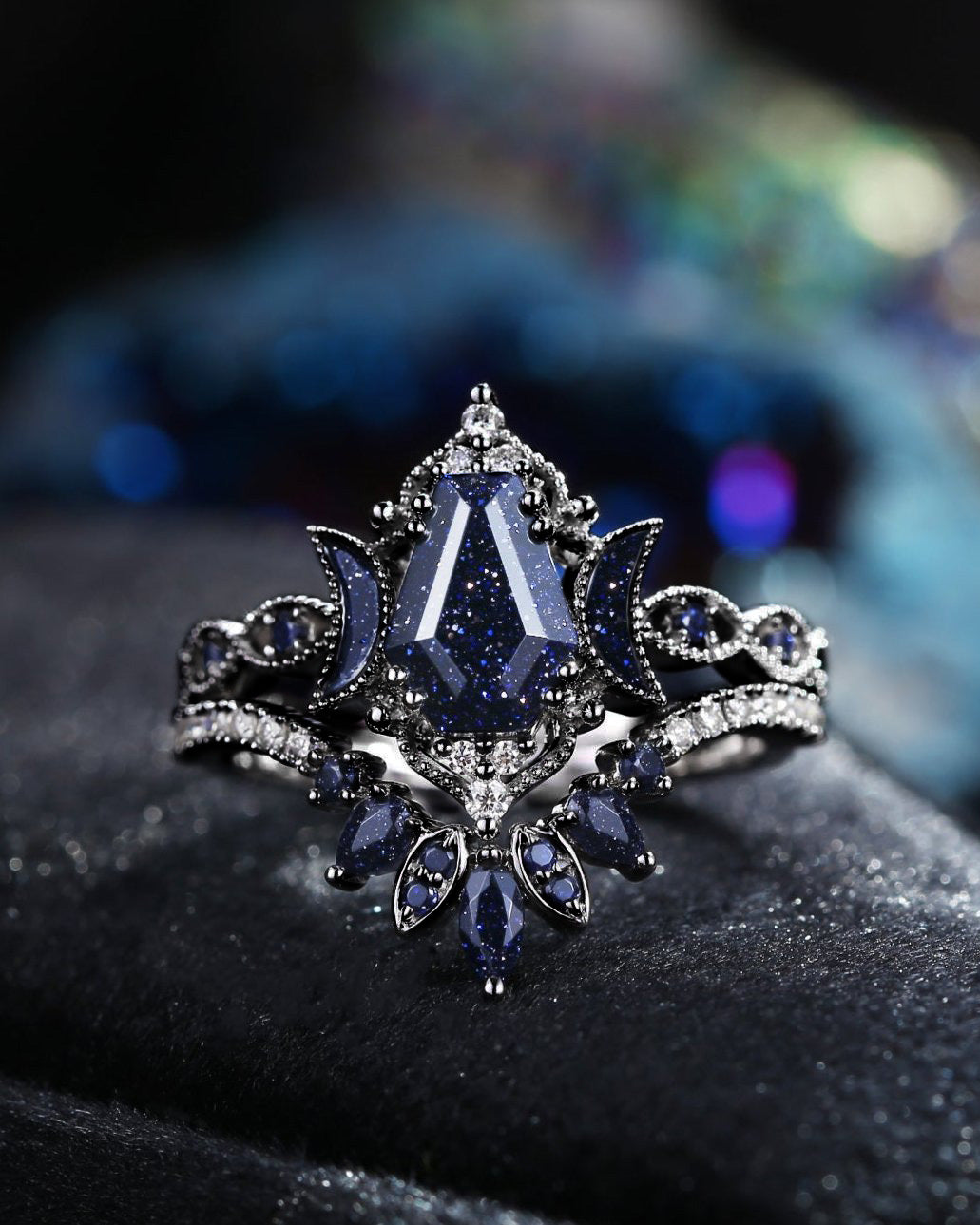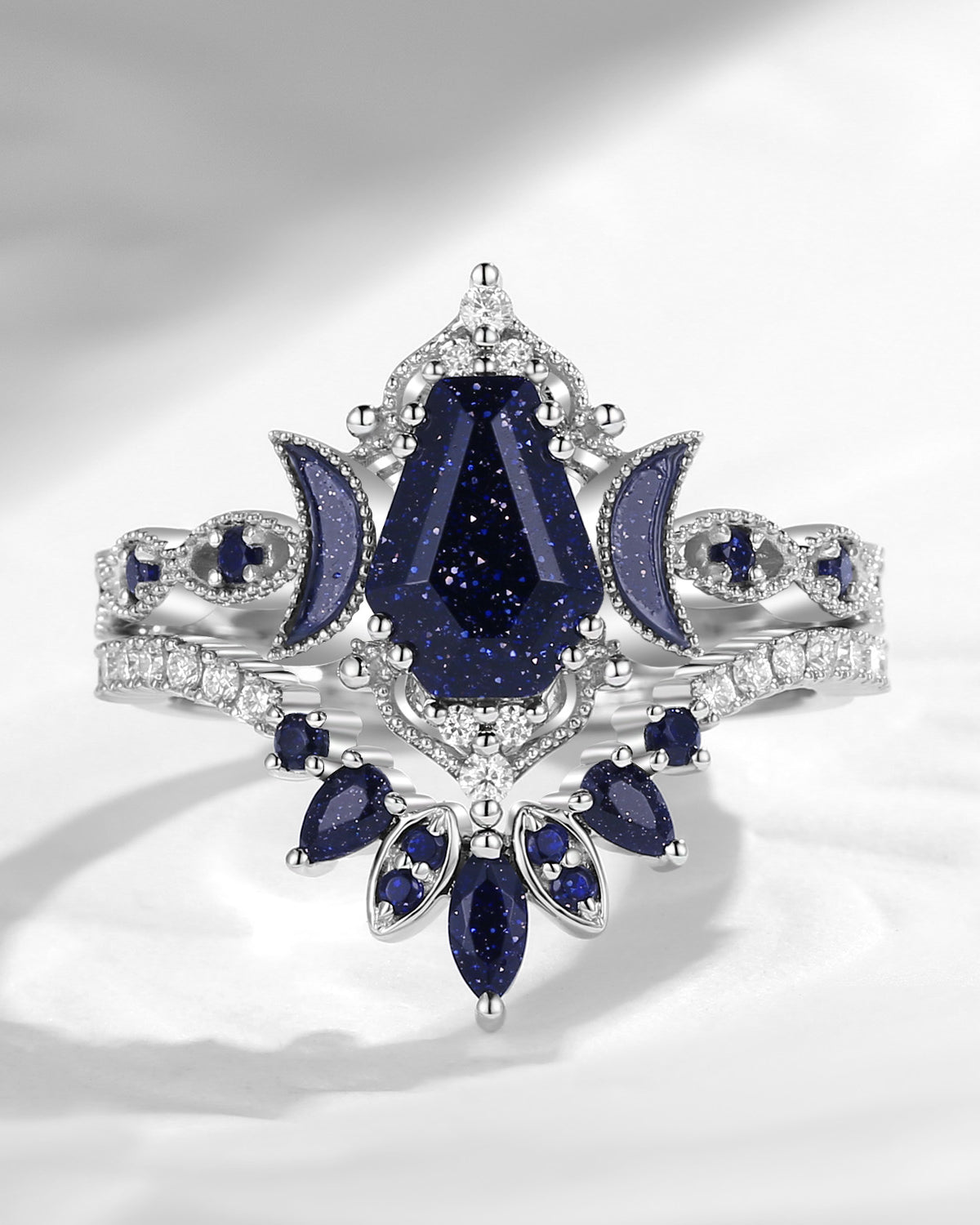 Crescent Moon | Coffin Cut Blue Sandstone Engagement Ring Set 2pcs- 'Ultra Galaxy'