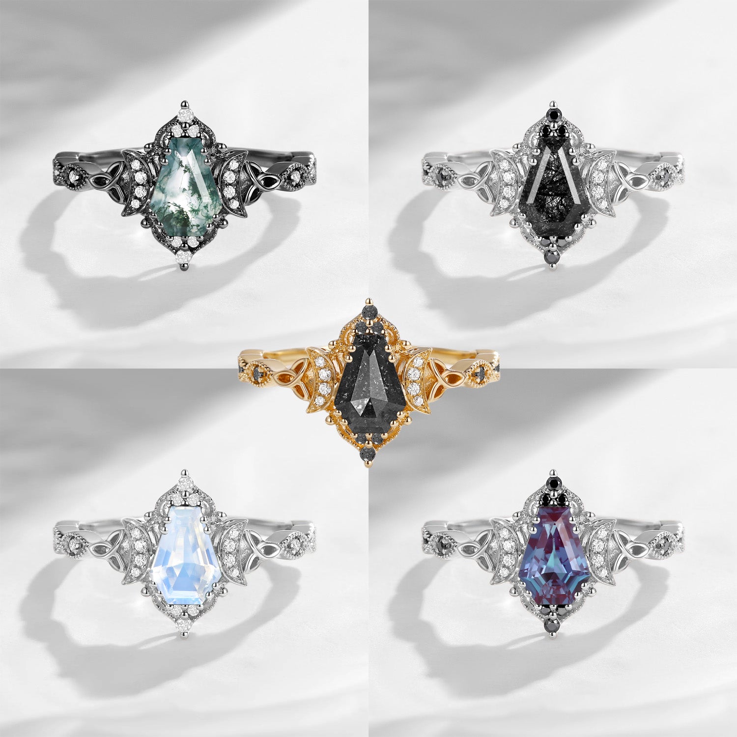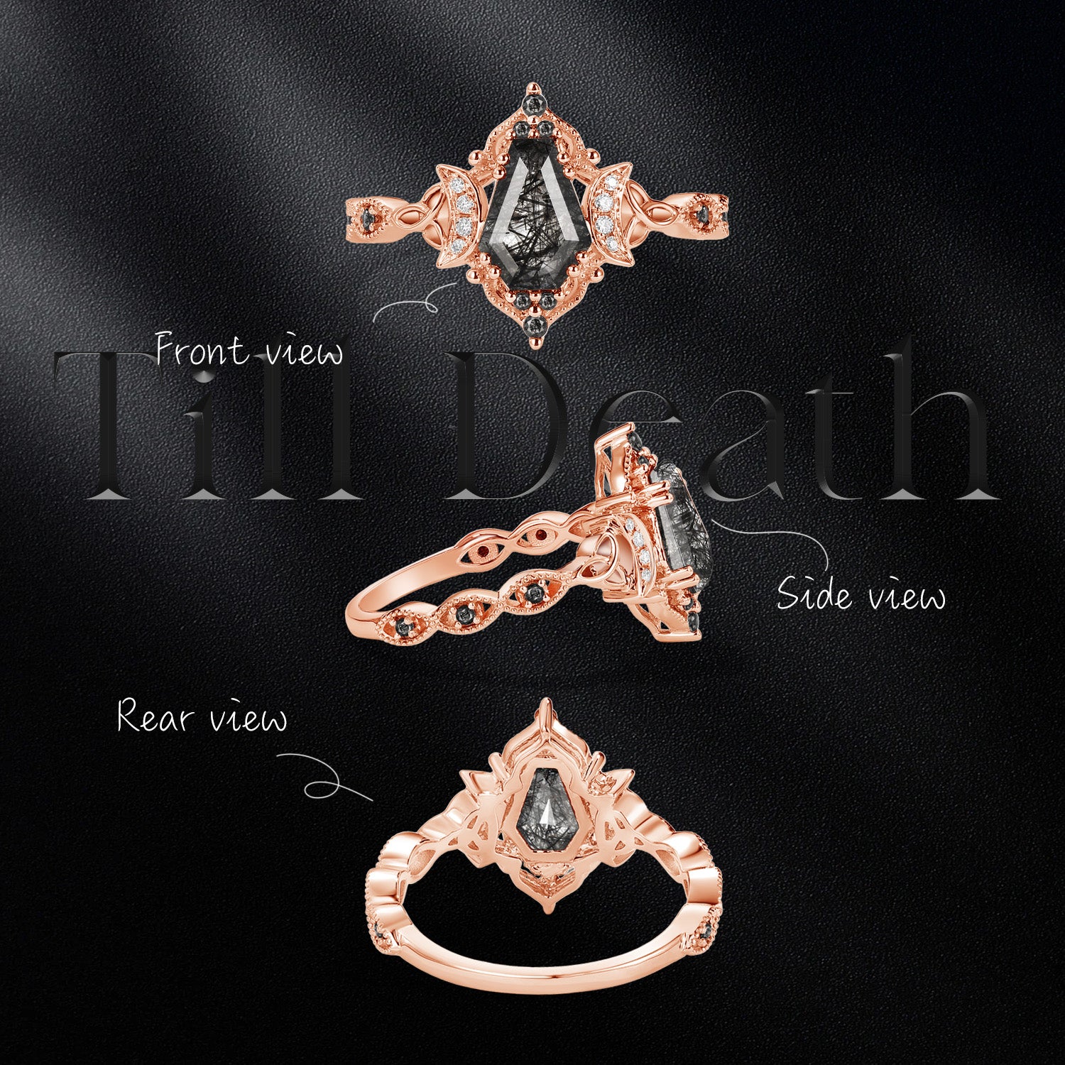 Crescent Moon | Unique Coffin Black Rutilated Quartz Infinity Celtic Engagement Ring