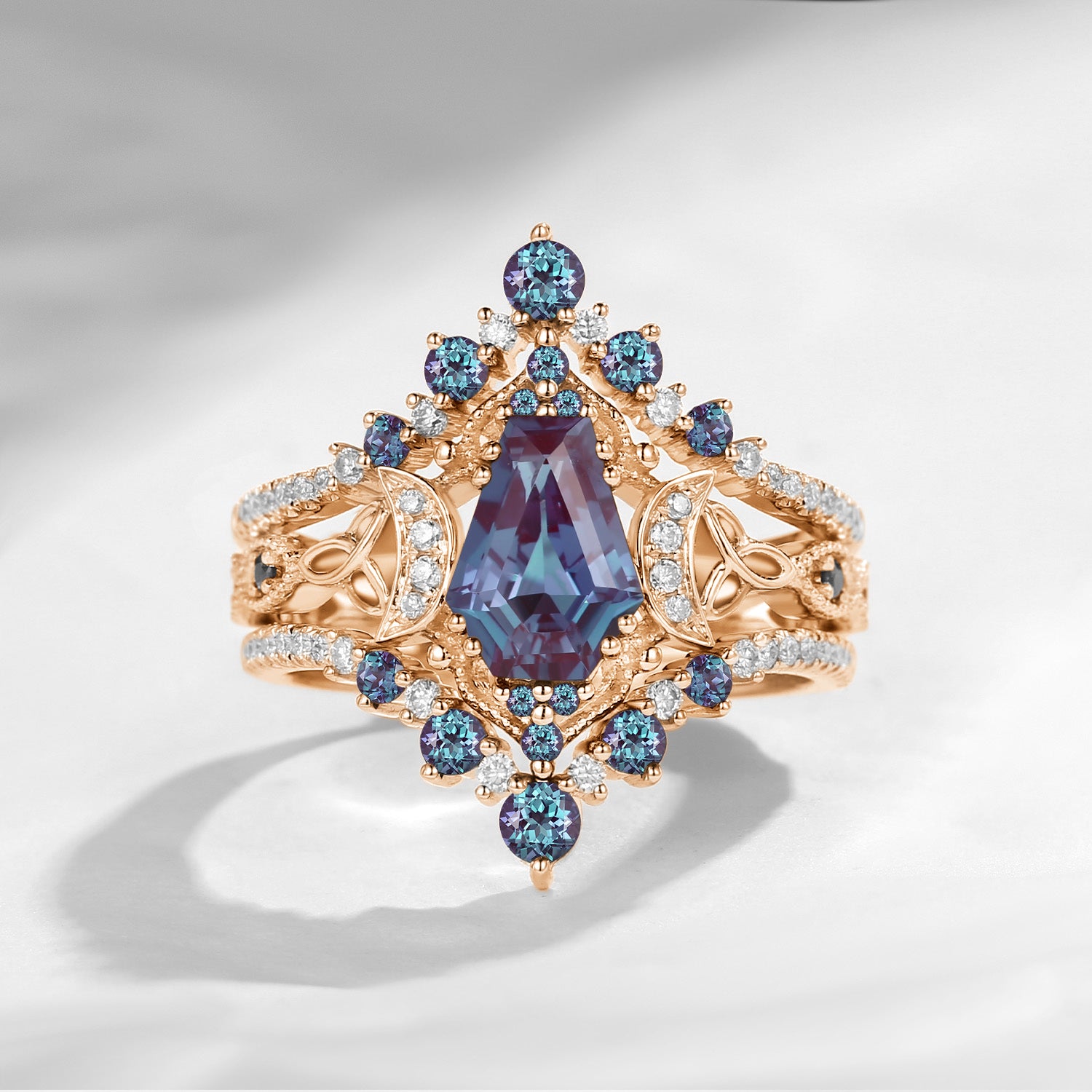 Crescent Moon | Unique Coffin Lab Alexandrite Celtic Infinity Engagement Ring Set 3pcs