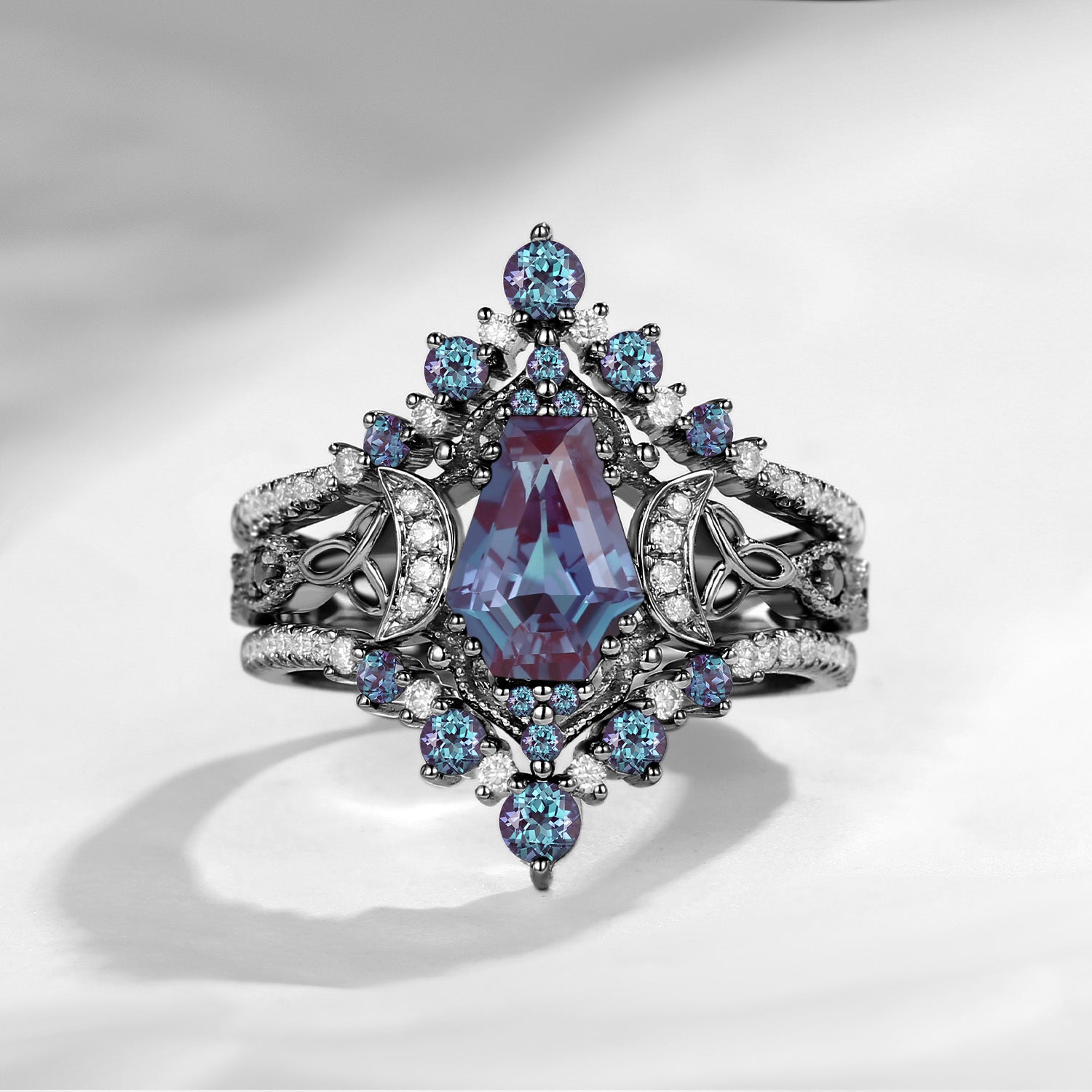 Crescent Moon | Celtic Unique Coffin Lab Alexandrite Infinity Engagement Ring Set 3pcs