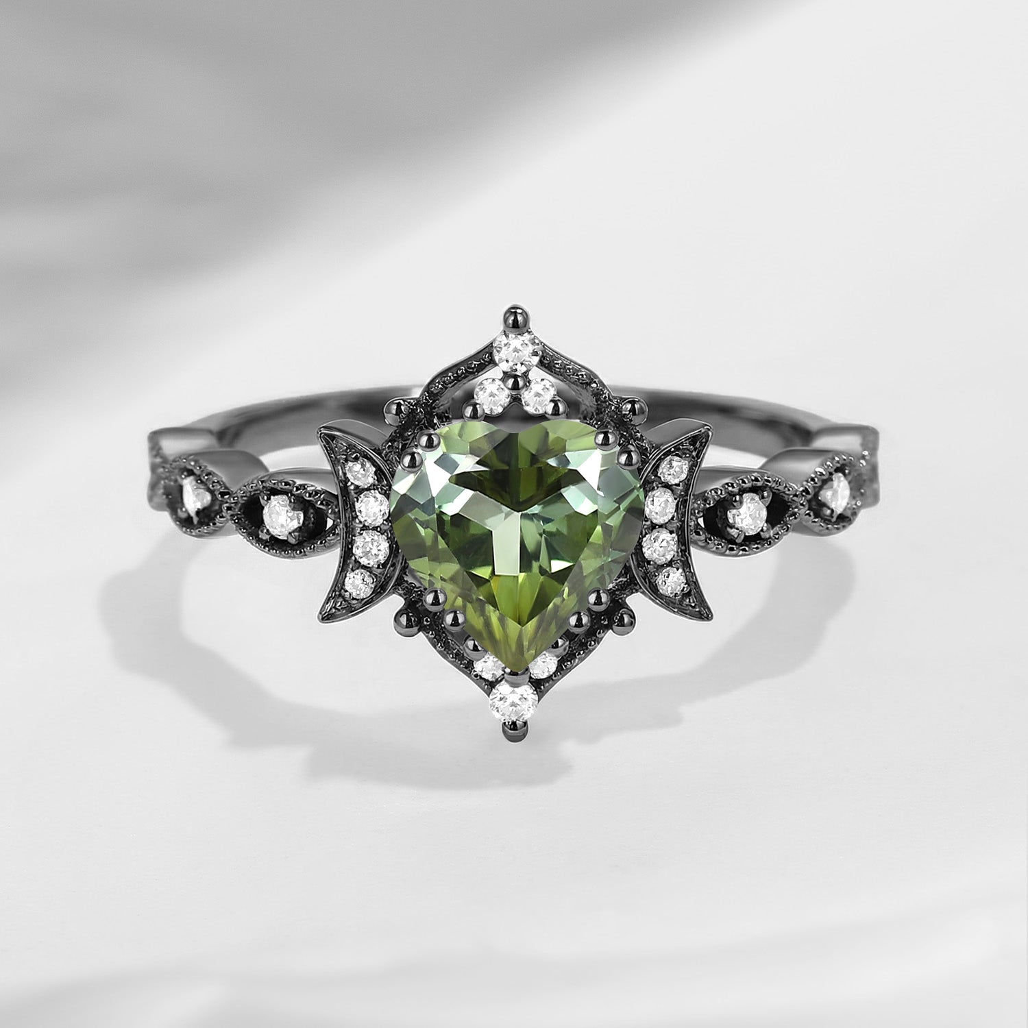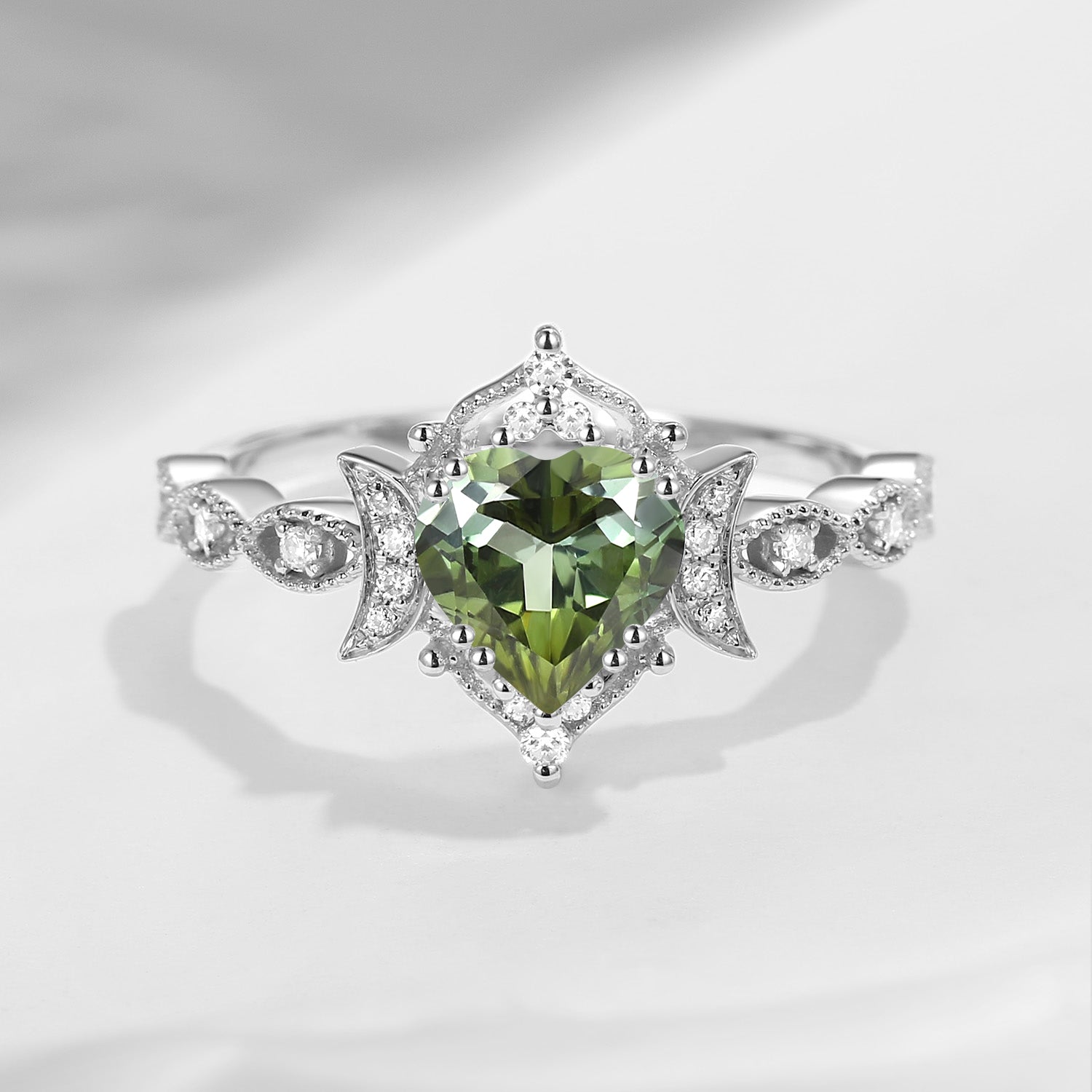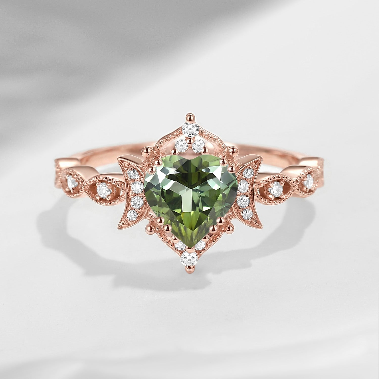 Antique Crescent Moon | Unique Heart Shaped Natural Verdelite Green Tourmaline Engagement Ring Moon Ring