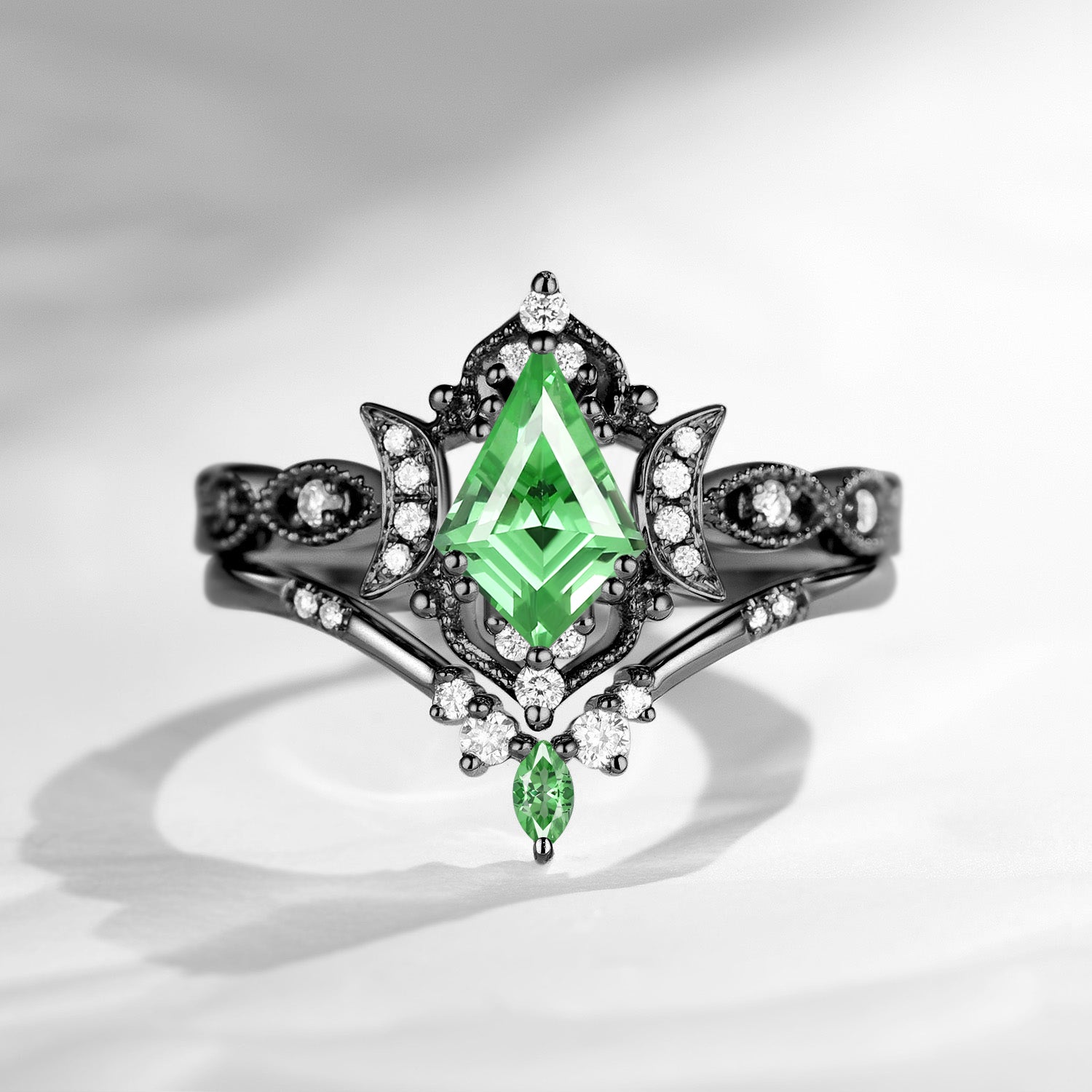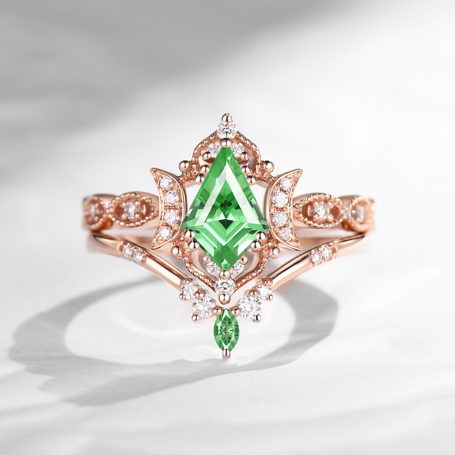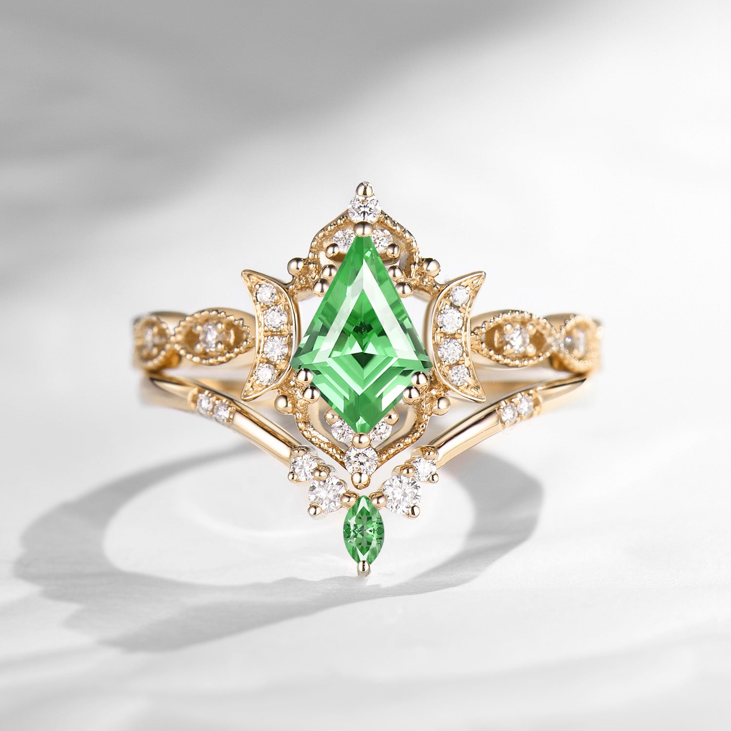 Crescent Moon | Unique Kite Cut Lab Tsavorite Engagement Ring Set 2pcs - Luna