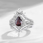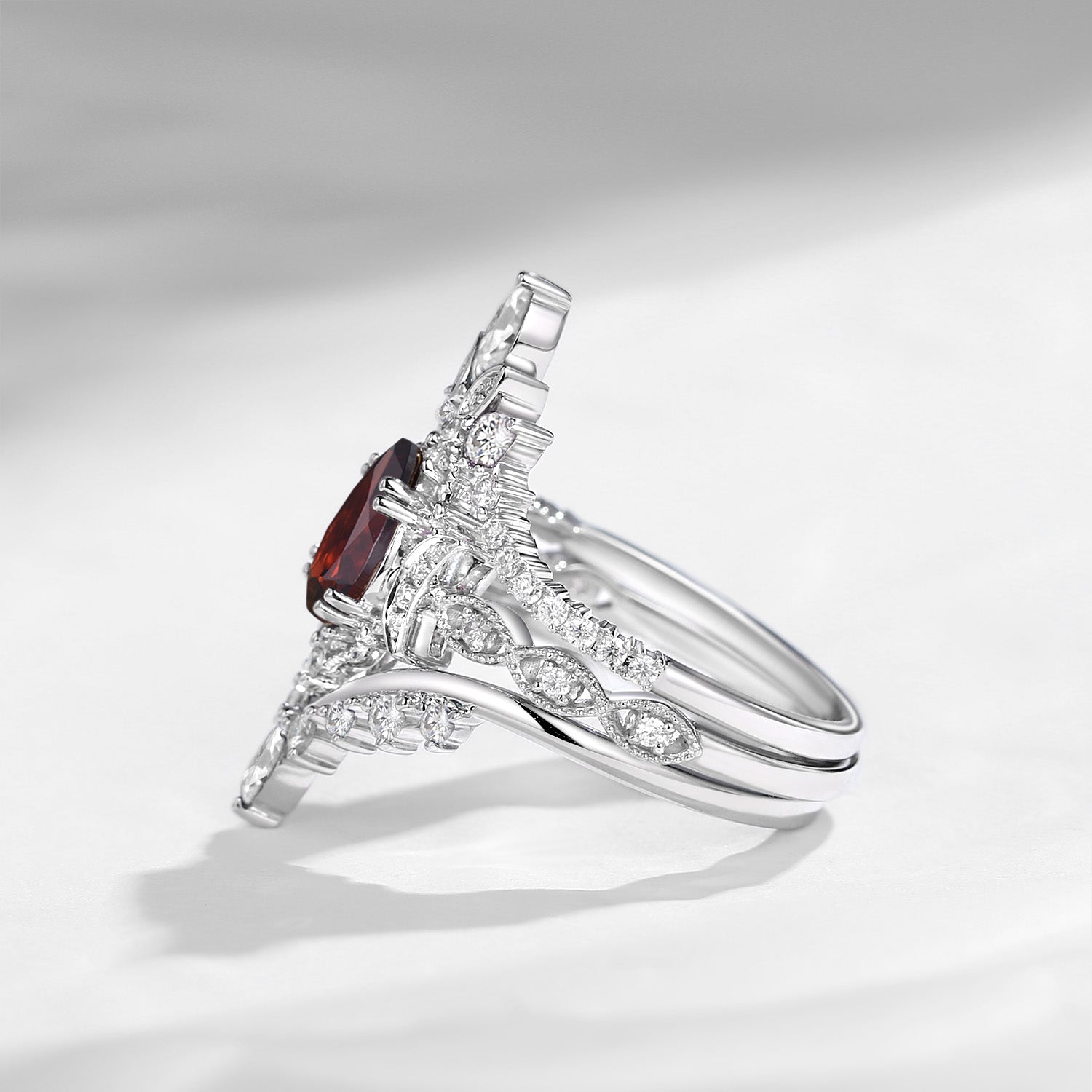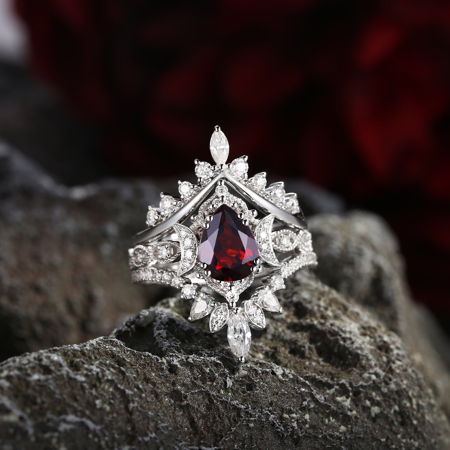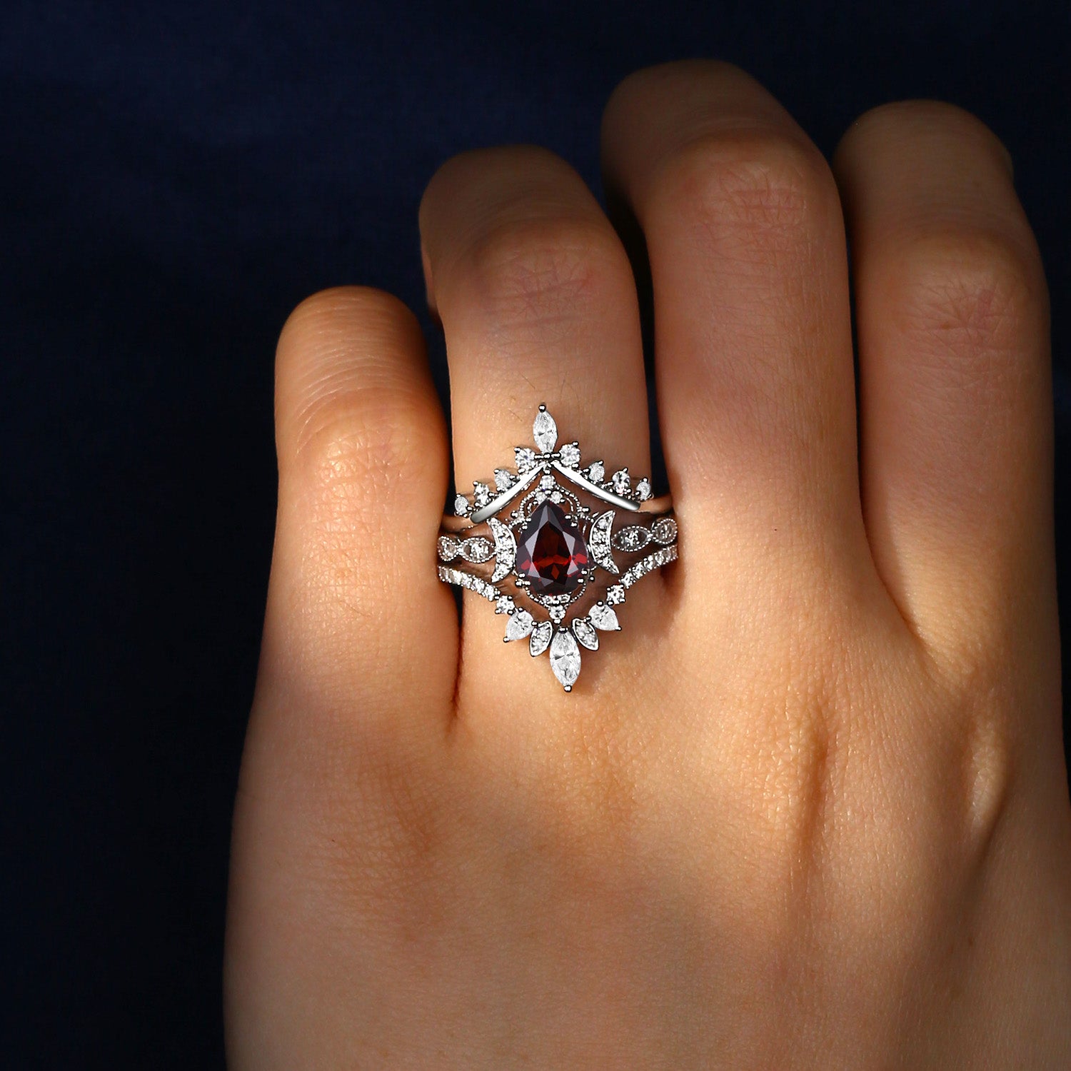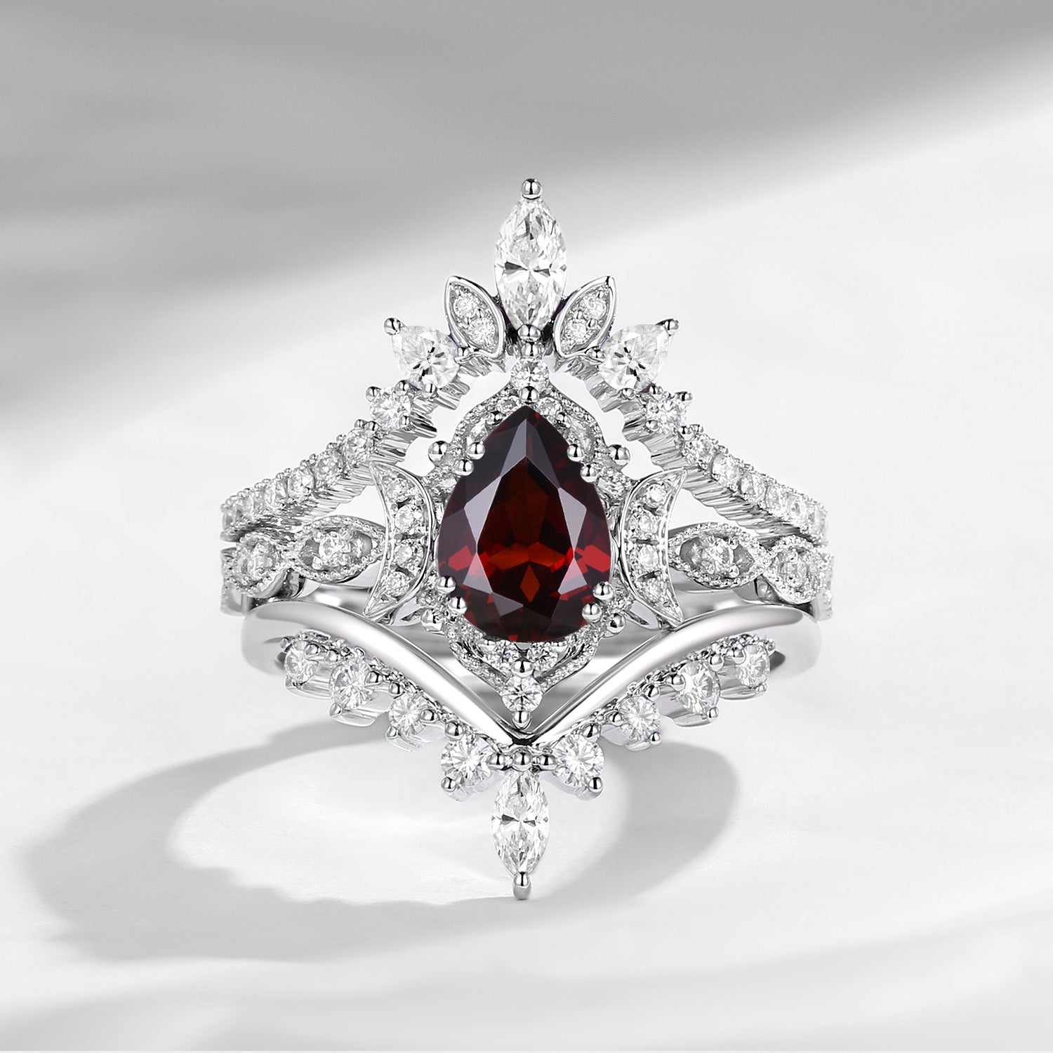 Crescent Moon | Unique Pear Shaped Garnet Engagement Ring 3pcs