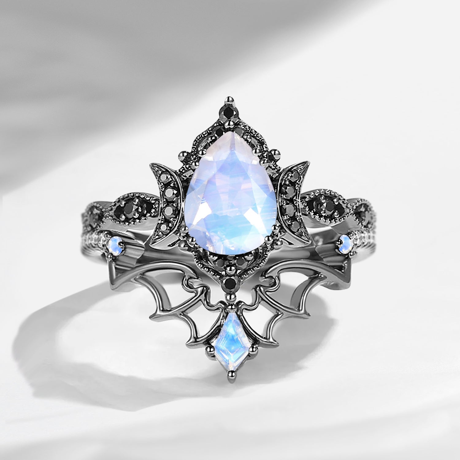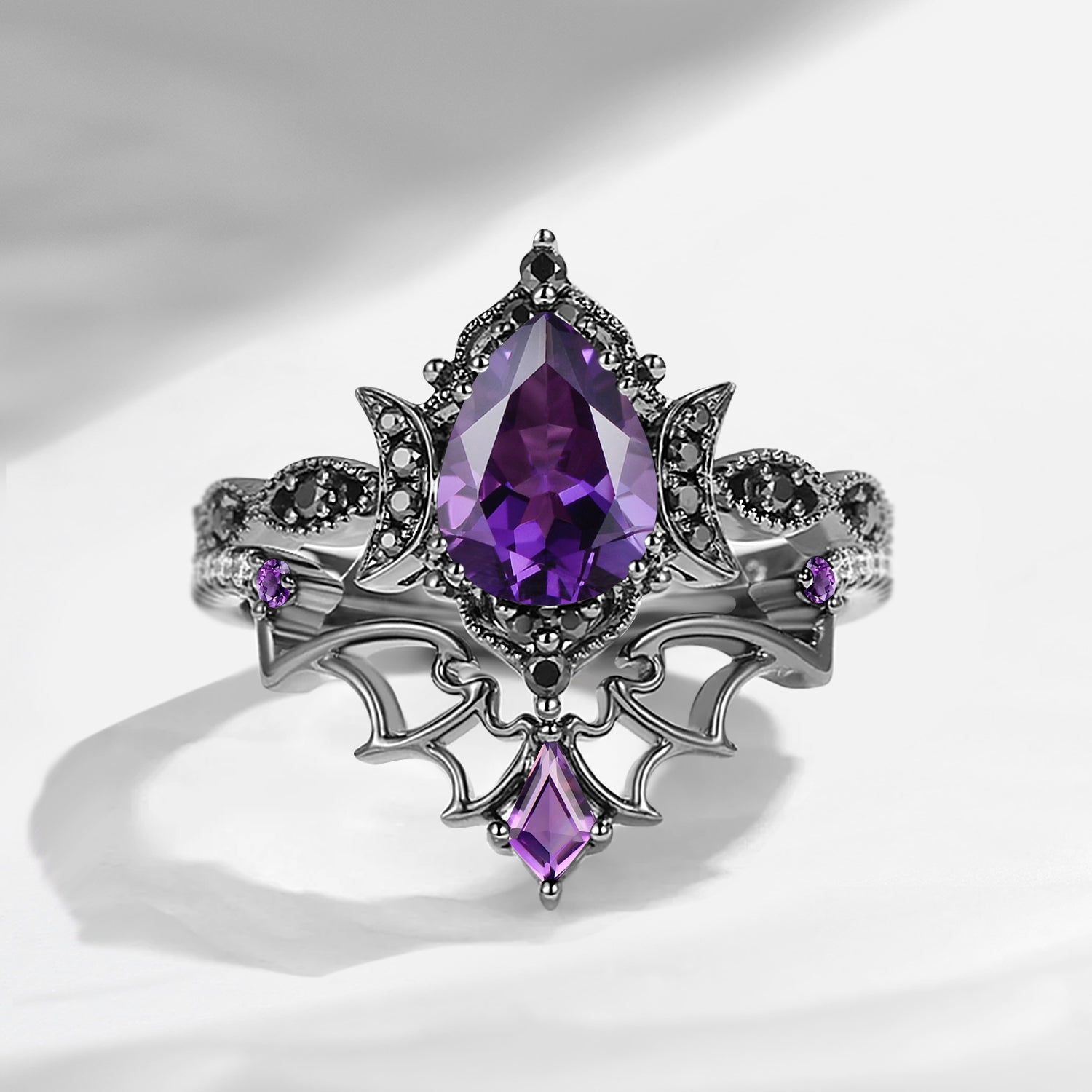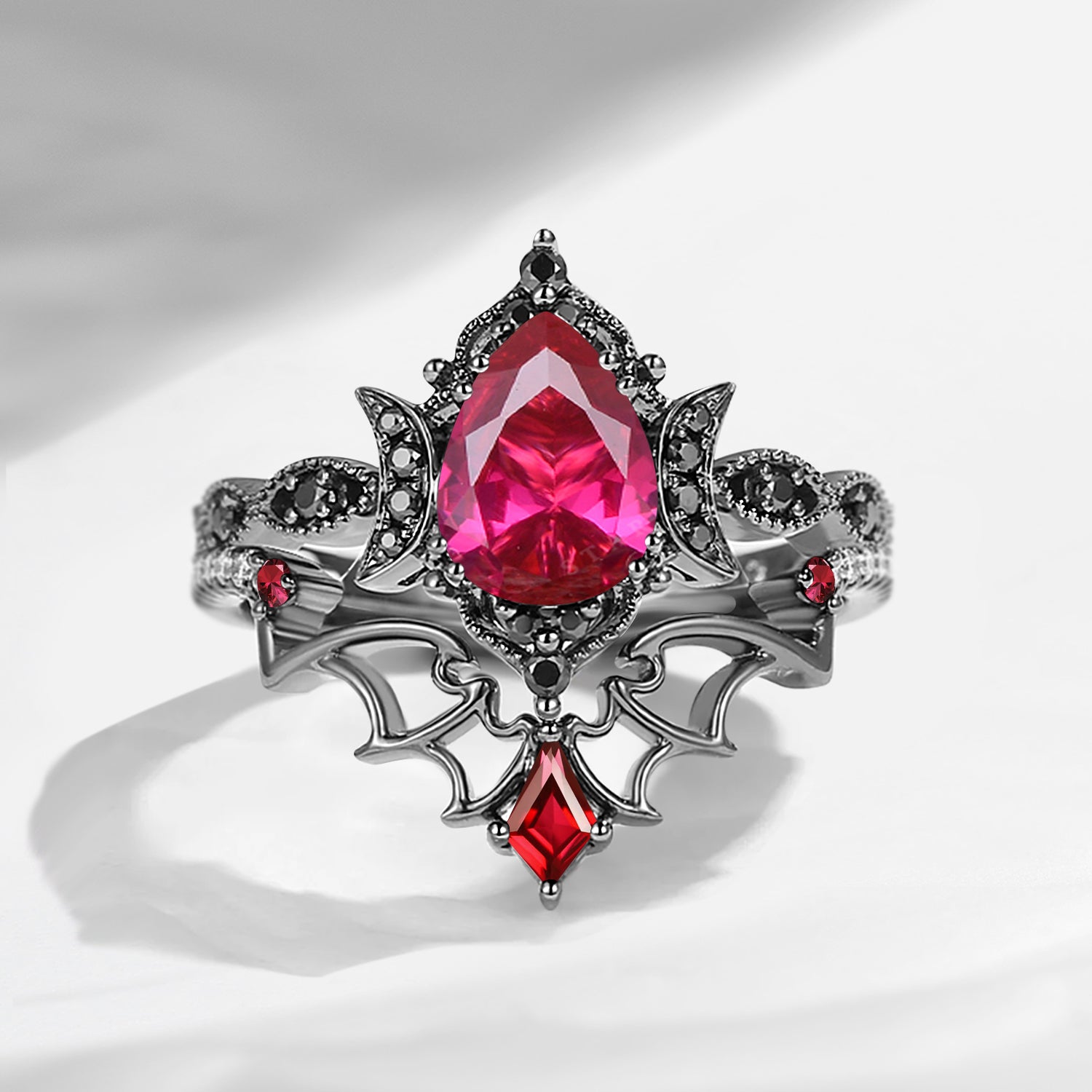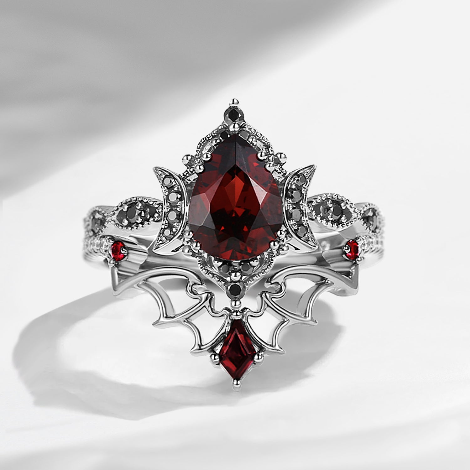 Crescent Moon | Vintage Inspired Pear Shaped Garnet Black Bat Ring Set 2pcs