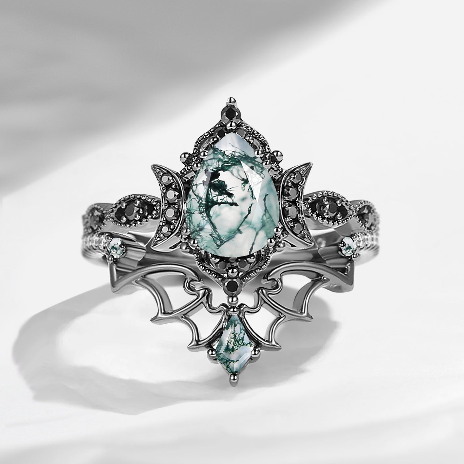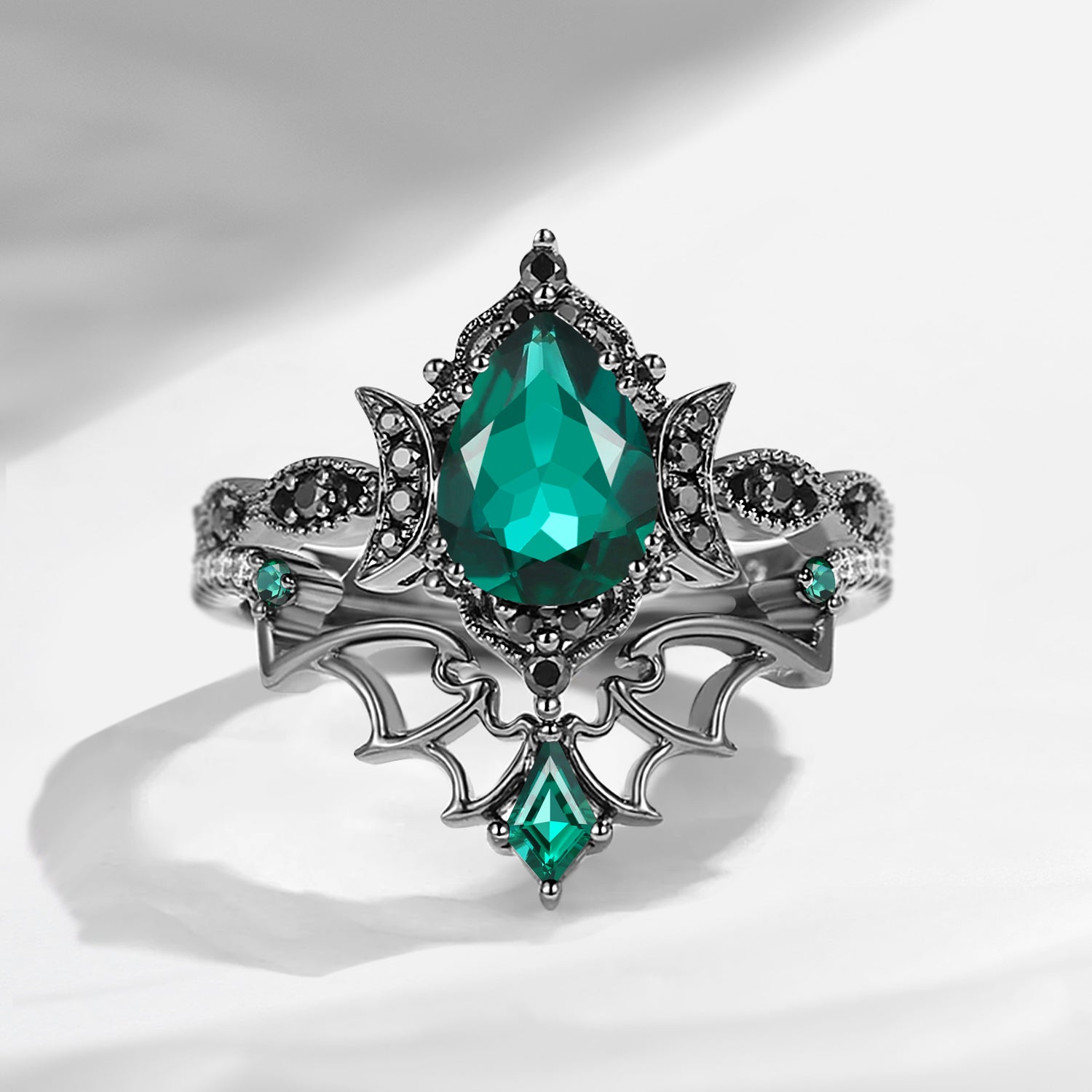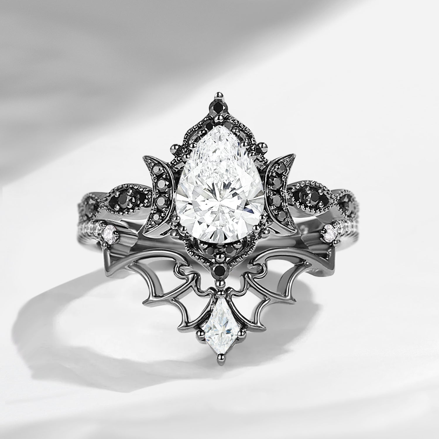 Crescent Moon | Vintage Inspired Pear Shaped Garnet Black Bat Ring Set 2pcs