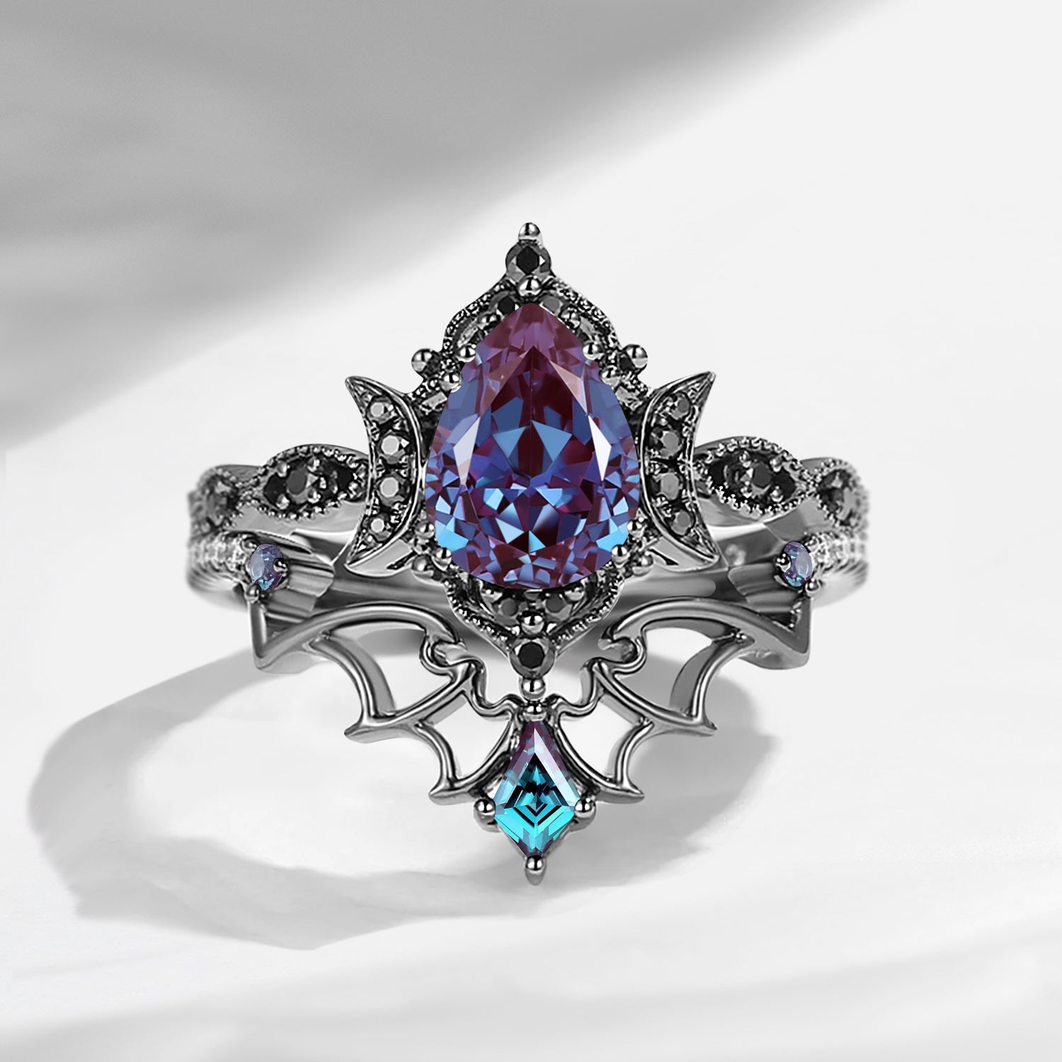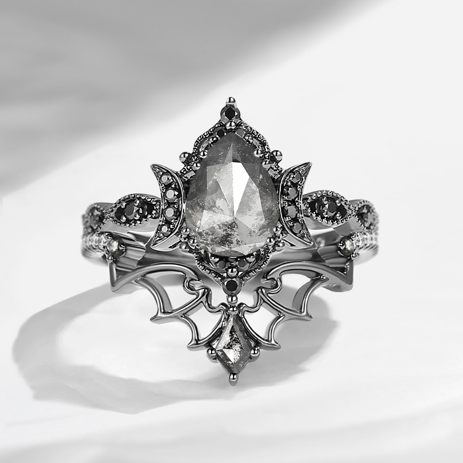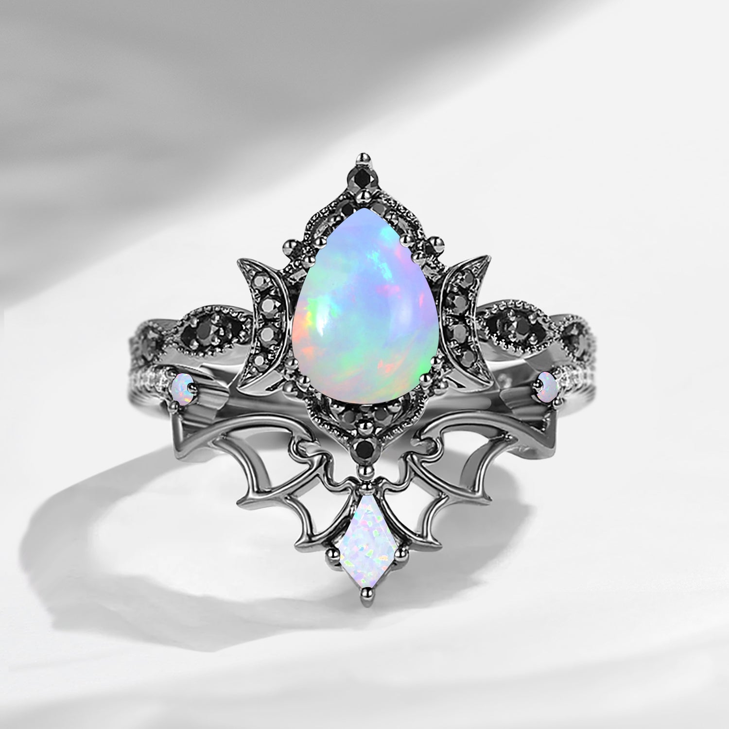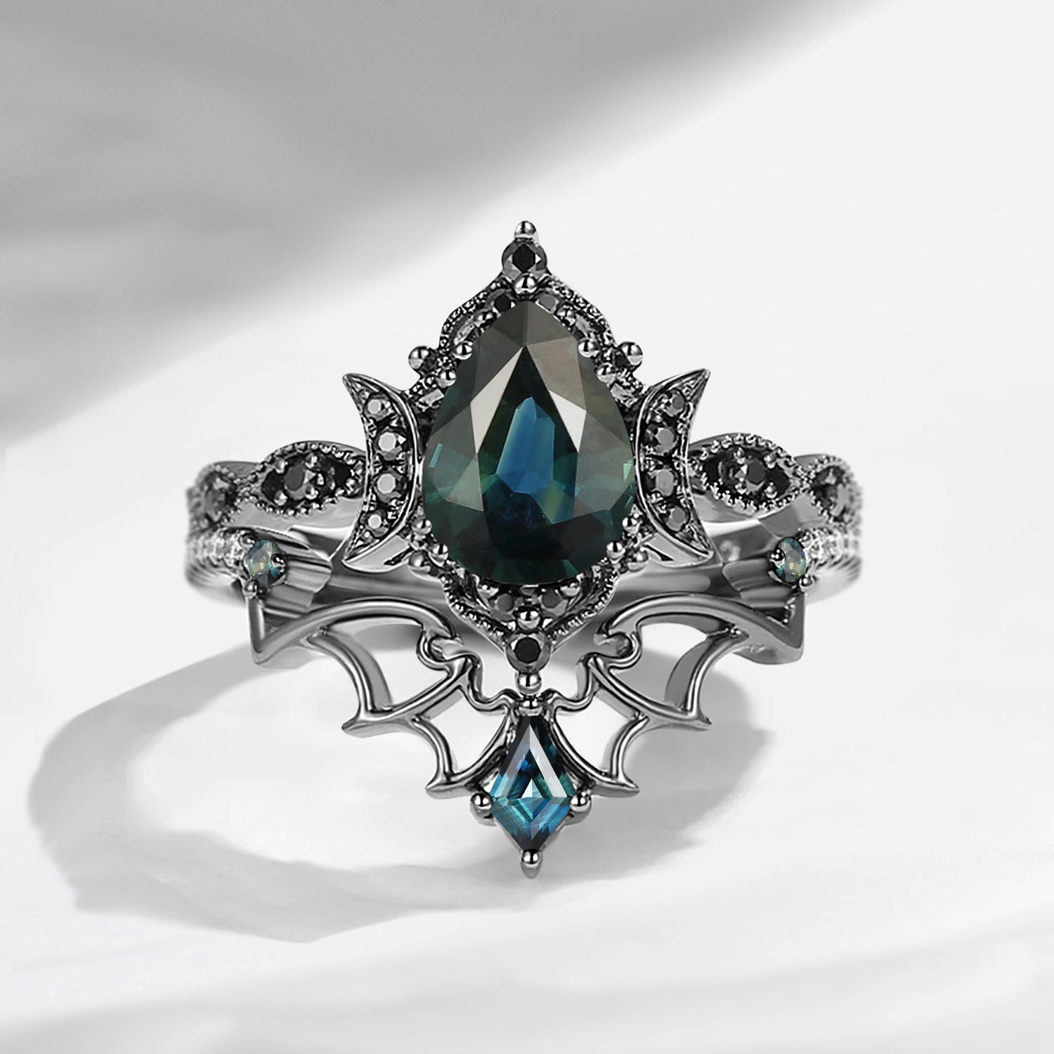Crescent Moon | Vintage Inspired Pear Shaped Garnet Black Bat Ring Set 2pcs
