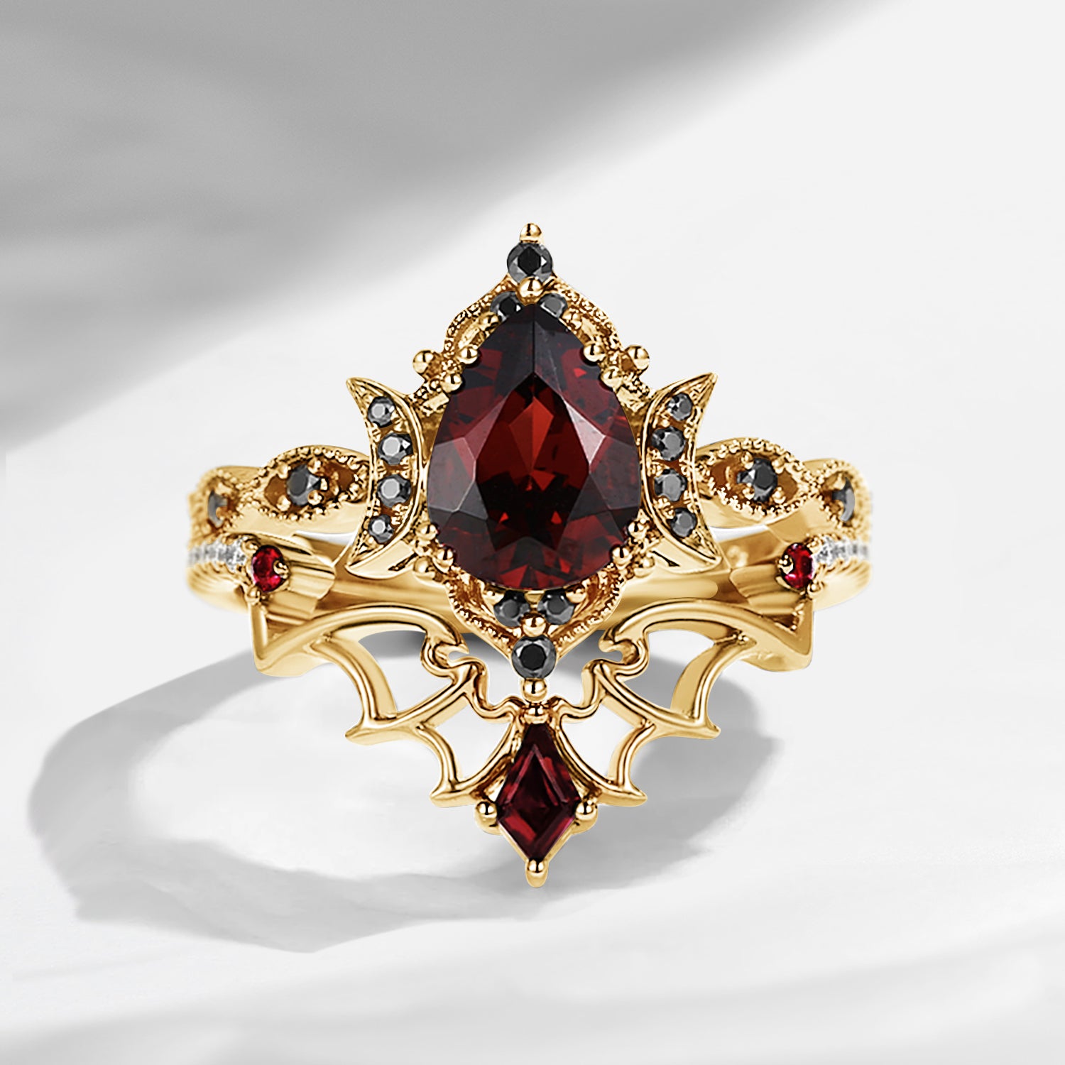 Crescent Moon | Vintage Inspired Pear Shaped Garnet Black Gold Ring Set 2pcs