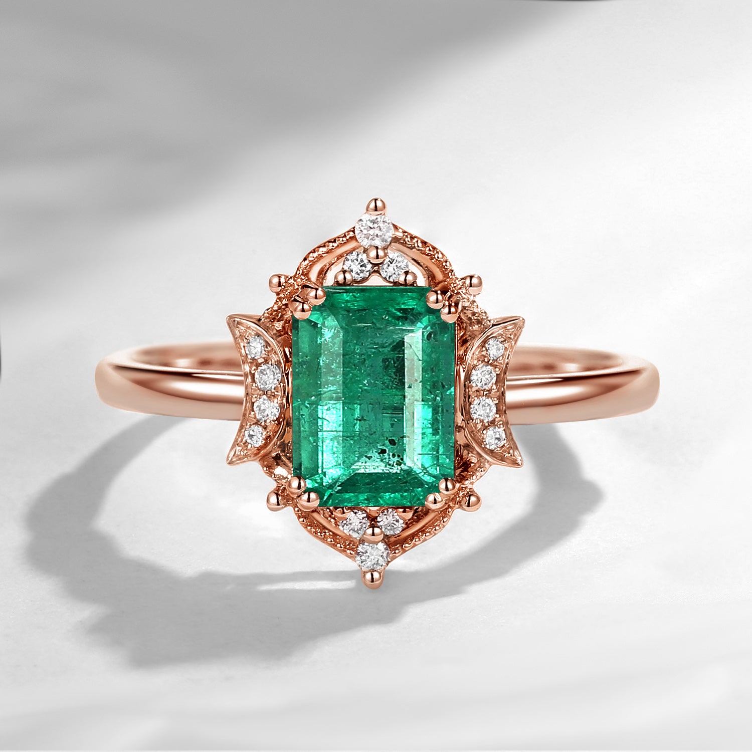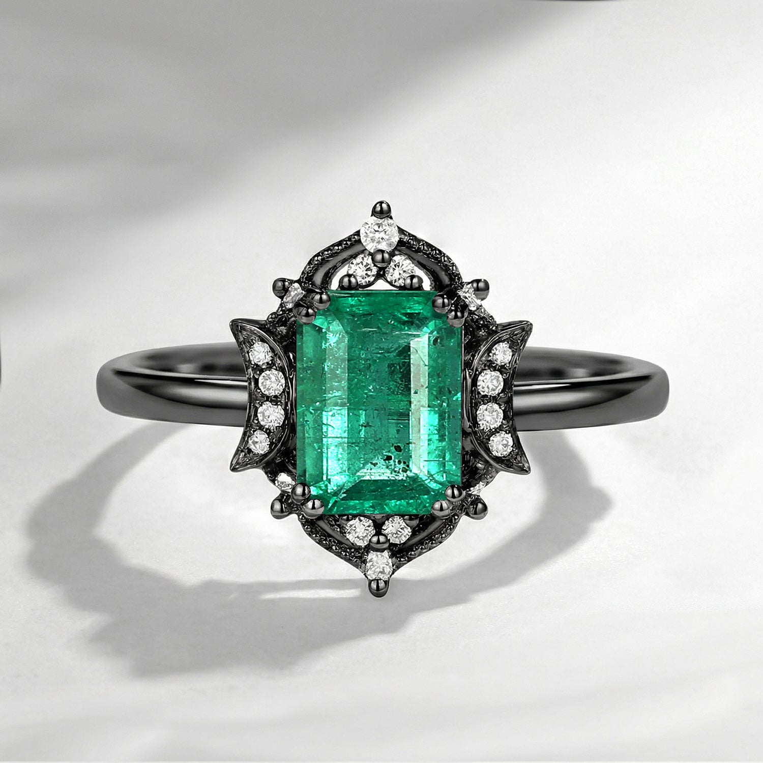Crescent Moon | Vintage Style Emerald Cut Natural Emerald Moon Engagement Ring Green Unique Moon Crescent May Birthstone Unique Art Deco Flower Anniversary