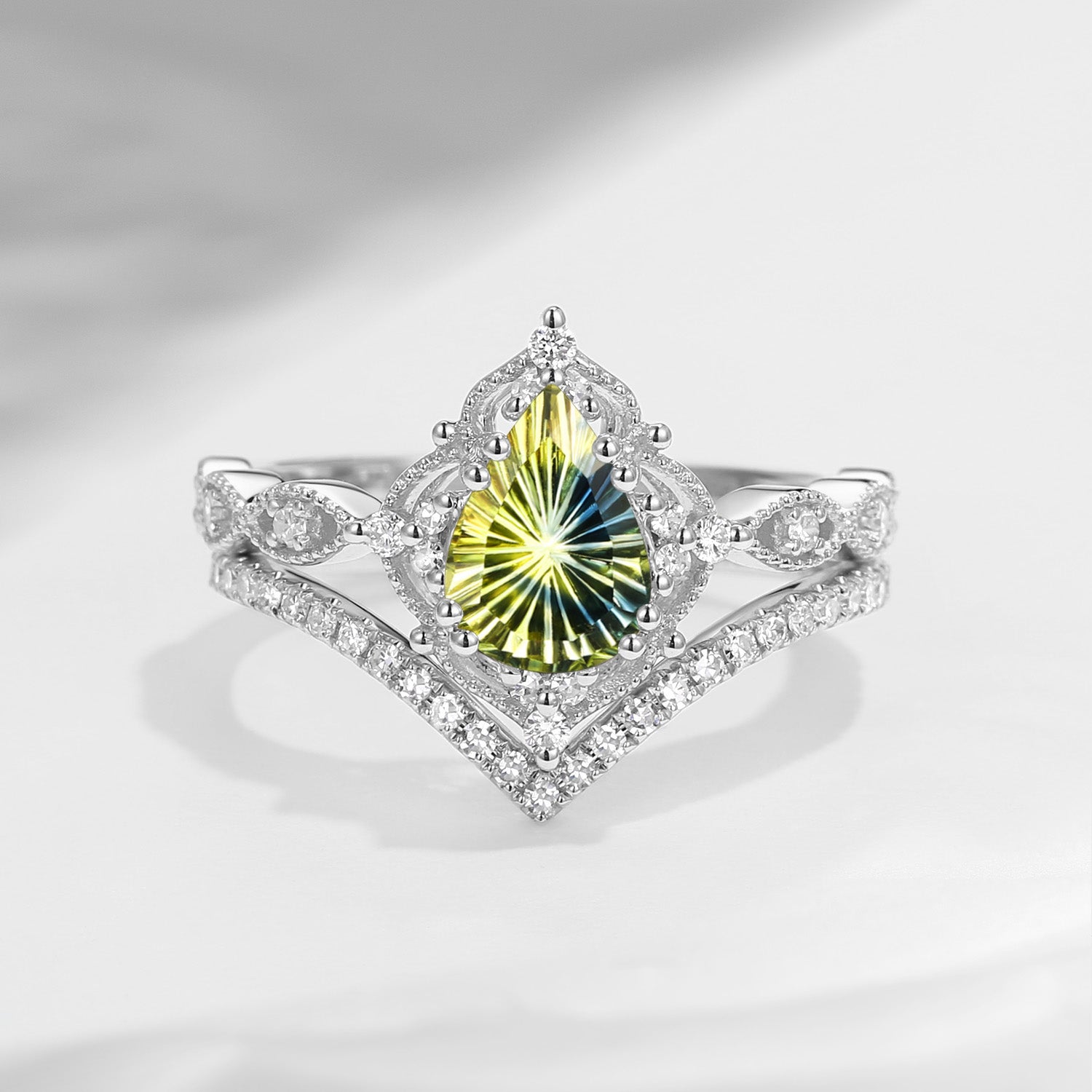 Fantasy Carved Pear Shaped Natural Multi-Colored Sapphire Engagement Ring Set 2pcs - Evelyn