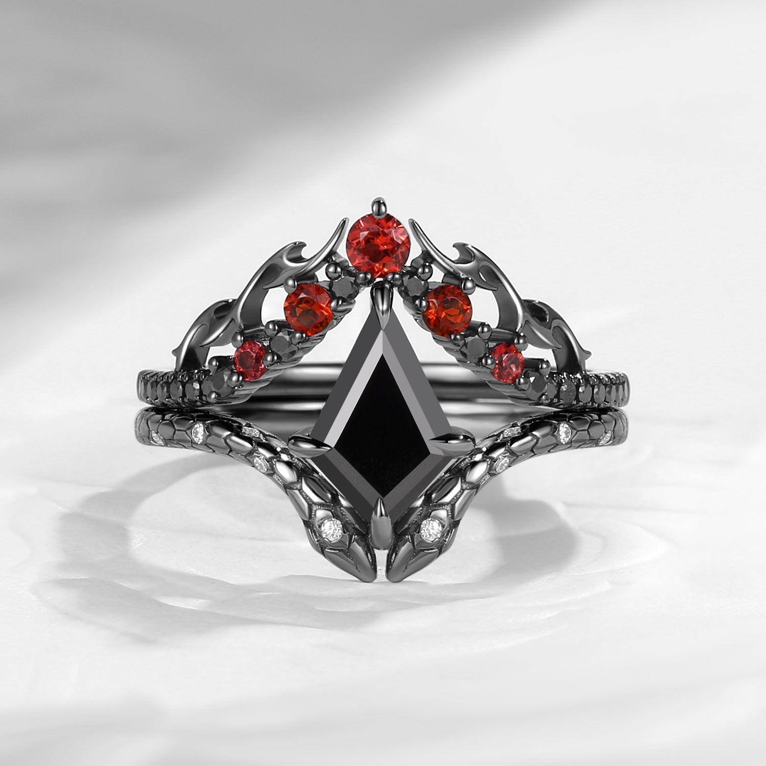 Gothic Kite Cut Black Moissanite 'Fiery Desire' Engagement Ring Set 2pcs - Serpent's Embrace