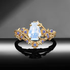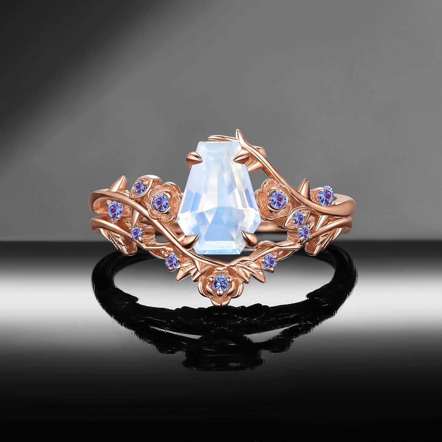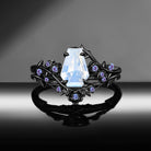 Gothic Nature Inspired Coffin Cut Moonstone Engagement Ring Set 2pcs - 'Thorns & Roses'
