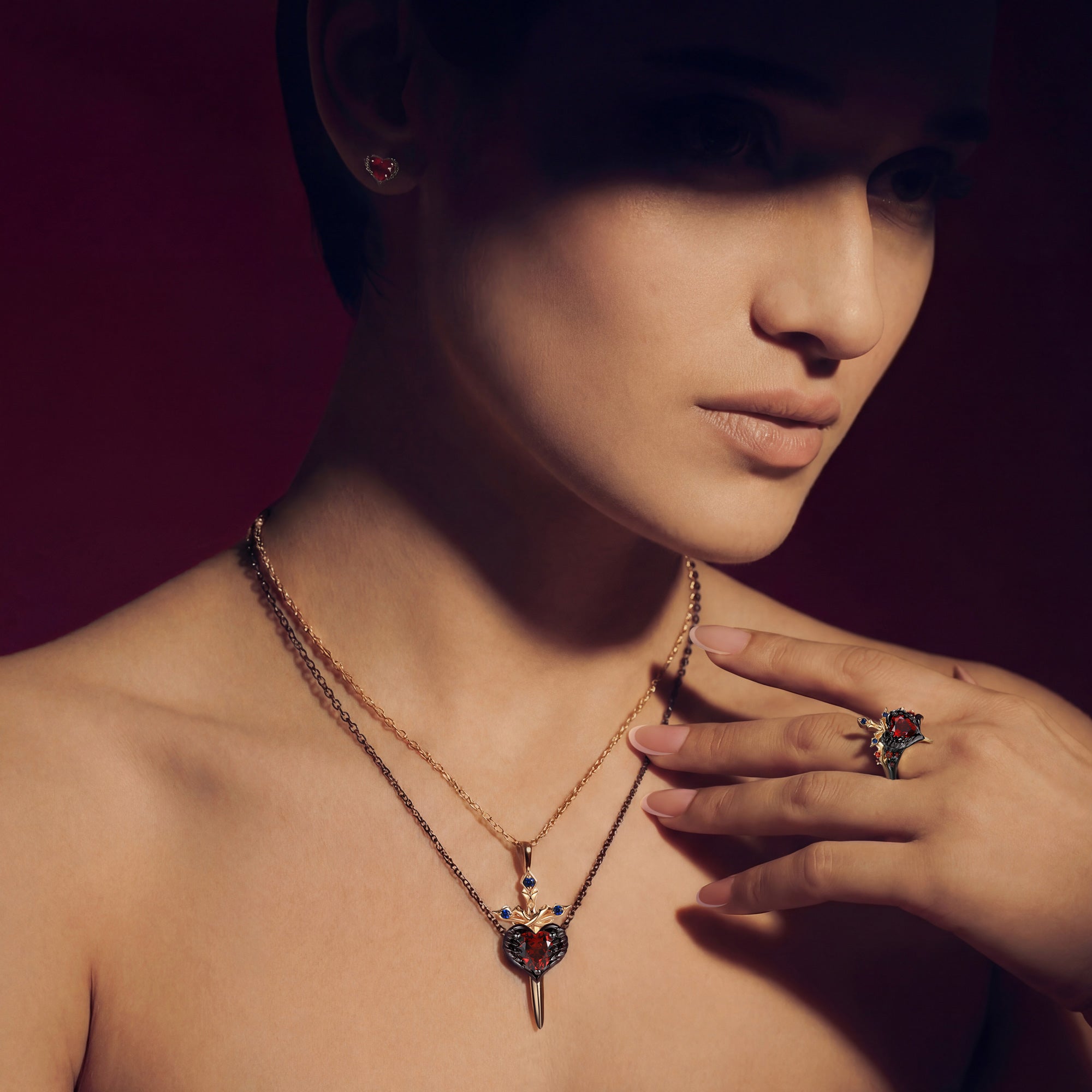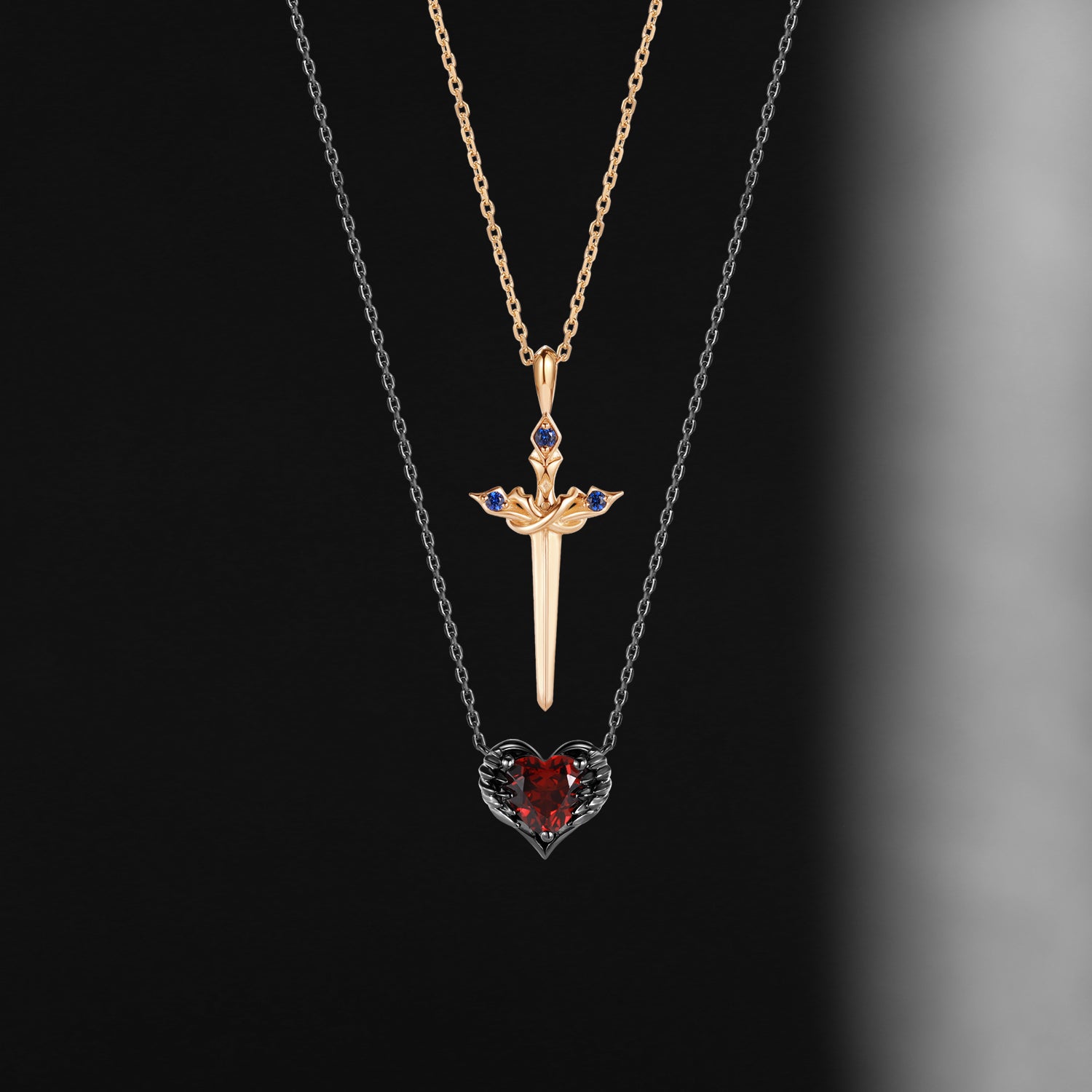 Gothic Style Heart Shaped Garnet Two-Tone Couple Necklaces Set 2pcs - 'Pierced Heart'