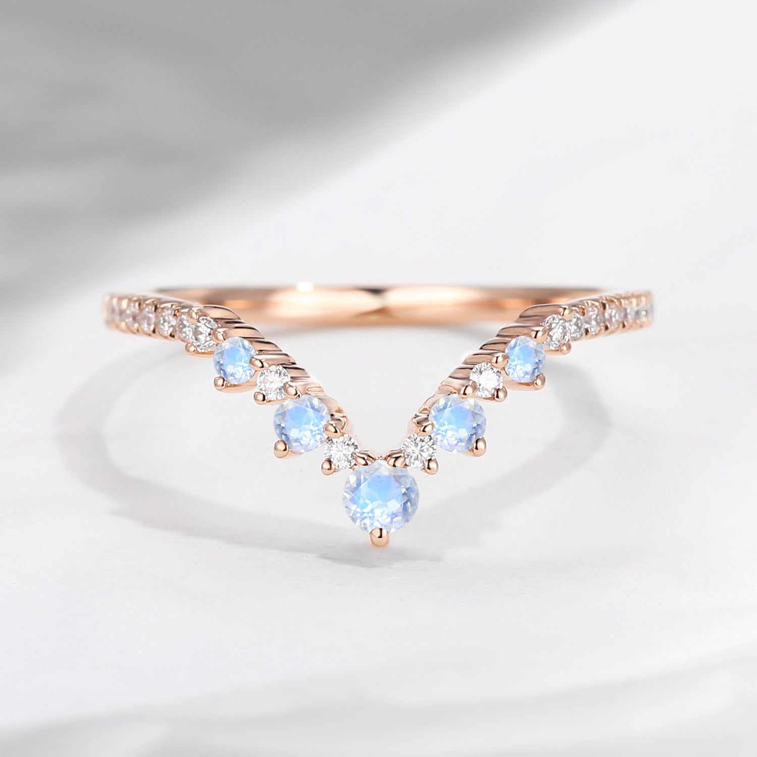 Custom Fit Gradient Moonstone Moissanite Ring Curved Band White Gold Moonstone Wedding Band Women Chevron Ring Guard Cluster Ring