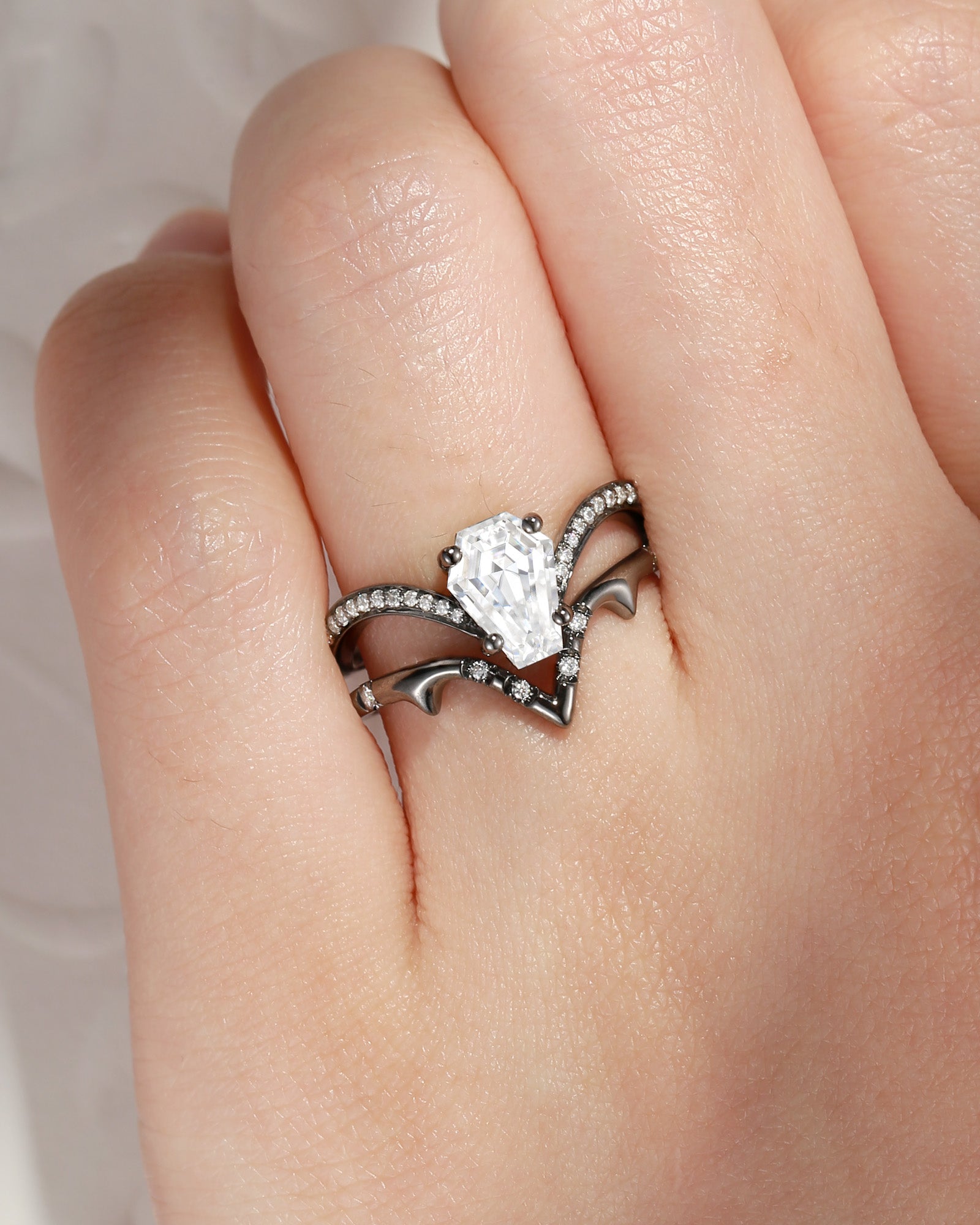 Pear Cut Moissanite Vintage White Gold Dark Bat Bridal Set 2pcs