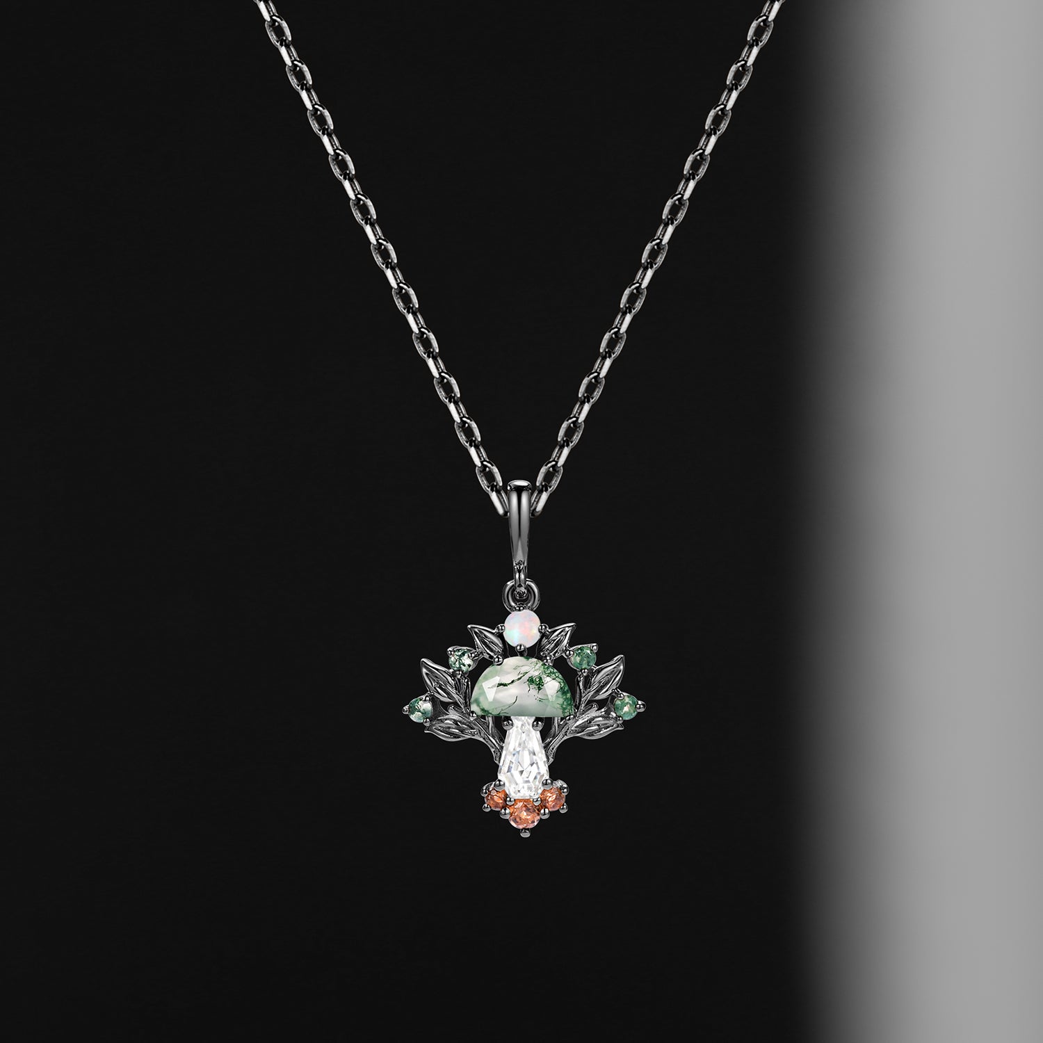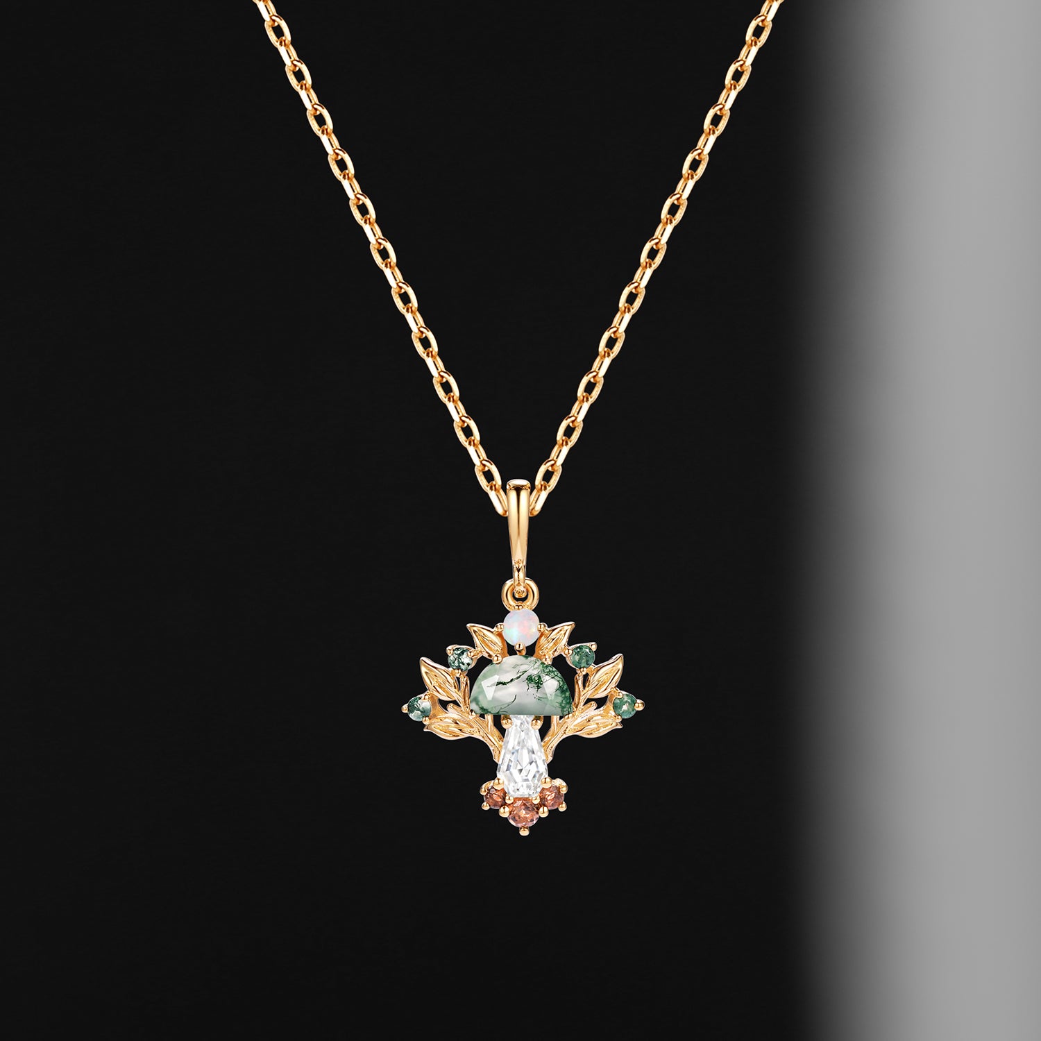 Maximalist Nature Inspired Half Moon Moss Agate + Coffin Moissanite Mushroom Necklace - 'Tree of Life'