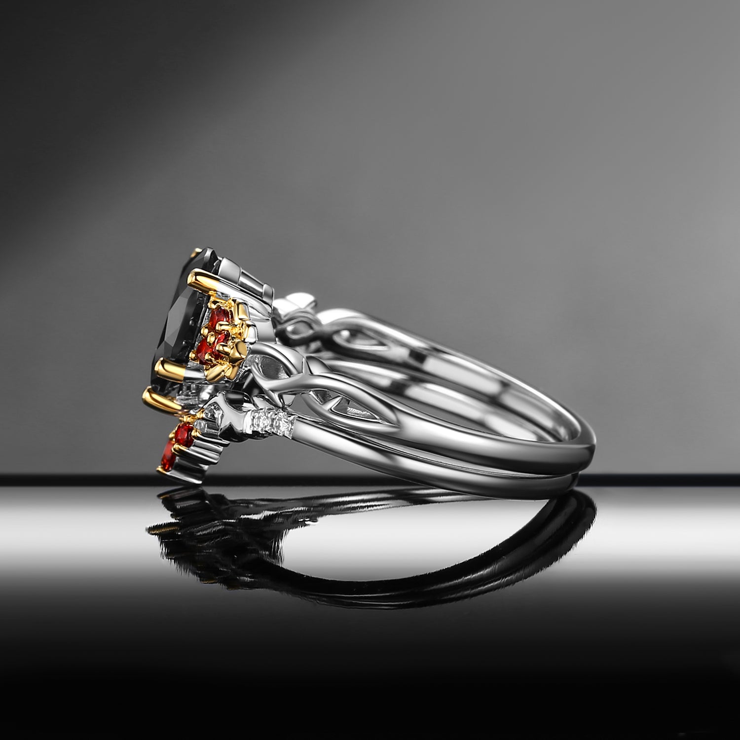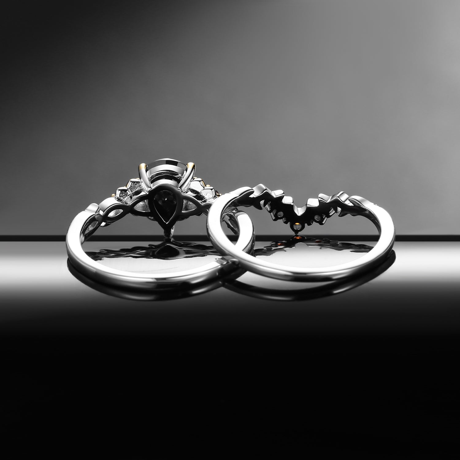 Nature Inspired Pear Shaped Black Moissanite 'Thorns & Roses' Two-Tone Engagement Ring Set 2pcs