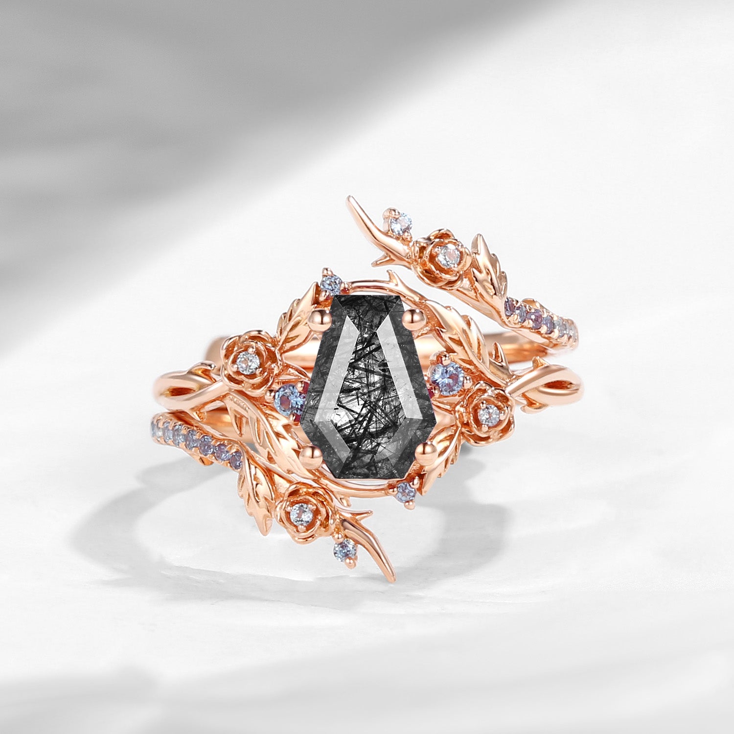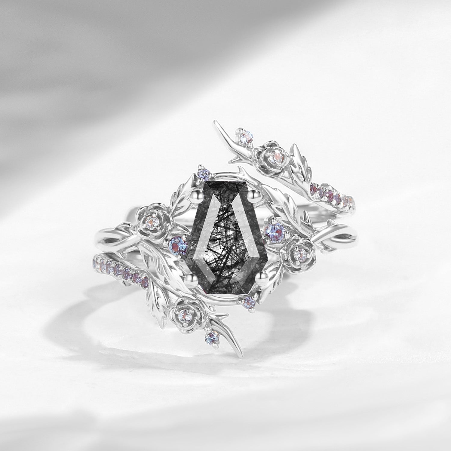 Nature Inspired Twist Coffin Cut Black Rutilated Quartz Engagement Ring Set 2pcs