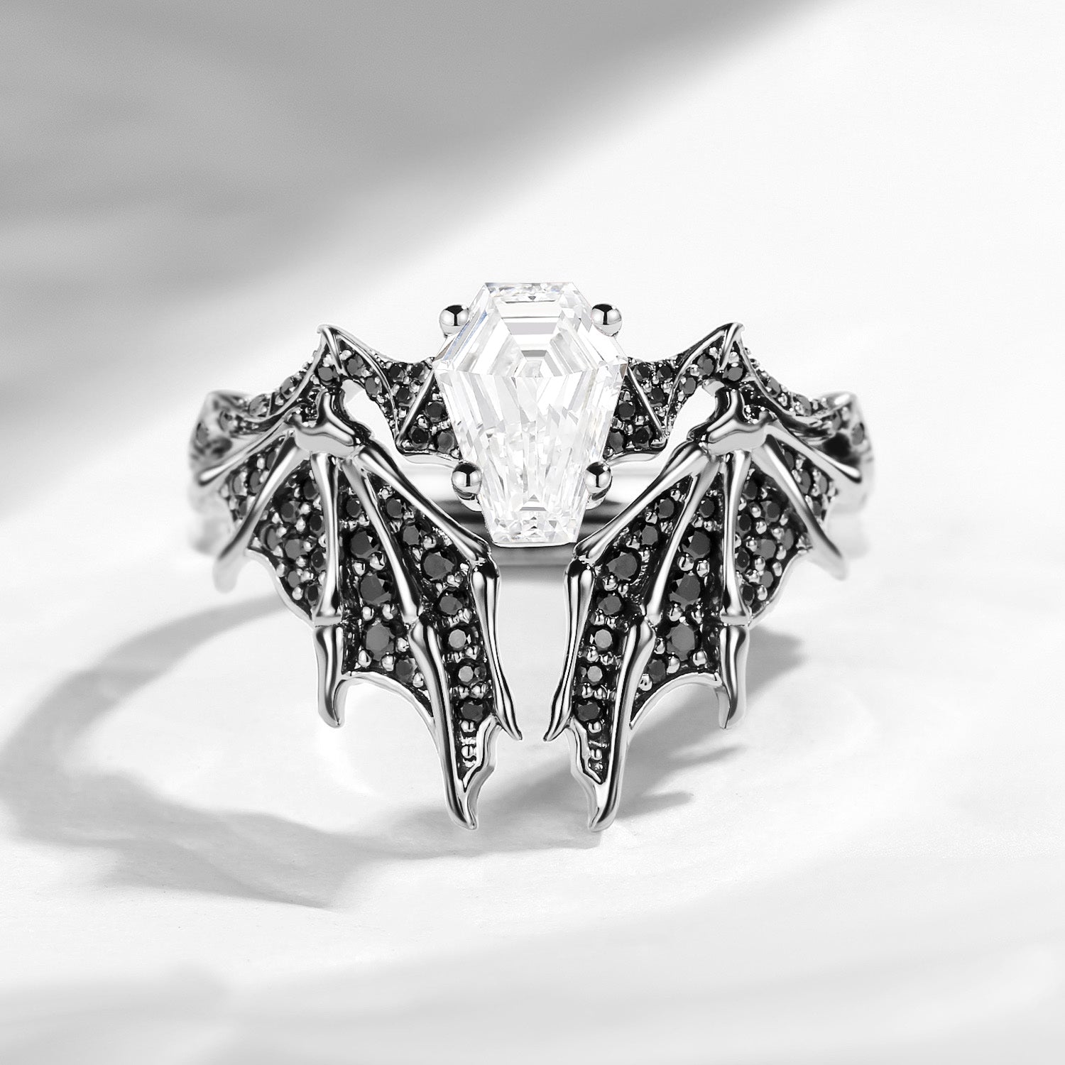 Non-Traditional Coffin Lab Diamond Vampire Ring Black Gold Bridal Set 2pcs - Bat Ring
