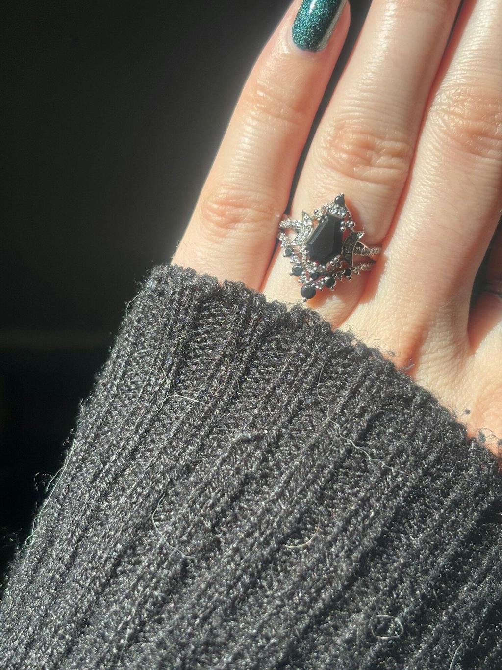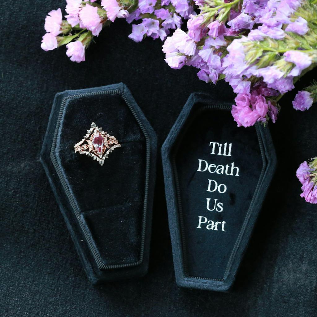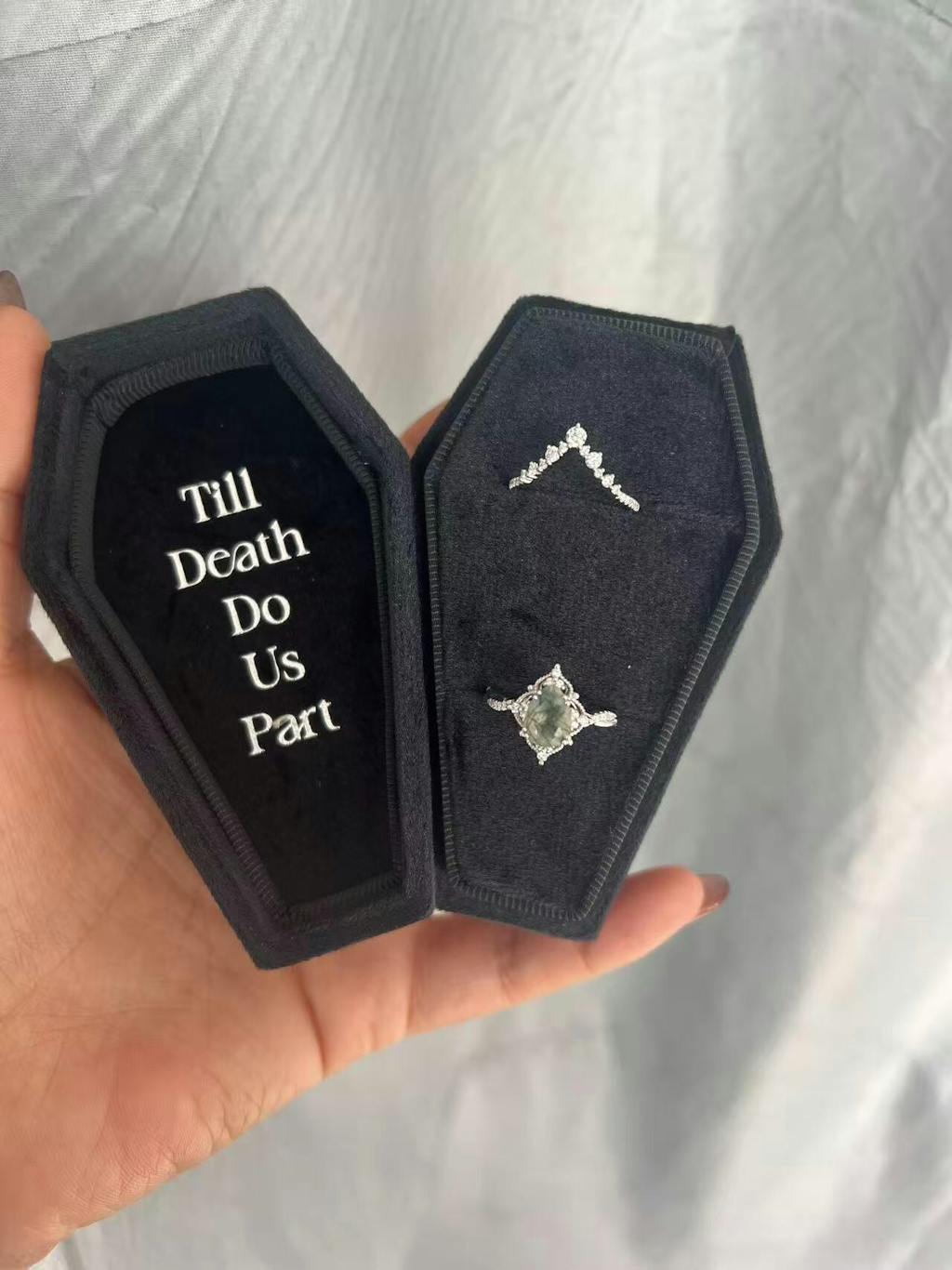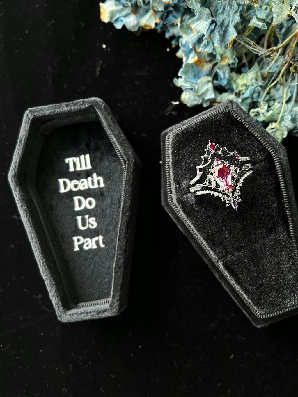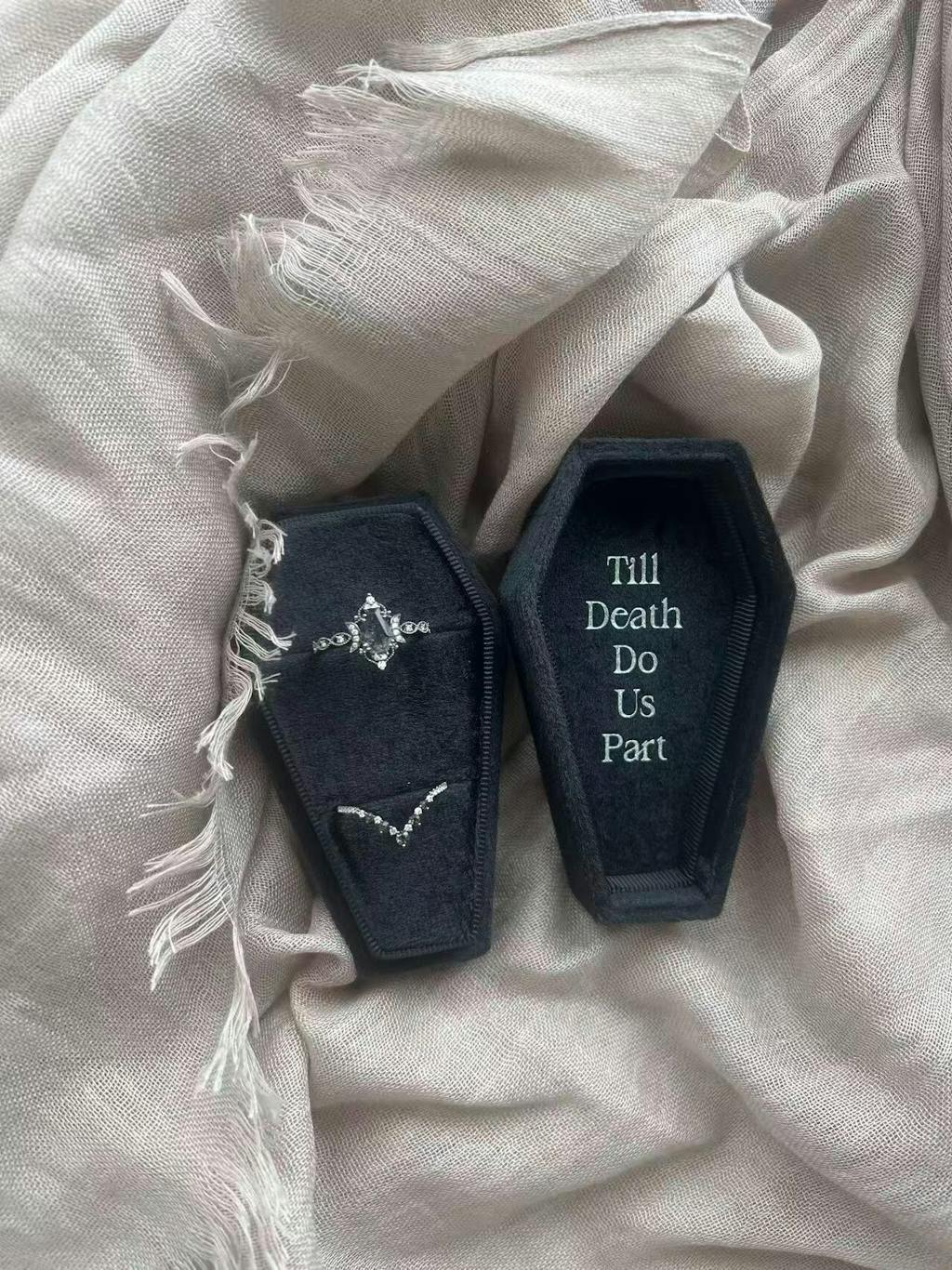 The ring is gorgeous! It also came in a beautiful coffin box. Of course, she said YES! 🖤 My custom ring is also a perfect fit!