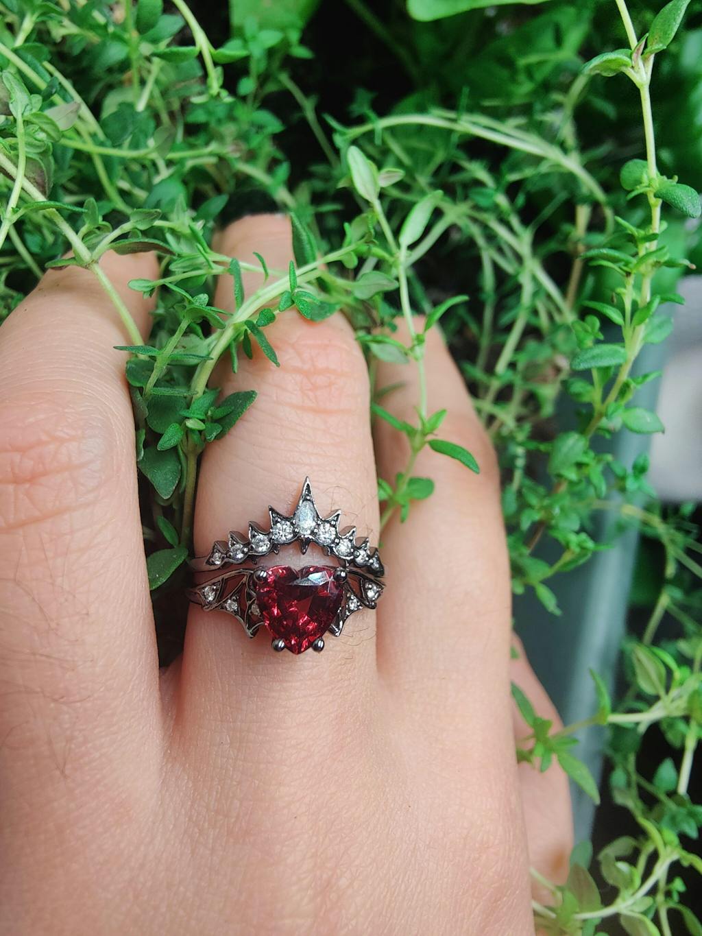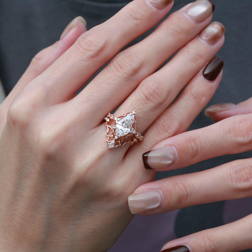 Non-Traditional Coffin Moissanite Vampire Ring Black Gold Bridal Set 2pcs - Bat Ring