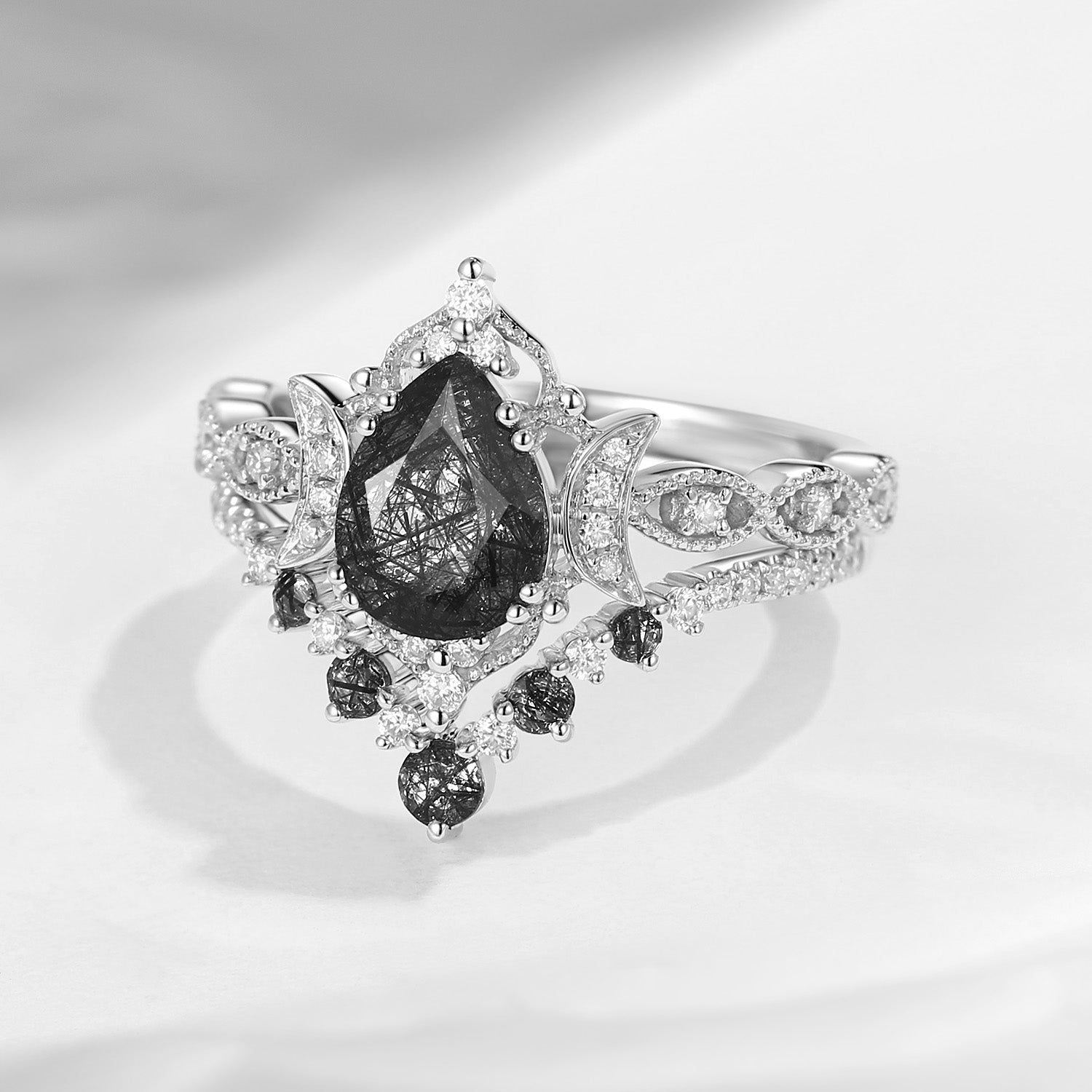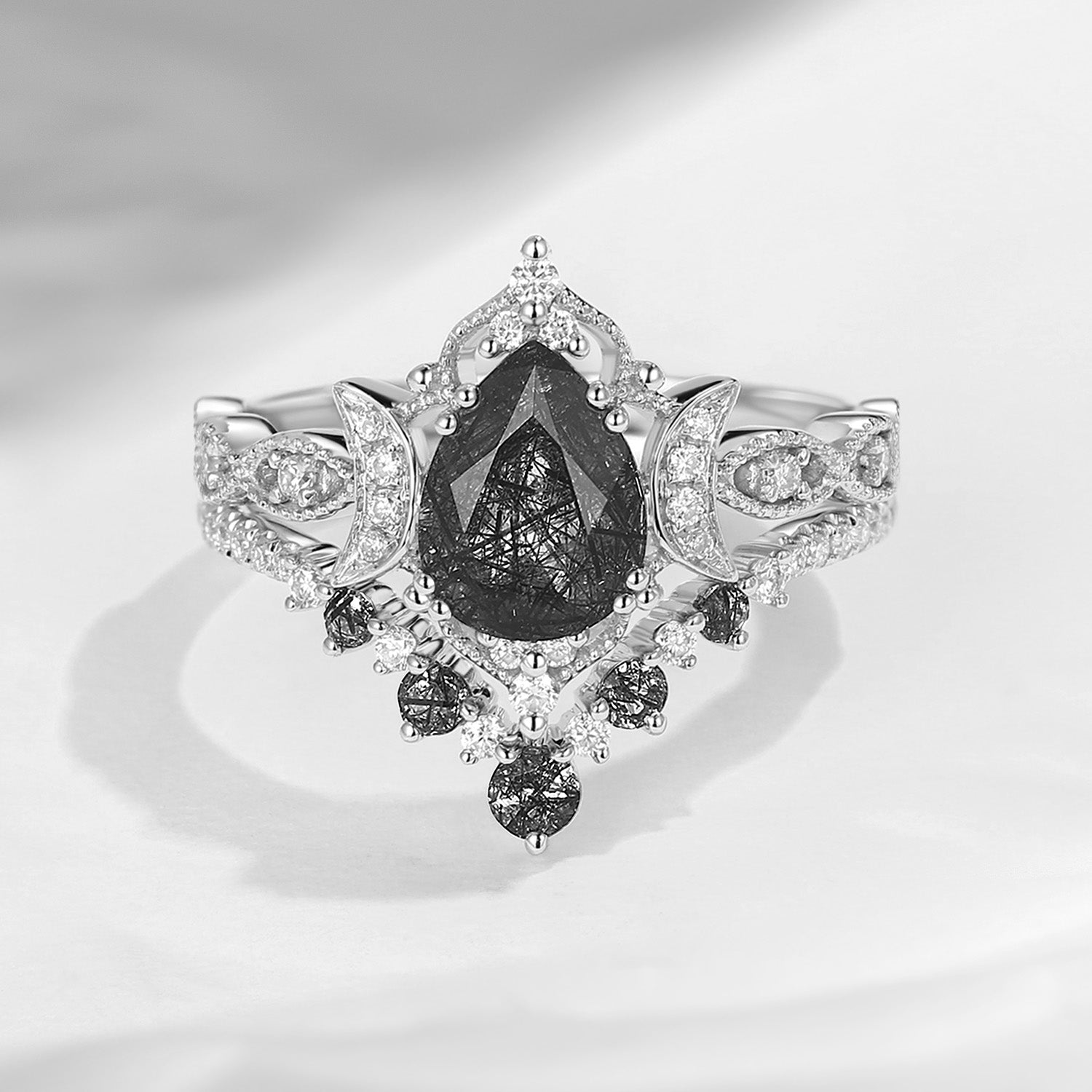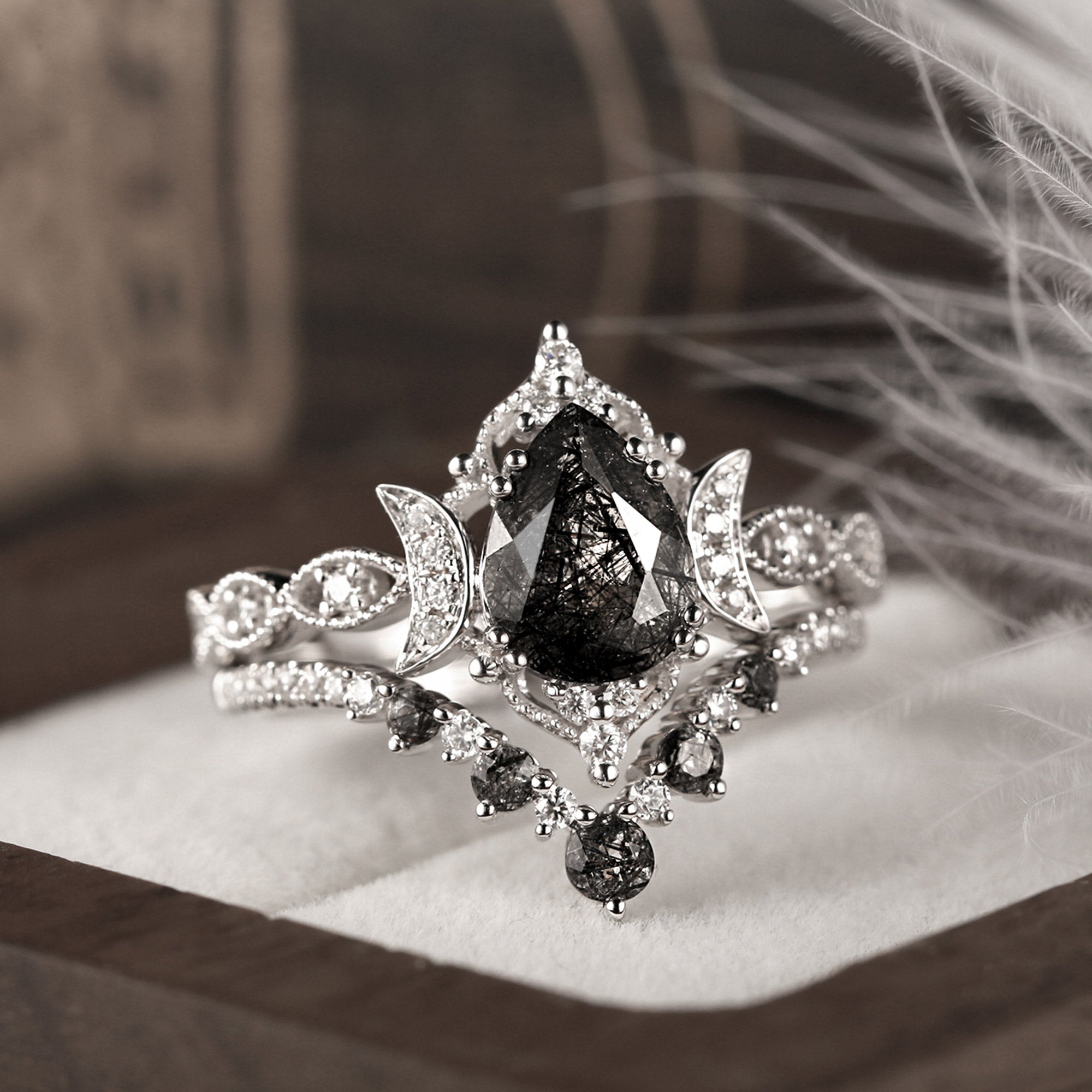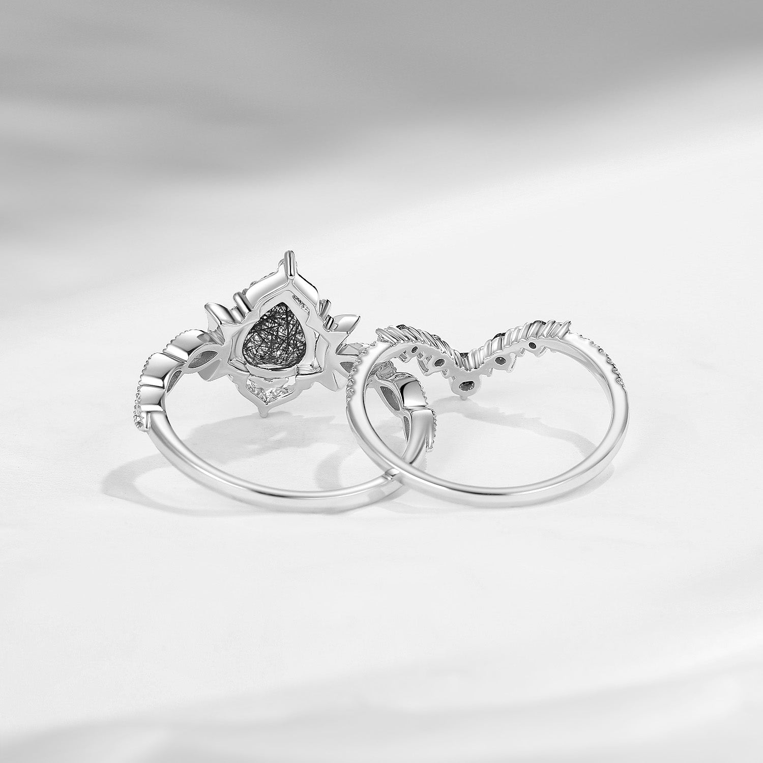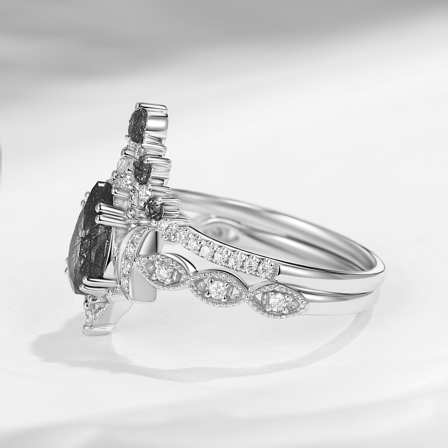 Pear Cut Black Rutilated Quartz Antique Milgrain Engagement Ring 2pcs