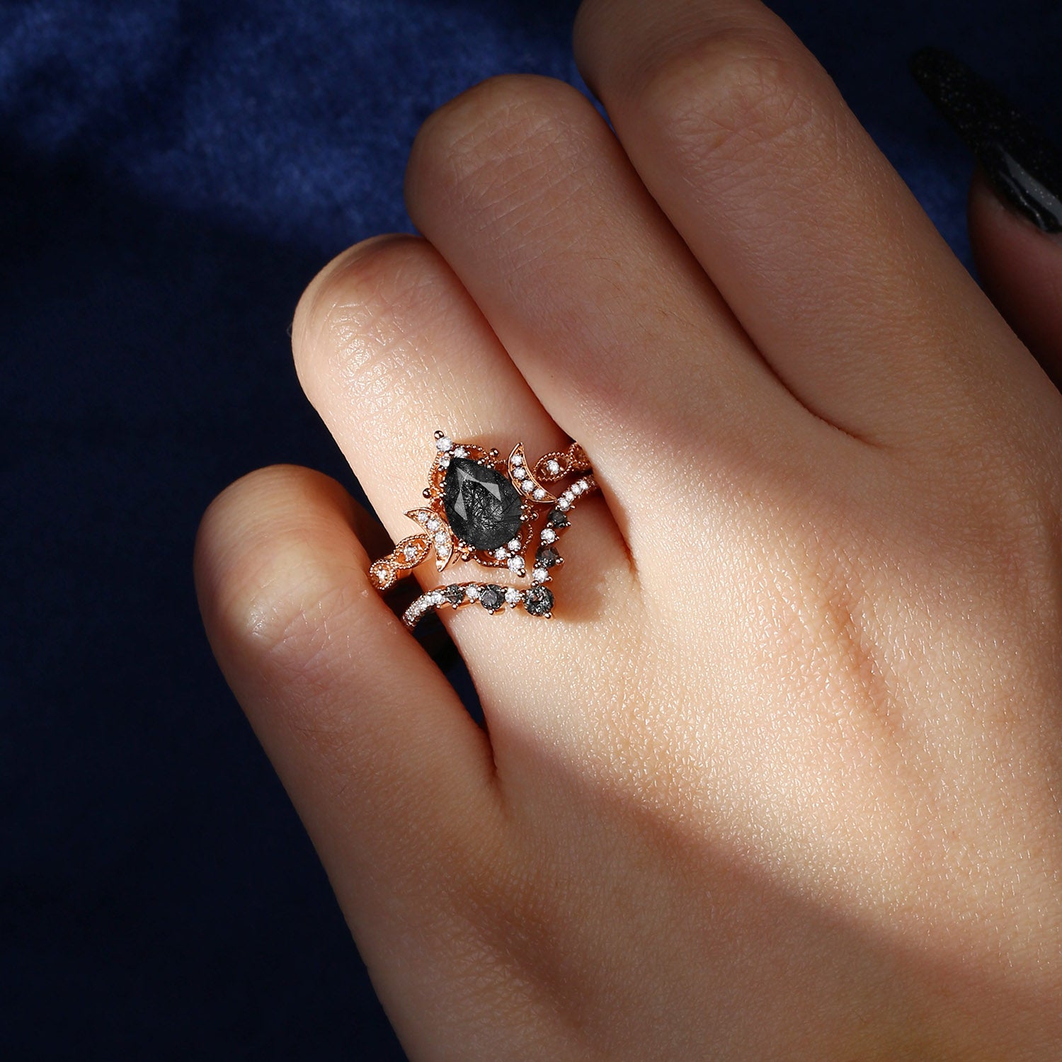 Pear Shaped Black Rutilated Quartz Engagement Ring 2pcs Rose Gold Engagement Ring Antique Stacking Set Chevron Paved Ring Vine Flower Halo