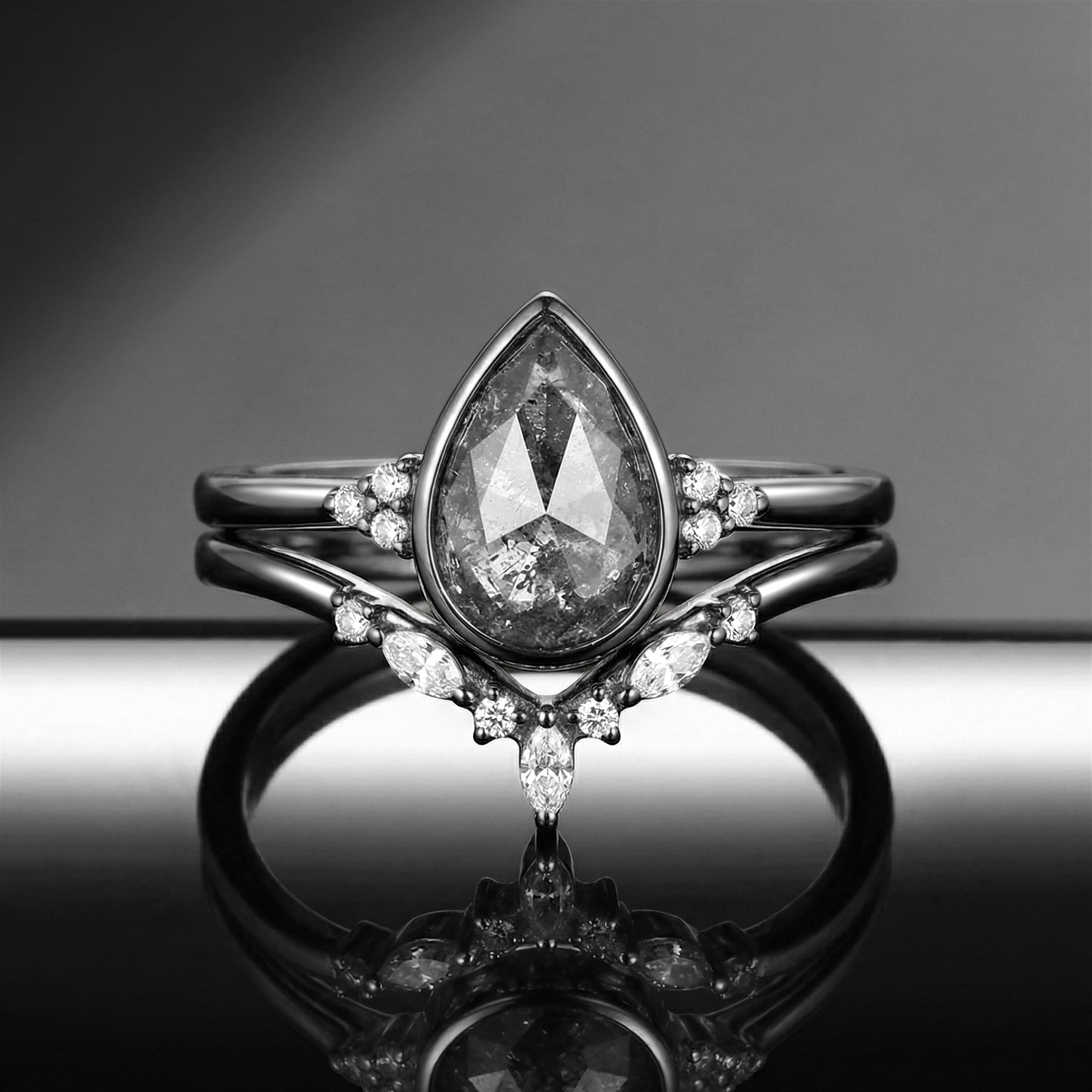 ⟢ Center Stone: Natural Salt and Pepper Diamond, in pear shape