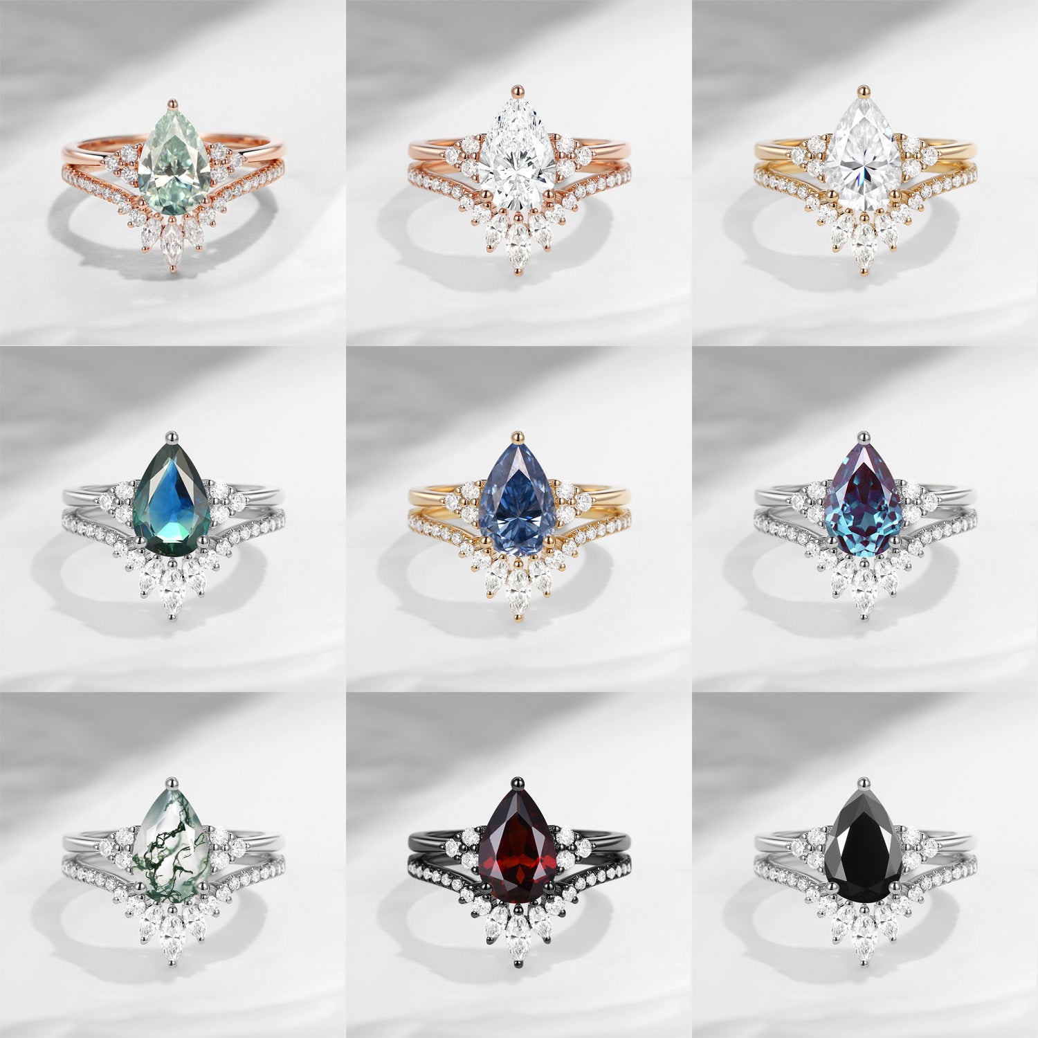 Teal Moissanite Engagement Ring Pear Shaped Bridal Set 2pcs Cluster Wedding Ring Unique Galaxy Anniversary Ring